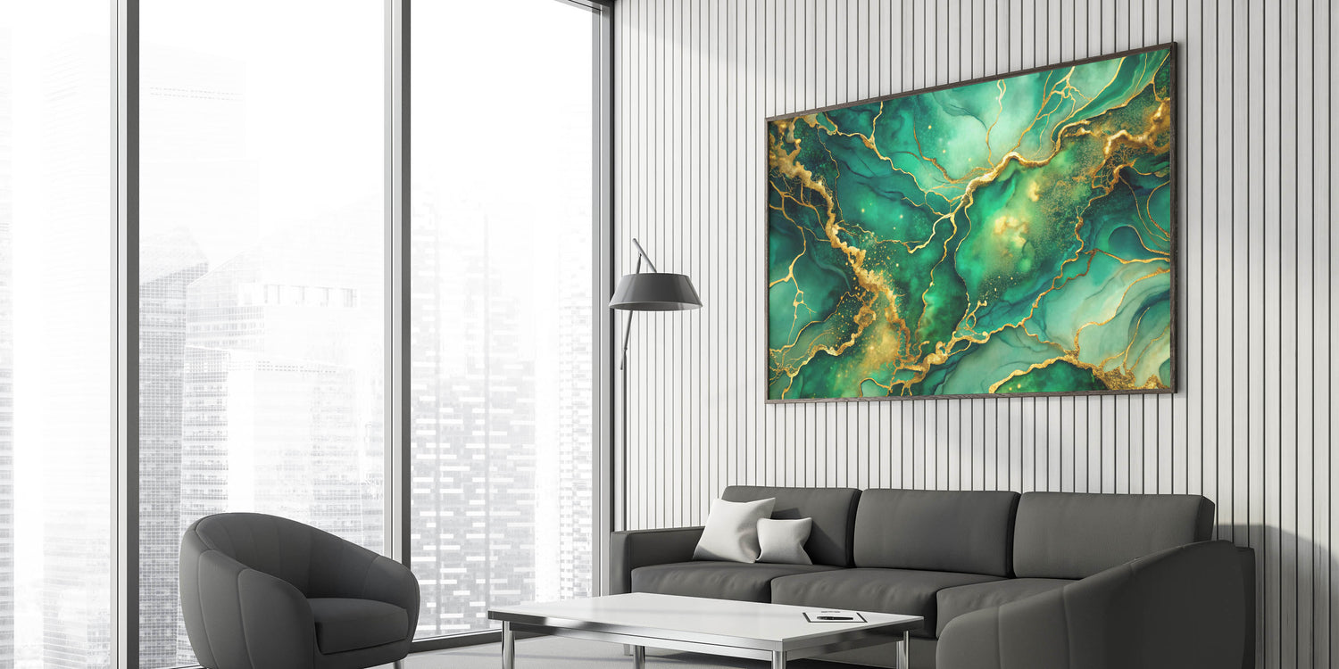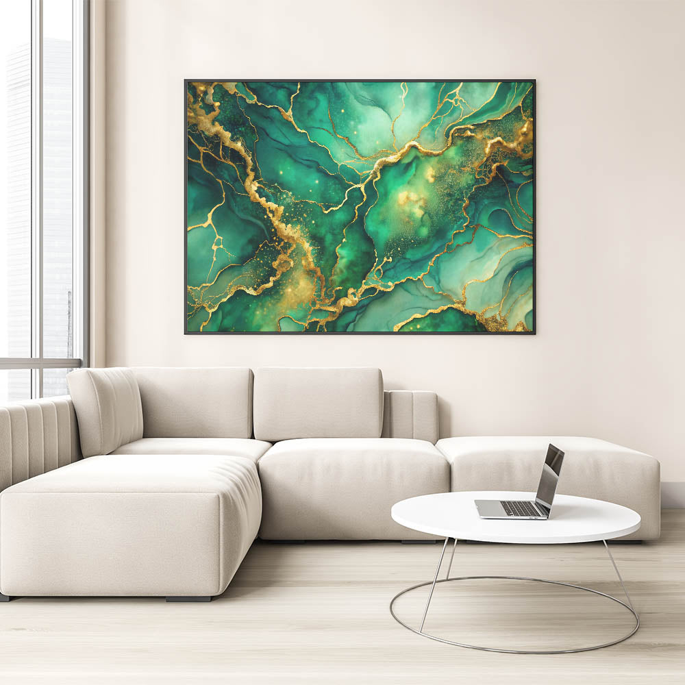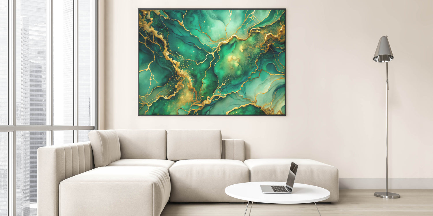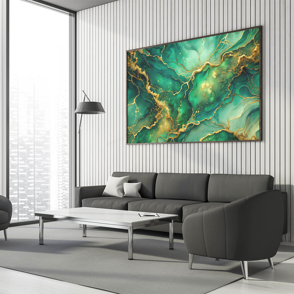 Transform your space with this luxury abstract wall art collection piece, featuring a rich blend of emerald green and shimmering gold. This high-quality abstract canvas print embodies elegance, with its fluid patterns and intricate gold accents creating an exclusive abstract design for modern spaces. The deep green hues symbolize serenity and sophistication, making it a perfect centerpiece for upscale interiors.