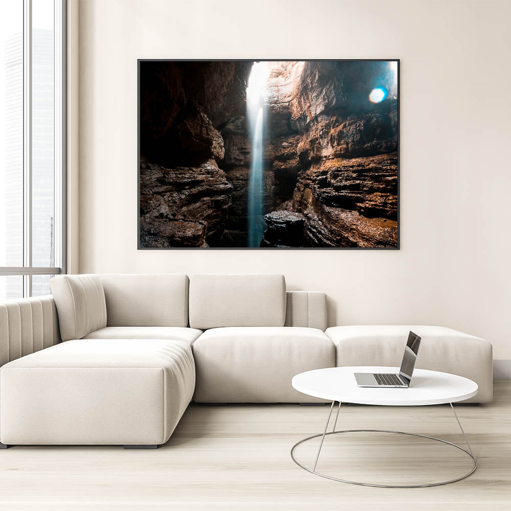 Immerse yourself in the rugged beauty of Alabama's natural wonders with this stunning Alabama wall art. Featuring a breathtaking view of a cascading waterfall deep within a cave, this piece captures the awe-inspiring landscape that makes Alabama nature prints so unique. The play of light and shadow, combined with the raw textures of the cave, creates a sense of adventure and mystery, making this a must-have for any nature lover.