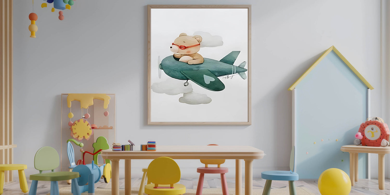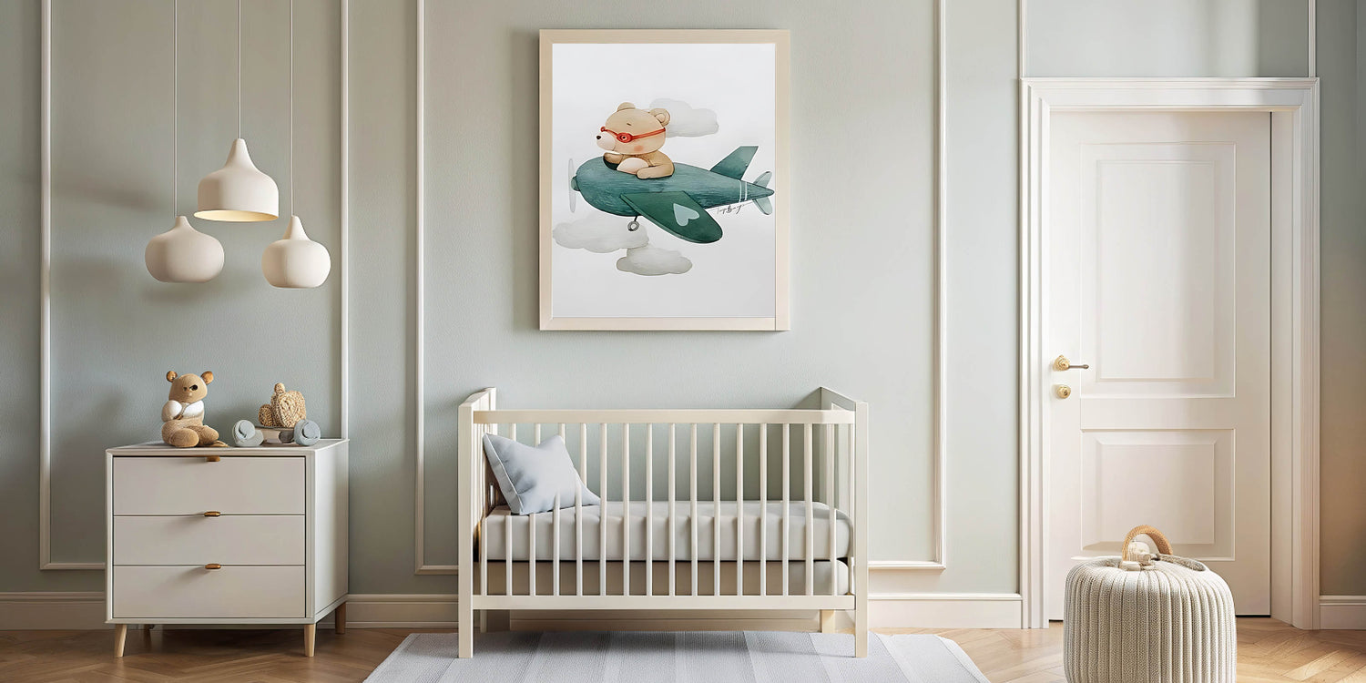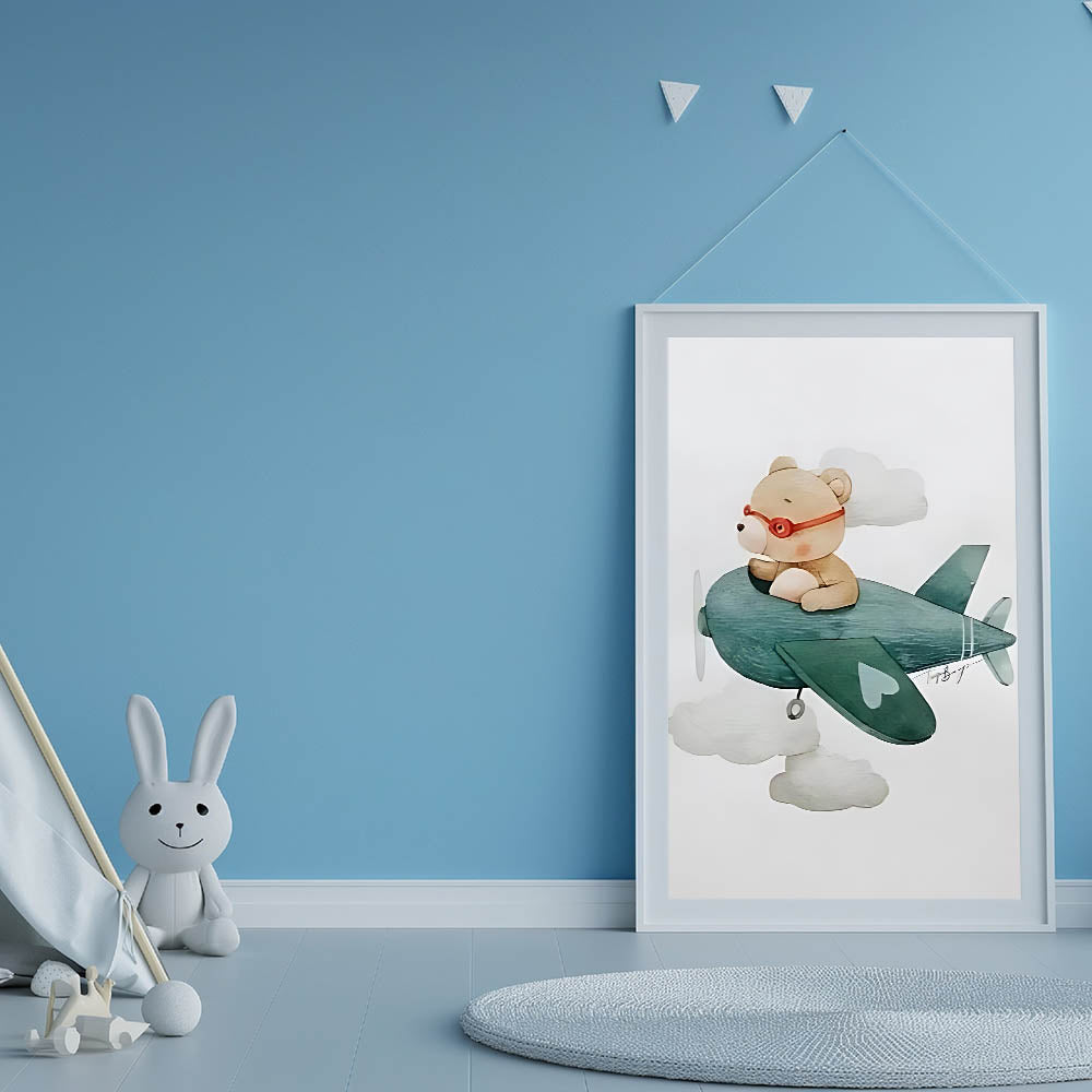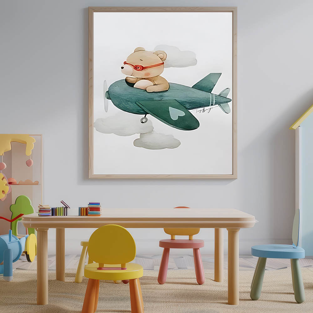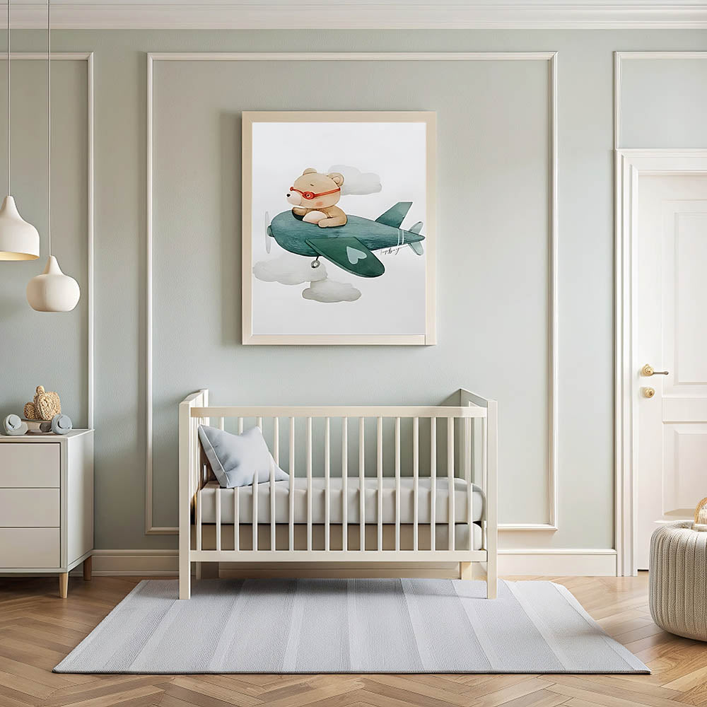 Take your little one on an imaginative adventure with this Teddy Bear Pilot nursery wall art. Featuring an adorable teddy bear wearing red aviator goggles, flying a green vintage airplane among soft clouds, this artwork brings a sense of exploration and fun to any nursery or toddler’s room. The muted green and beige tones blend beautifully with both modern and classic nursery themes, making it a perfect addition to baby room decor, children's wall art, and kids' room art prints.