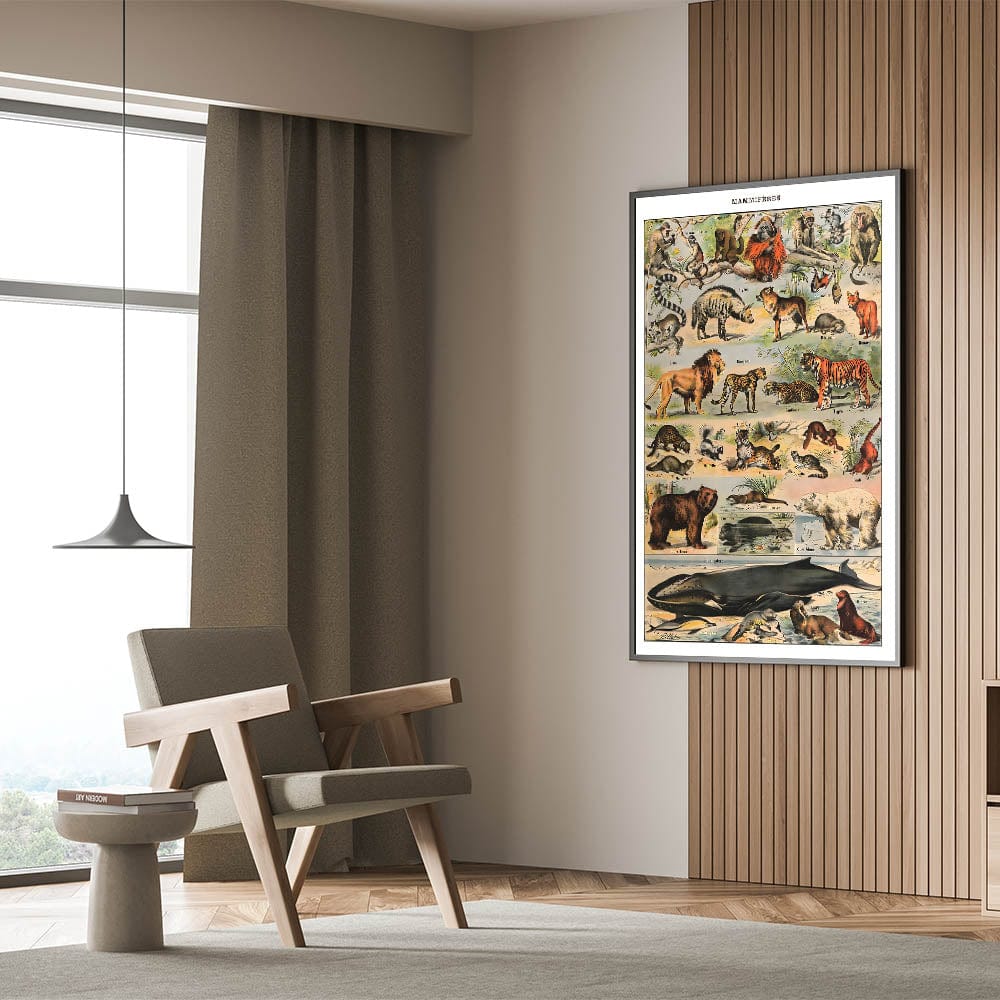 Bring the wild into your home with this stunning Vintage Animal Art print, featuring a beautiful collection of illustrated wildlife. This masterpiece showcases various animals, from fierce lions and tigers to majestic bears and graceful dolphins, all captured in a timeless vintage style. Whether you’re an animal lover or appreciate the artistry of detailed wildlife illustrations, this piece makes a perfect addition to any space. The hand-drawn design is rich in detail, offering a nostalgic, nature-inspired touch to your decor.
