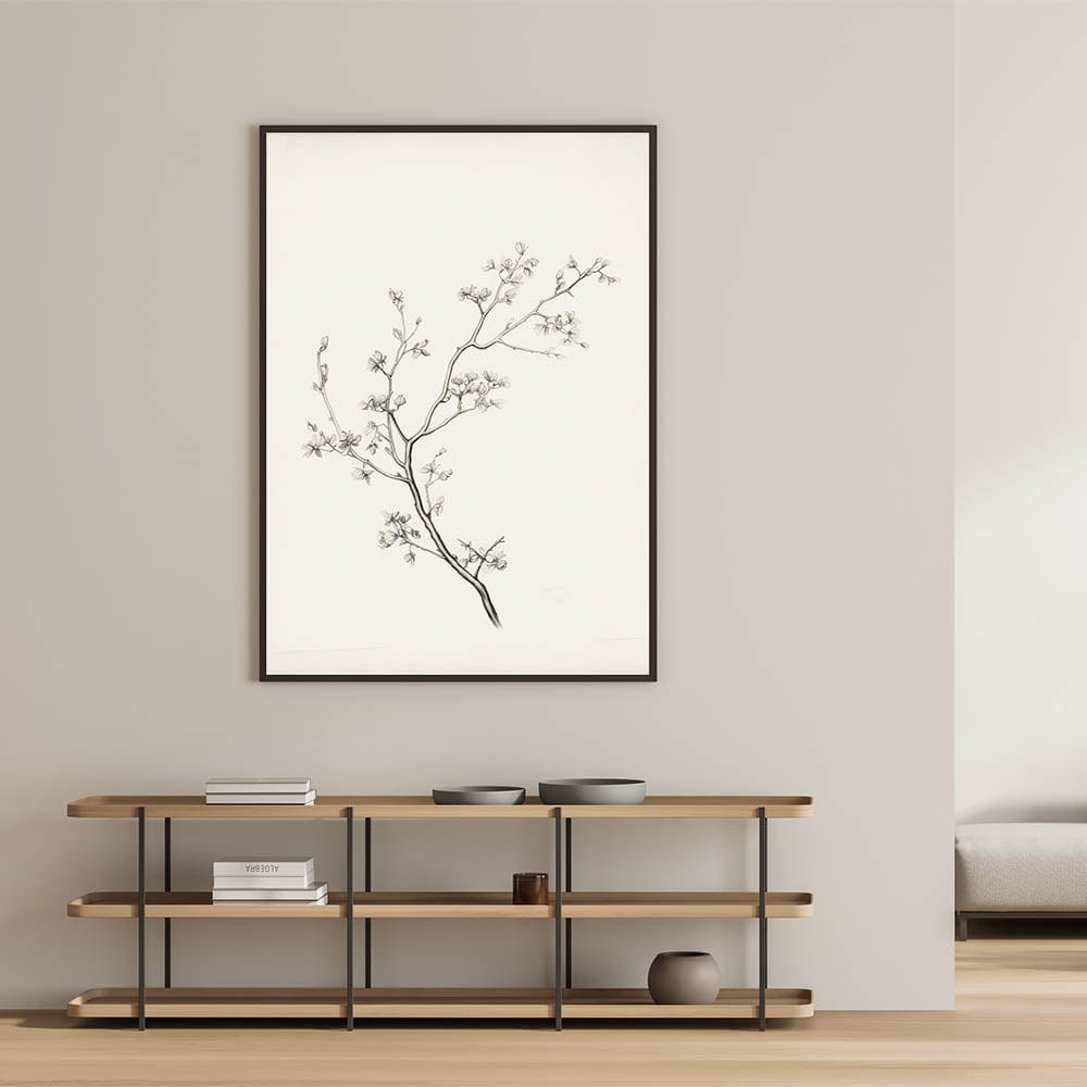 This Vintage Botanical Art Print captures the serene elegance of a blooming branch, delicately illustrated in black and white. The fine details of the branch, with its budding flowers and leaves, create a soft and timeless design that will enhance any room. The monochrome palette brings an element of sophistication, making it a perfect addition to vintage-style or minimalist decor.