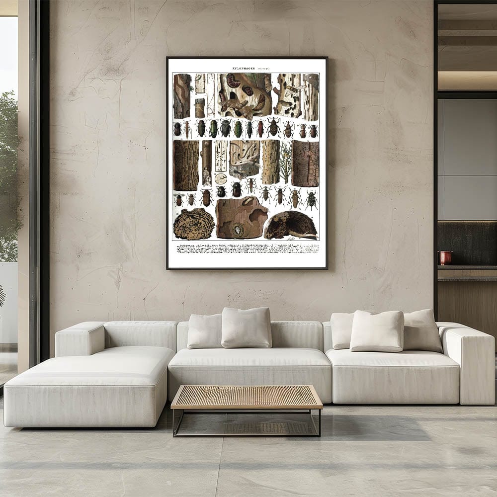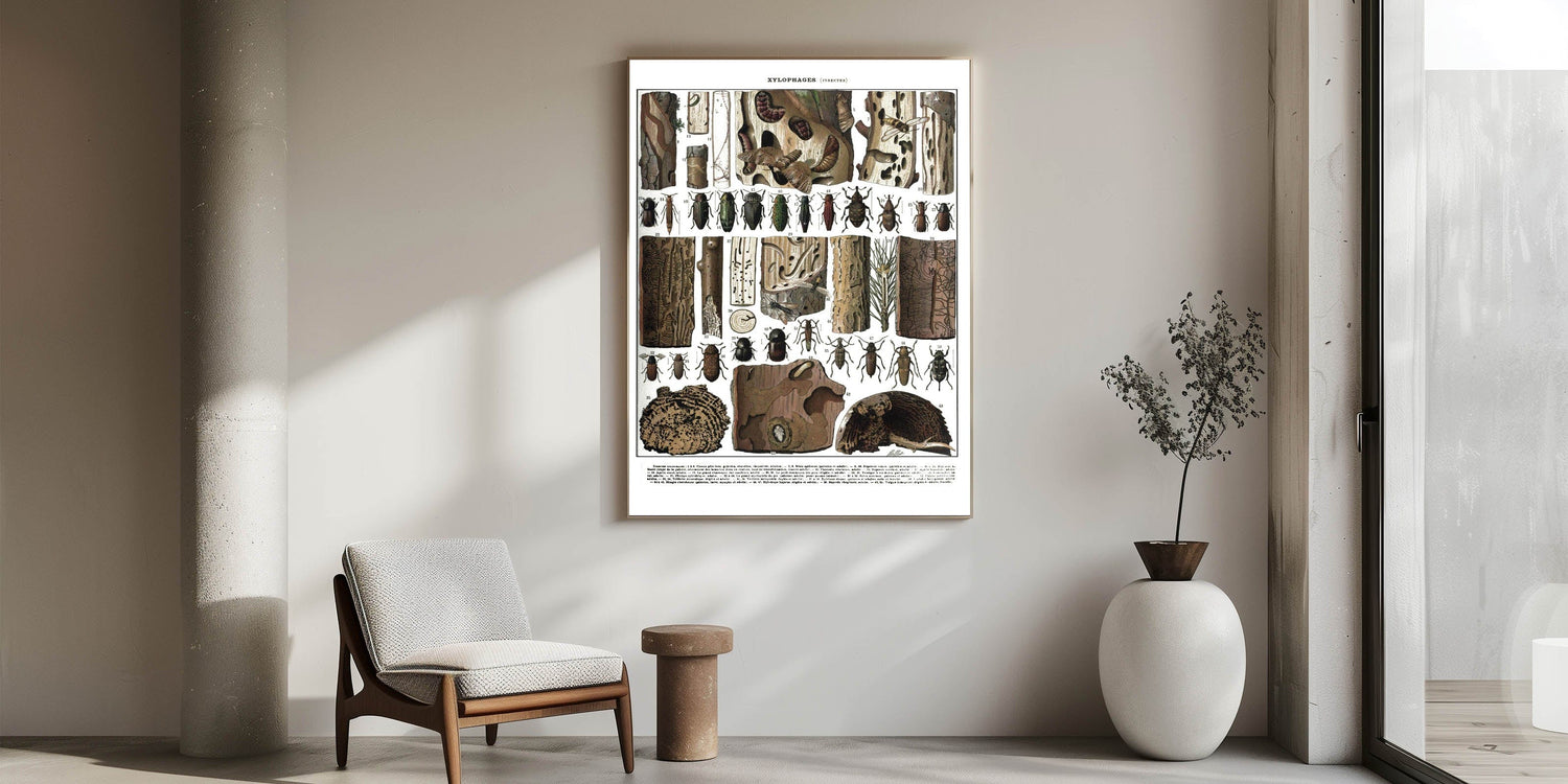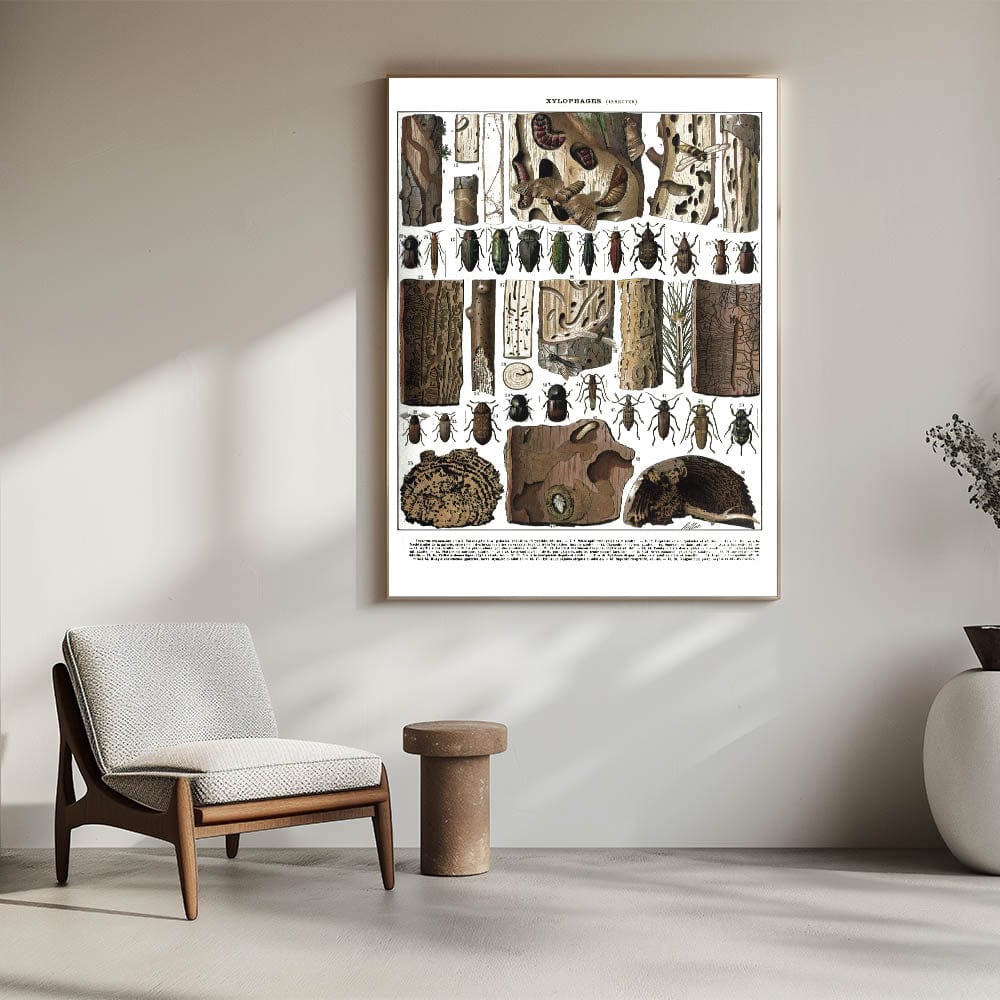 This vintage insect illustration features a captivating collection of xylophages, showcasing various wood-boring insects in exquisite detail. From beetles to moths, each creature is meticulously illustrated, offering a fascinating view of nature's hidden world. The earthy tones and textured illustrations bring a vintage charm to any room, making it a perfect addition for nature lovers, collectors, or anyone who appreciates the intricate beauty of the insect kingdom.