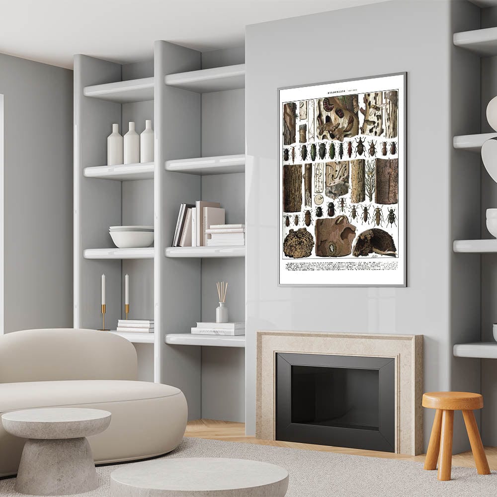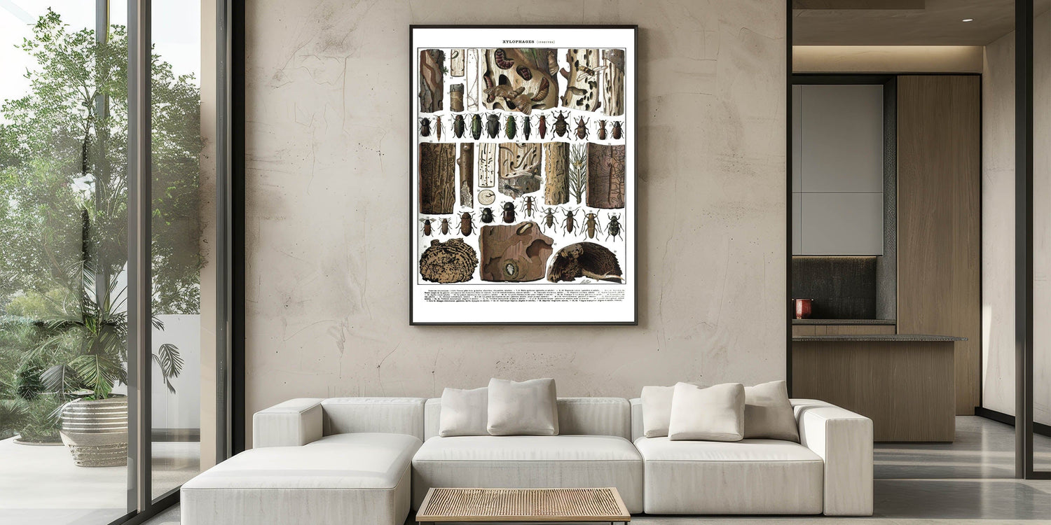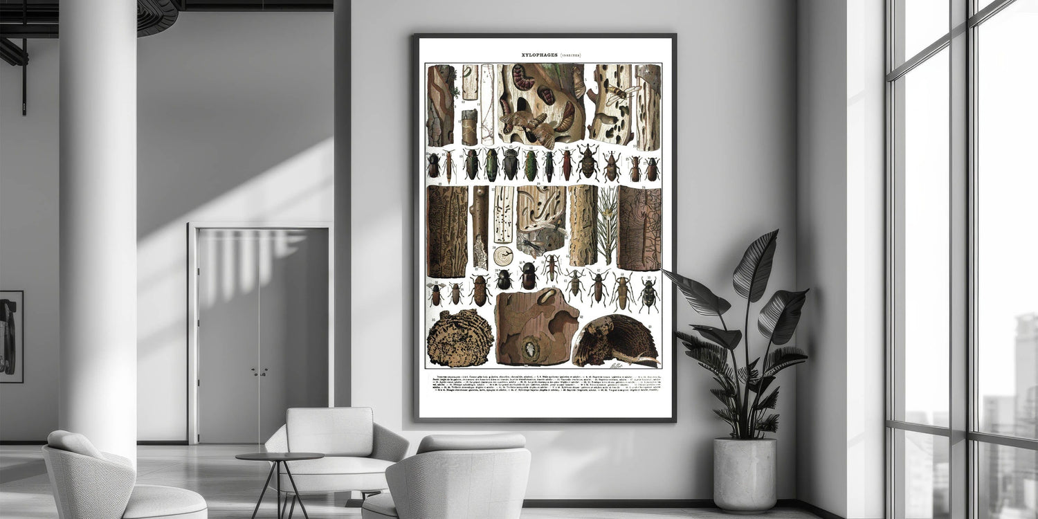 This vintage insect illustration features a captivating collection of xylophages, showcasing various wood-boring insects in exquisite detail. From beetles to moths, each creature is meticulously illustrated, offering a fascinating view of nature's hidden world. The earthy tones and textured illustrations bring a vintage charm to any room, making it a perfect addition for nature lovers, collectors, or anyone who appreciates the intricate beauty of the insect kingdom.
