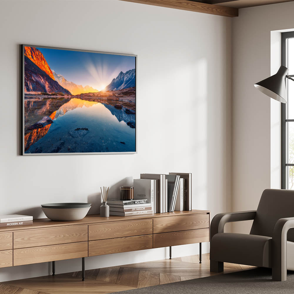 Embrace the awe-inspiring beauty of the Himalayas with this breathtaking sunrise wall art. The image captures the first rays of sunlight illuminating the towering peaks, with the glowing reflection in a still mountain lake creating a perfect mirror of the rugged landscape. The vibrant oranges and yellows of the sunlight blend harmoniously with the deep blues of the sky and the water, making this piece a captivating addition to any room. Ideal for nature lovers and those looking to bring the peaceful beauty of the Himalayas into their living spaces.