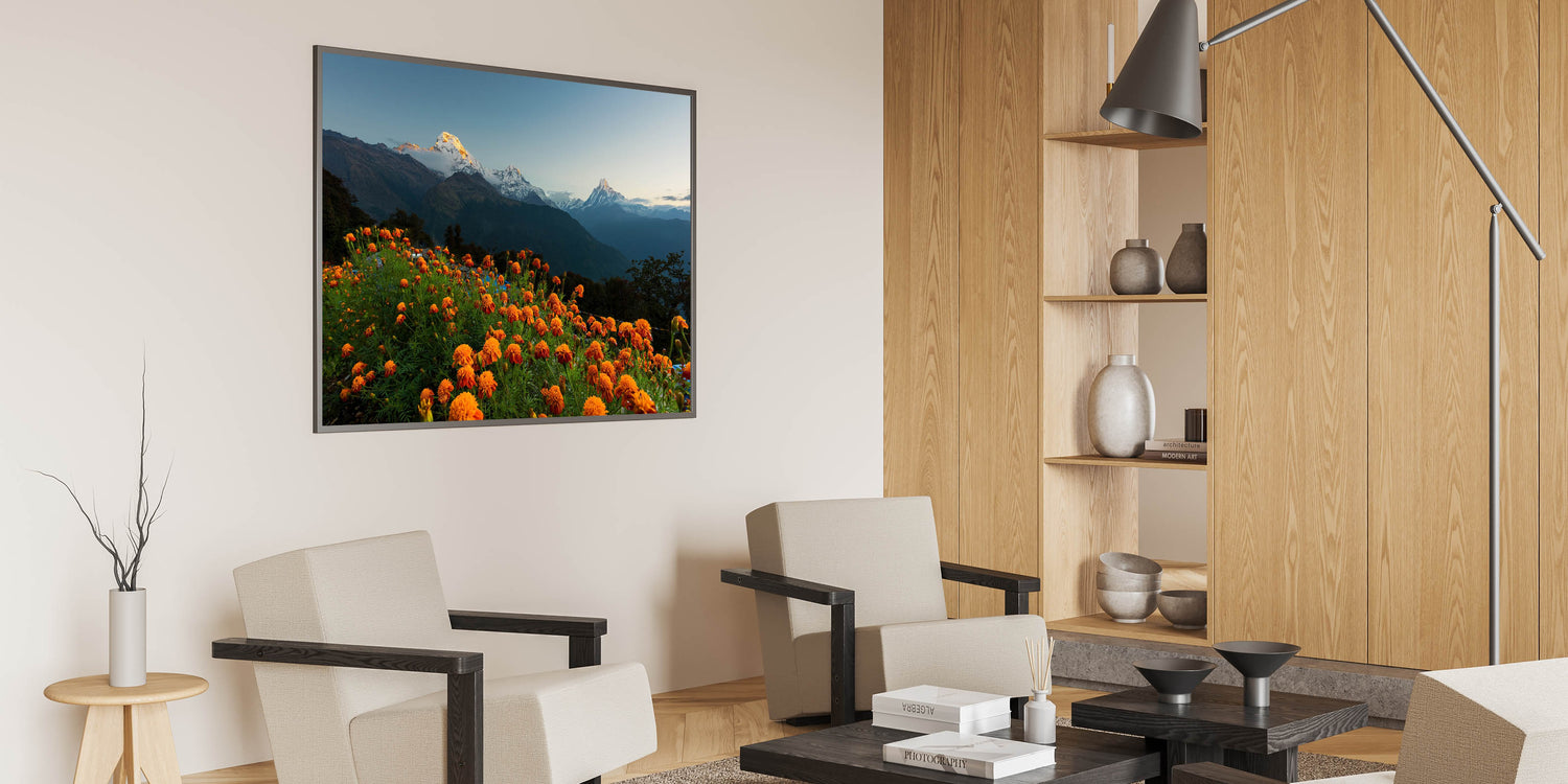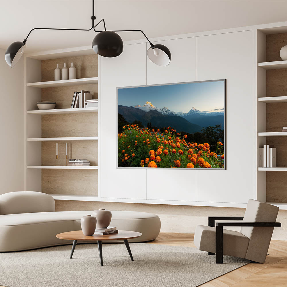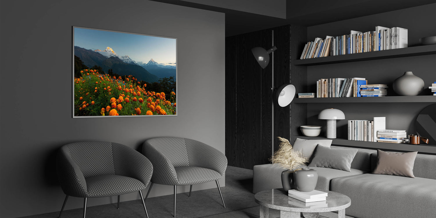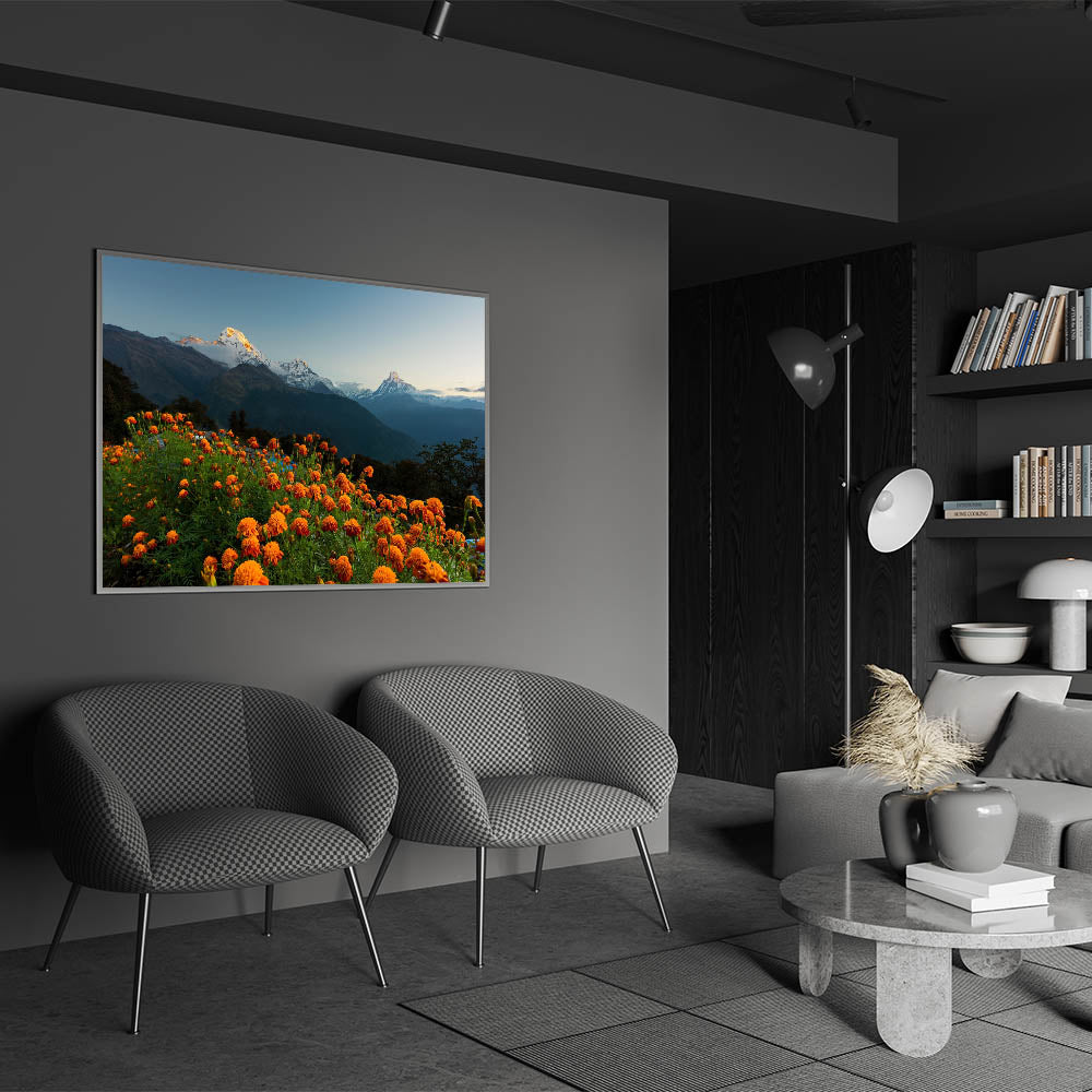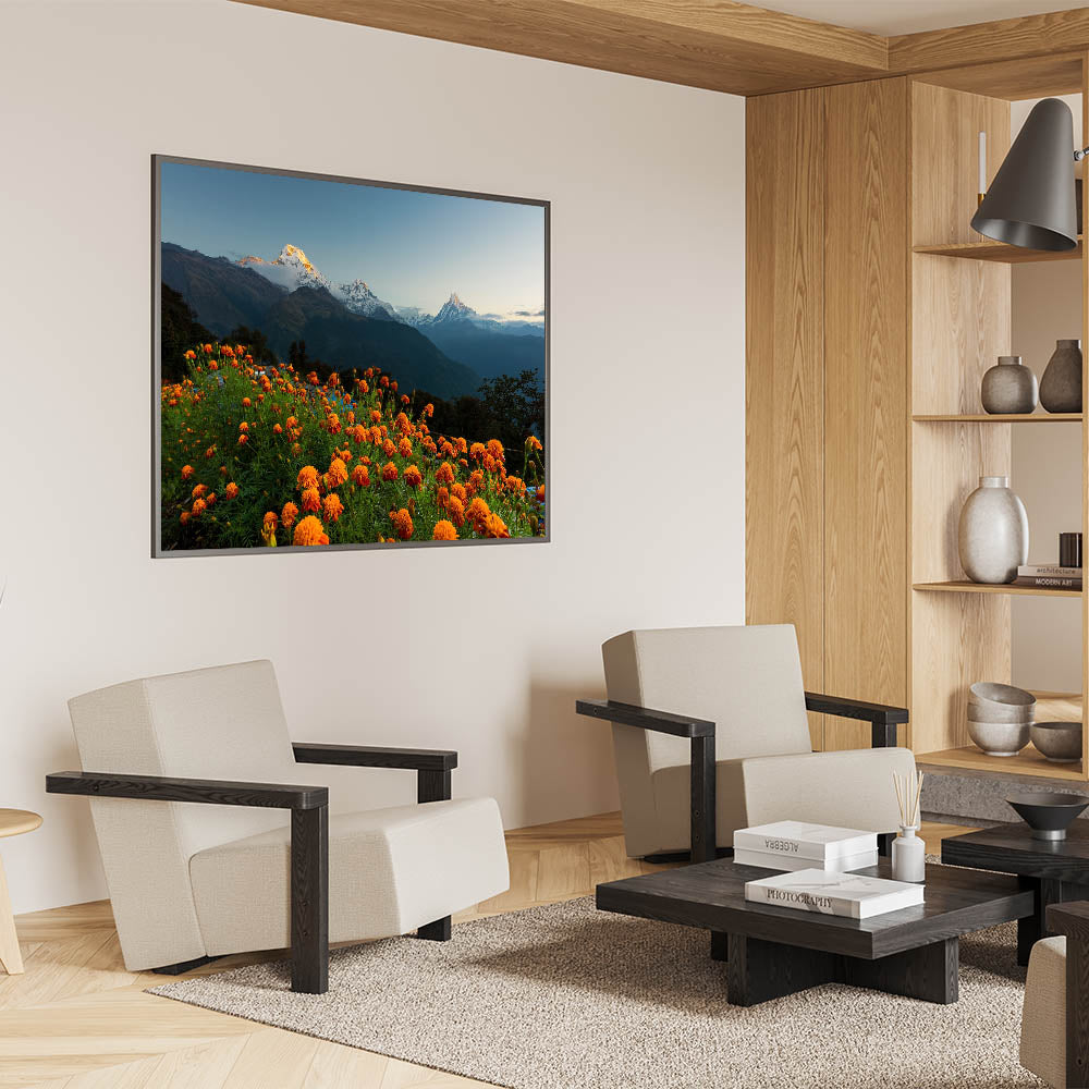 Immerse yourself in the vibrant beauty of Nepal’s landscapes with this striking wall art. The design features a field of brilliant orange marigold flowers in the foreground, set against the awe-inspiring backdrop of the snow-capped Himalayan peaks. This piece captures the rich contrast between the lively blooms and the towering mountains, creating a perfect blend of color and natural grandeur. Ideal for nature lovers and those who cherish traditional Nepali scenes, this artwork brings the vivid beauty of Nepal into any room.