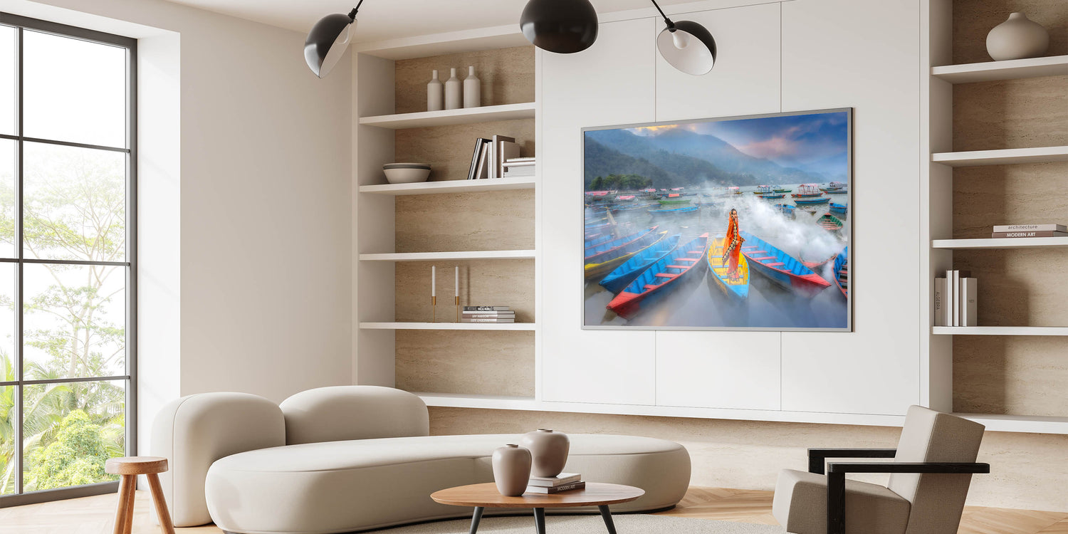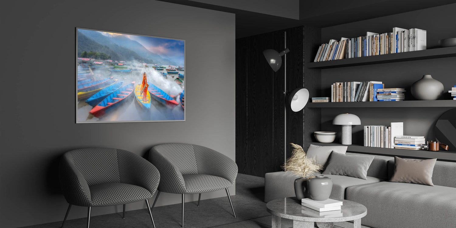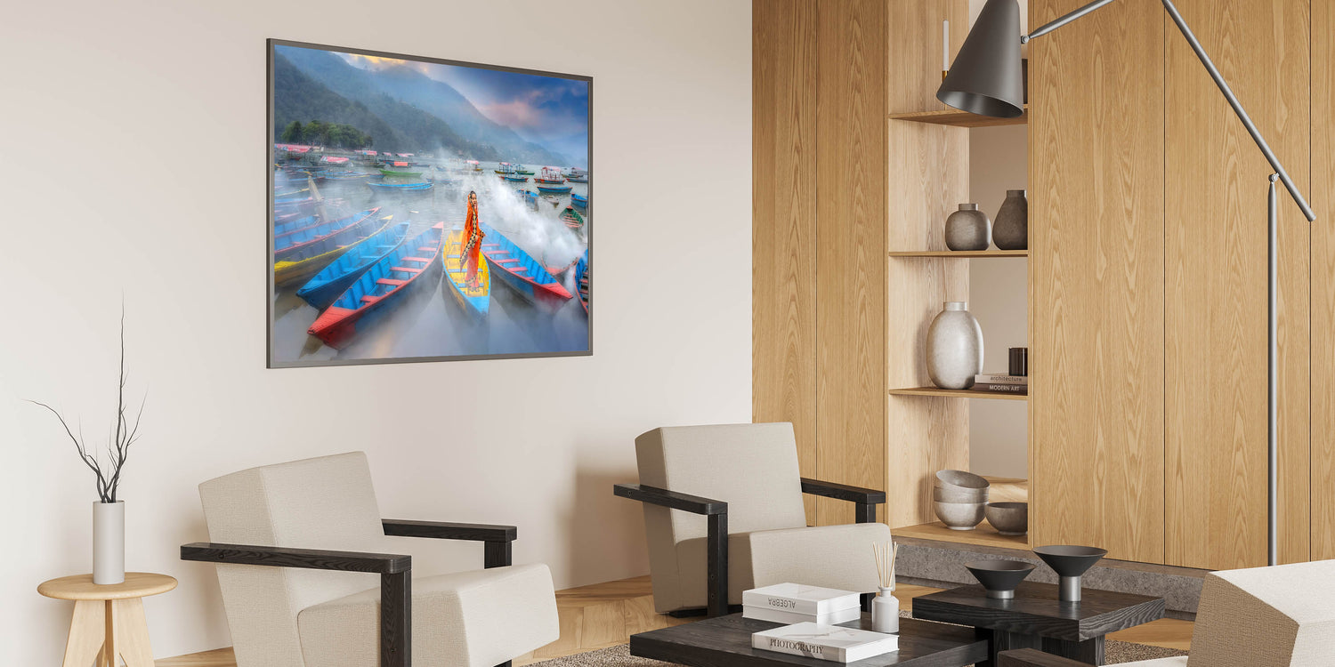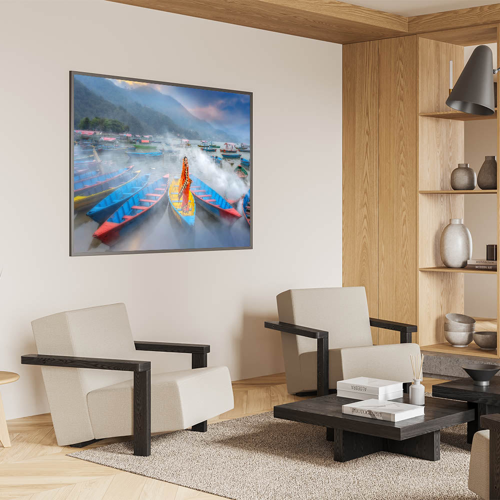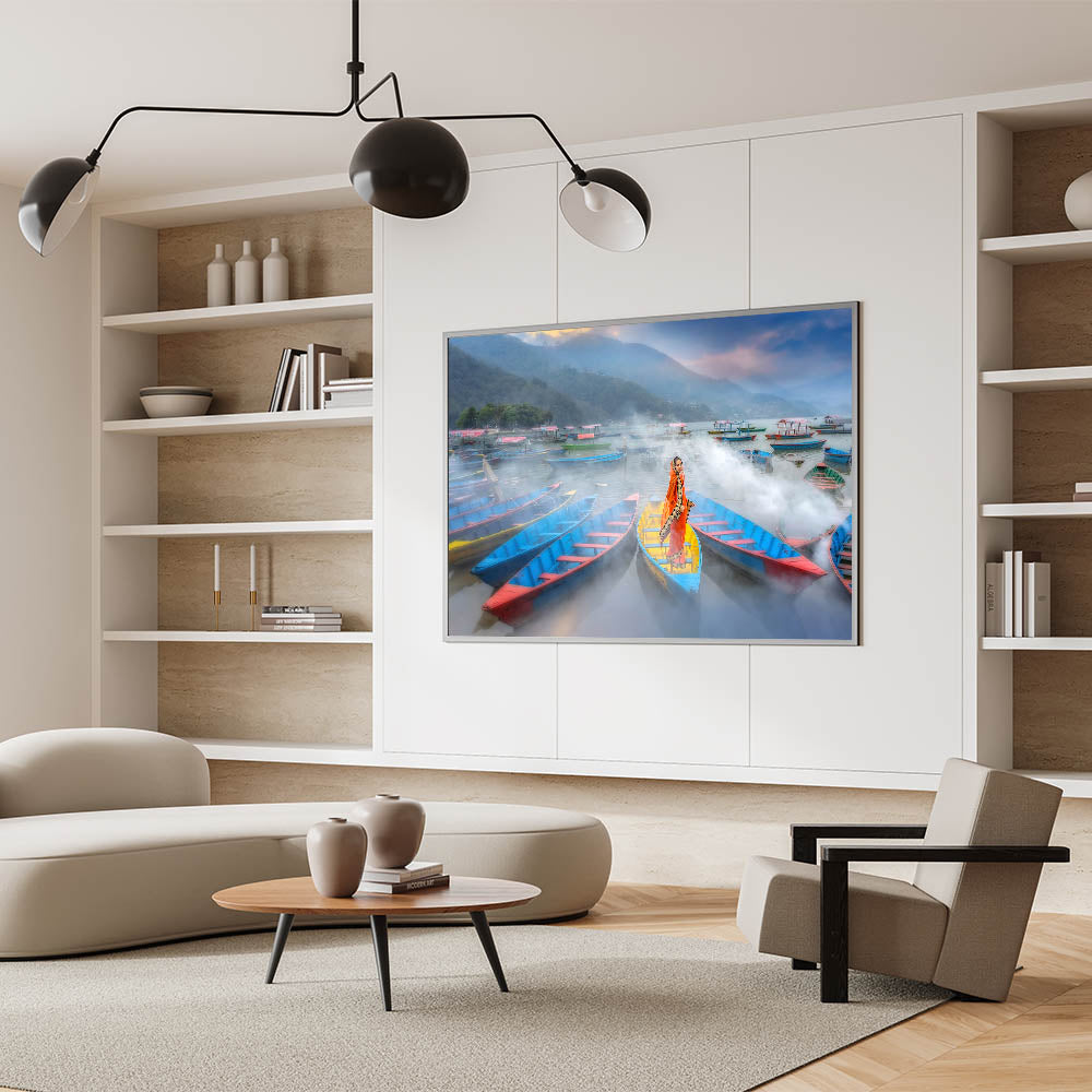 This mesmerizing artwork captures a serene moment on a misty lake in Nepal, where a traditionally dressed woman stands gracefully in a brightly colored boat. The vibrant hues of the boats contrast beautifully against the soft mist, creating a captivating blend of tradition and natural beauty. The surrounding boats and misty hills in the distance further enhance the peaceful and dreamlike quality of the scene. This piece is perfect for adding a splash of color and cultural depth to any space.
