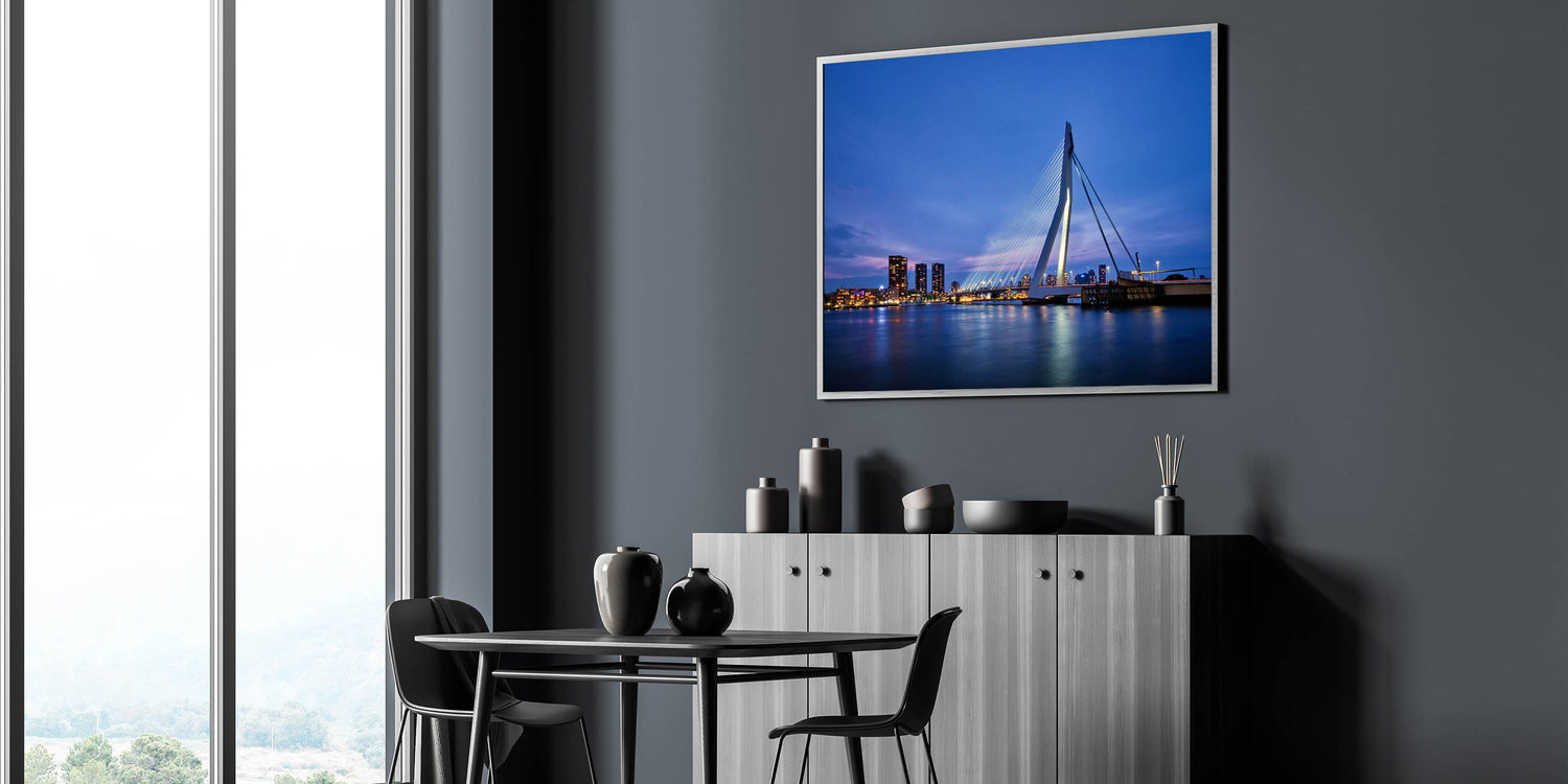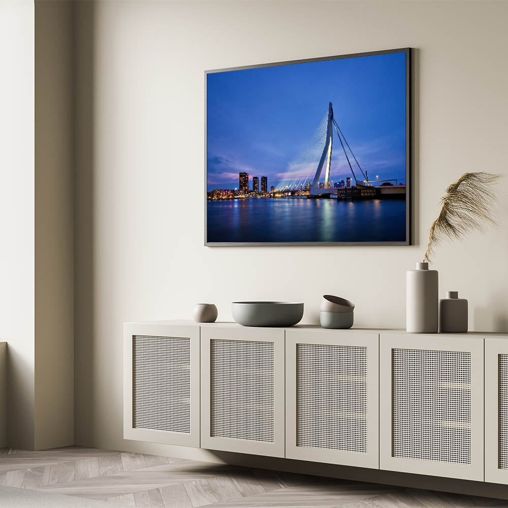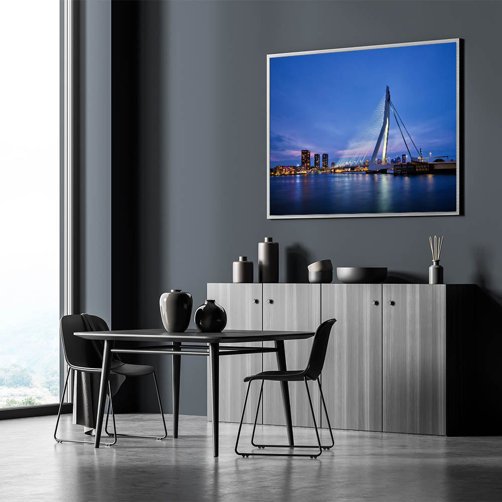 Capture the modern beauty of Rotterdam with this stunning wall art showcasing the iconic Erasmus Bridge lit up against the evening sky. The peaceful reflection of the city lights on the water creates a serene and captivating view of the Netherlands' second-largest city. Perfect for those who admire modern architecture and cityscapes, this artwork will bring a contemporary touch to any space.