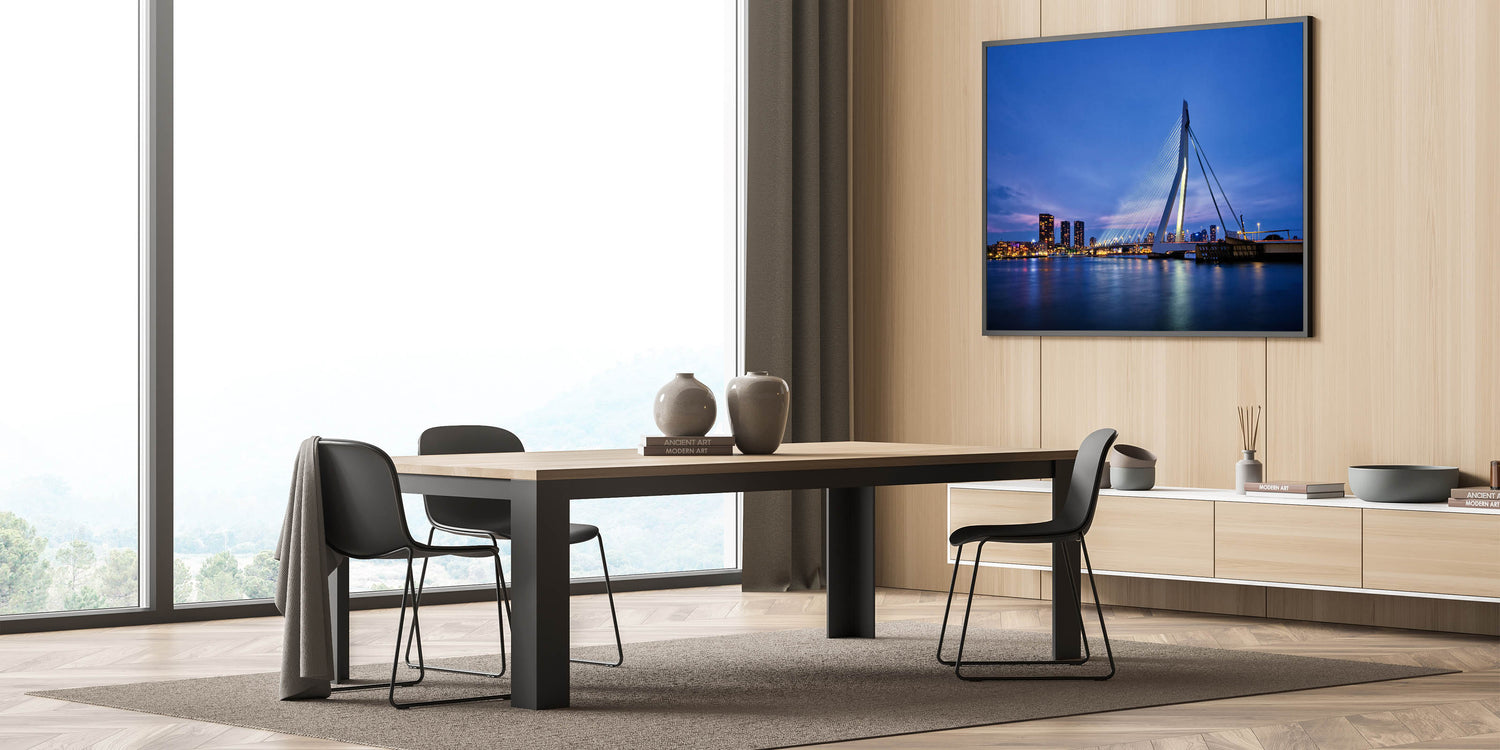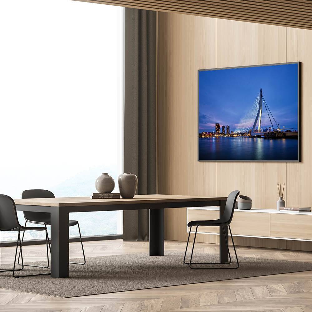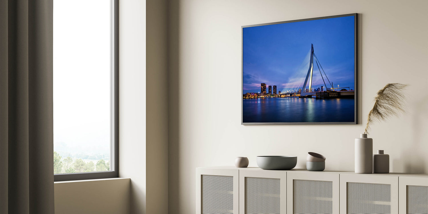 Capture the modern beauty of Rotterdam with this stunning wall art showcasing the iconic Erasmus Bridge lit up against the evening sky. The peaceful reflection of the city lights on the water creates a serene and captivating view of the Netherlands' second-largest city. Perfect for those who admire modern architecture and cityscapes, this artwork will bring a contemporary touch to any space.