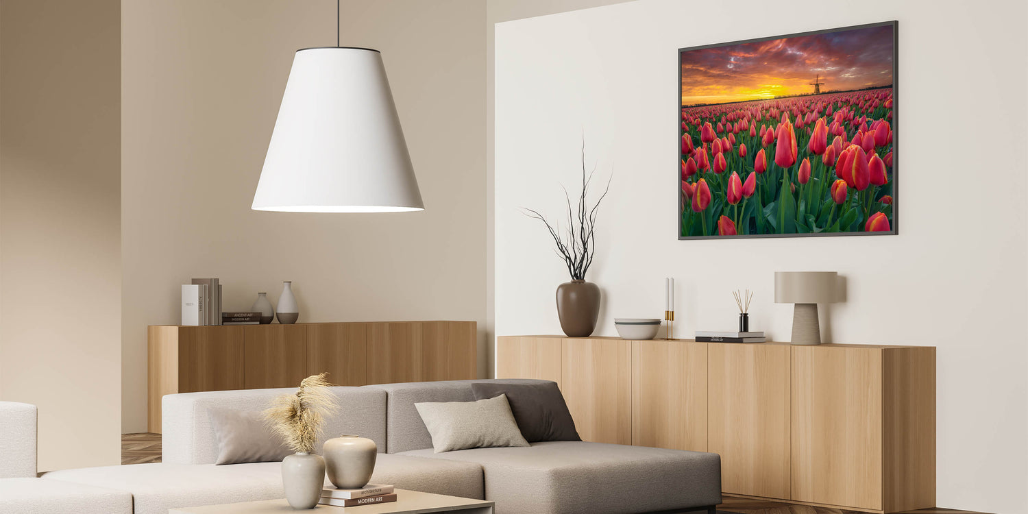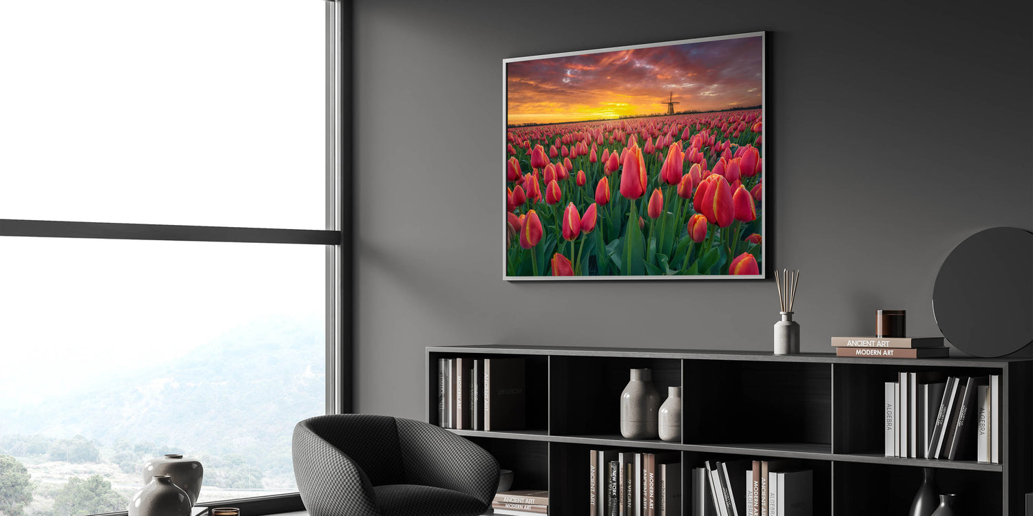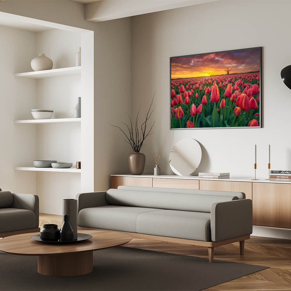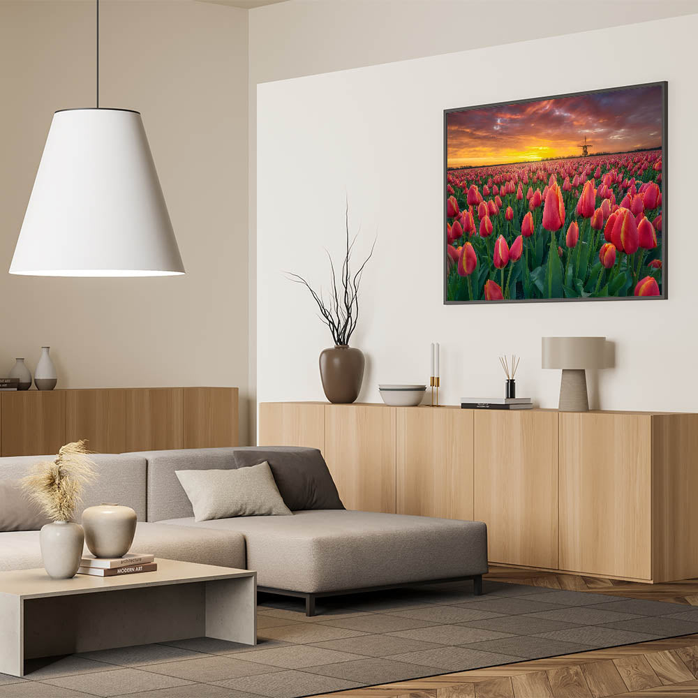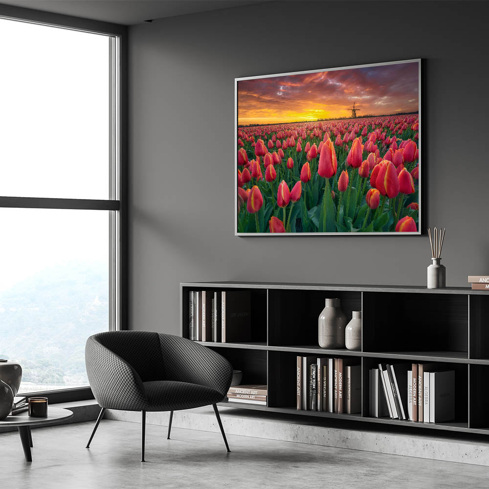 Bask in the beauty of a glowing sunset over vast tulip fields with this stunning wall art. The brilliant red tulips stretch endlessly across the landscape, with the setting sun casting warm hues of orange and gold. In the distance, a traditional windmill completes the perfect Dutch scenery, making this artwork an ideal piece for lovers of nature and Dutch charm.