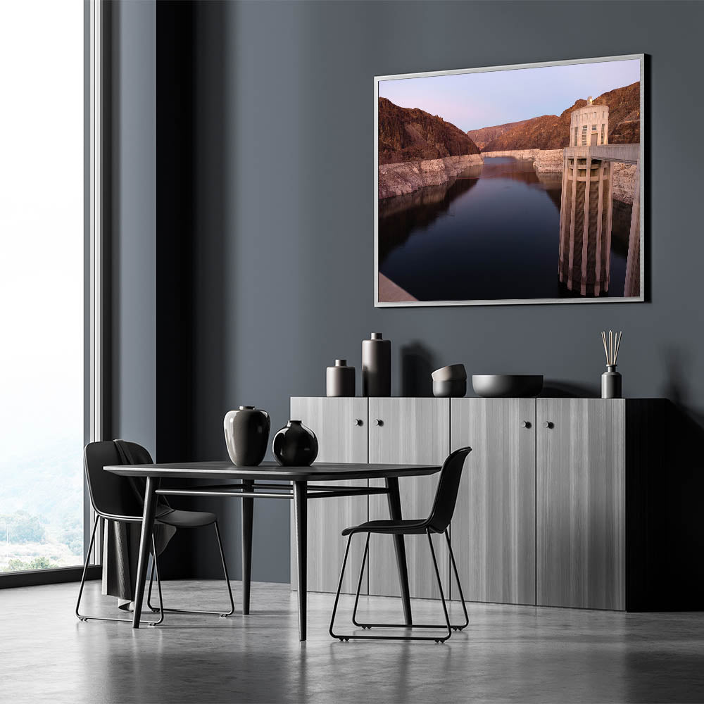 Capture the breathtaking beauty of the iconic Hoover Dam with this stunning wall art, featuring a picturesque Nevada landscape. The calm waters reflect the majestic structure of the Hoover Dam, set against the rugged canyon walls, making it a perfect addition to your home or office. This beautiful Hoover Dam photography is available in various formats, providing versatility to suit your decor style.