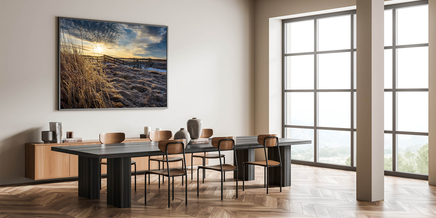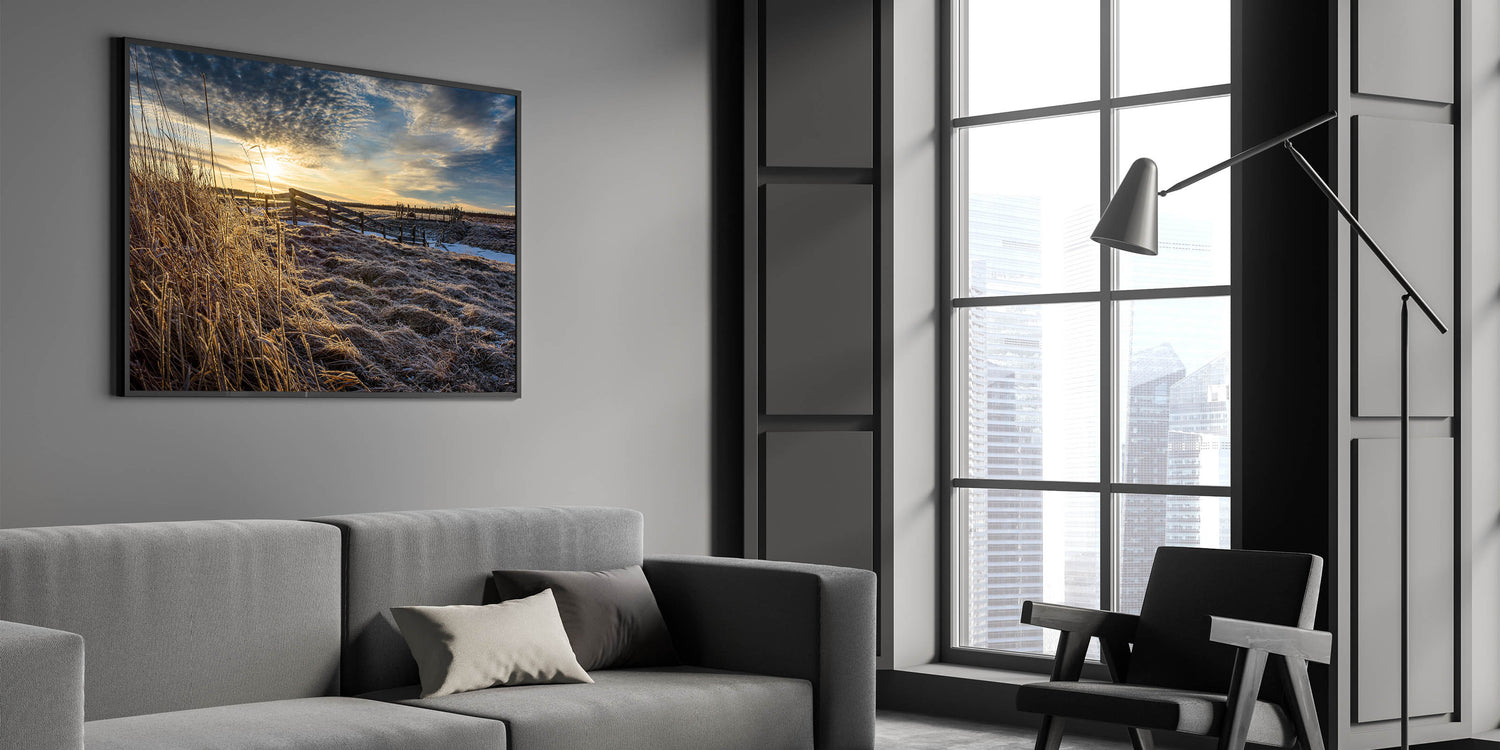 Start your day with the beauty of a frosty morning sunrise in rural New Brunswick. This stunning wall art captures the early morning light casting a golden glow over a field covered in frost. The rustic wooden fence and vast sky add to the tranquil charm of this peaceful landscape, perfect for bringing a sense of serenity to your space.