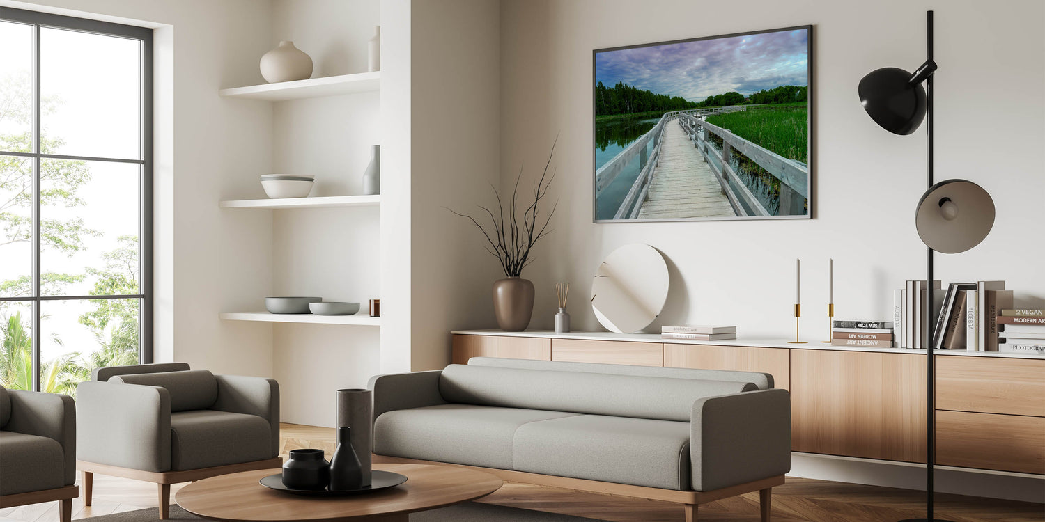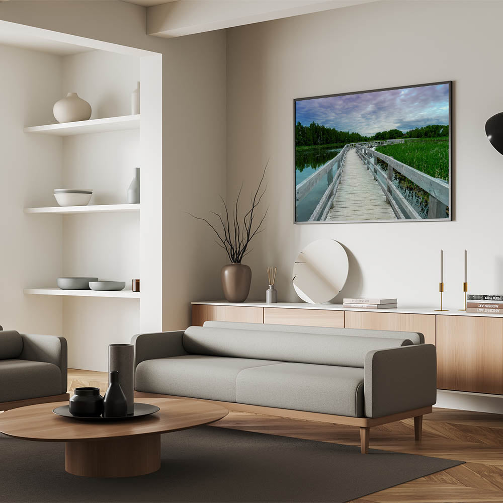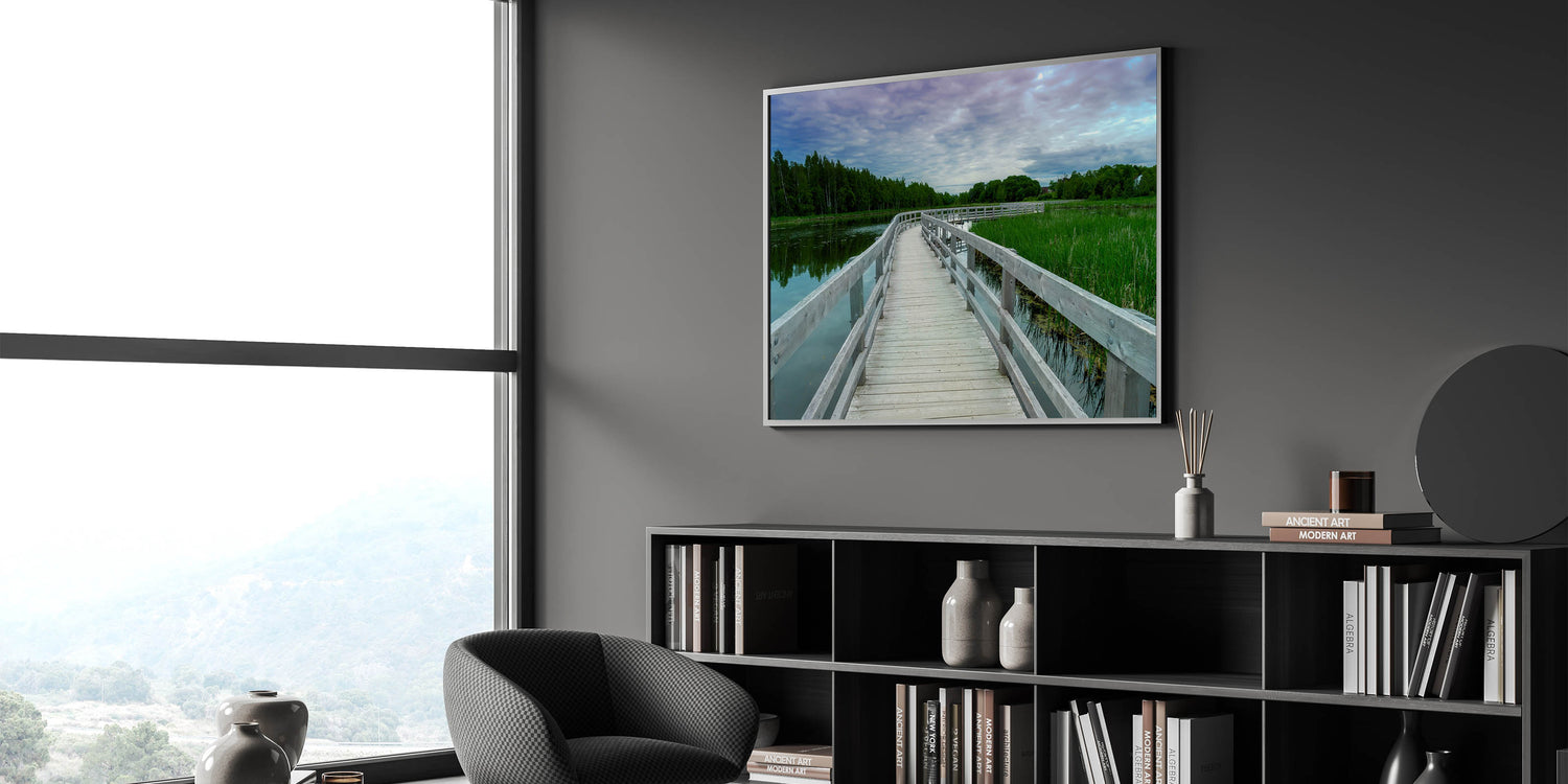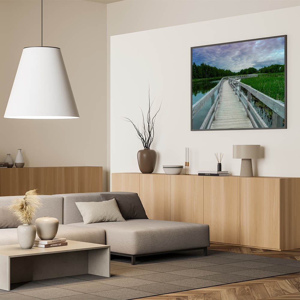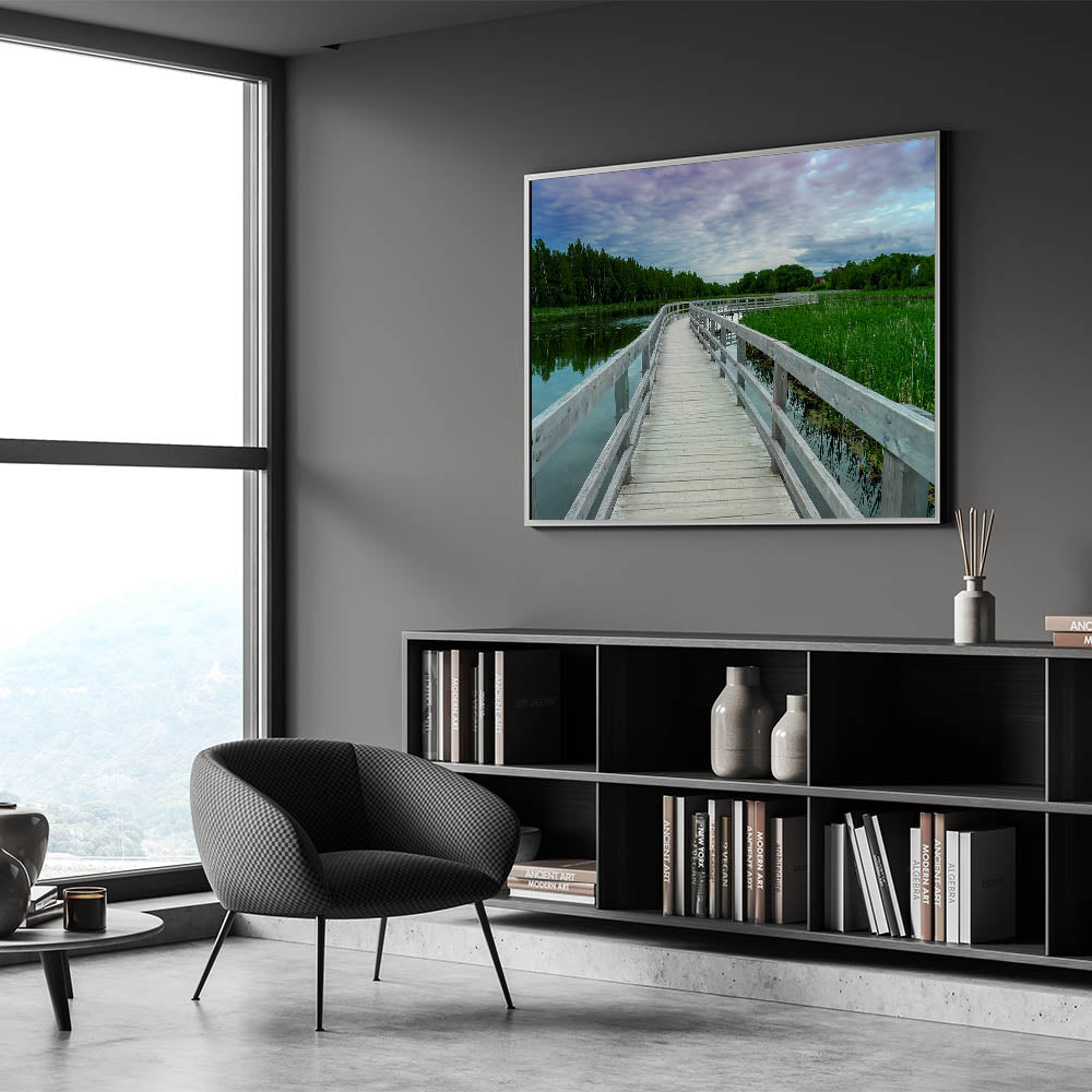 Experience the tranquility of New Brunswick's wetlands with this stunning wall art. Featuring a peaceful wooden walkway surrounded by lush greenery and serene waters, this artwork invites you to escape into nature’s calm beauty. Ideal for those who seek a connection to the outdoors, this piece adds a sense of peace and serenity to any room.