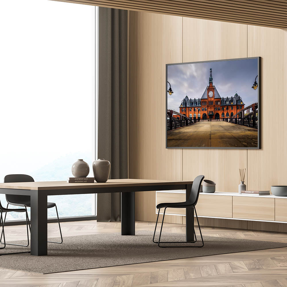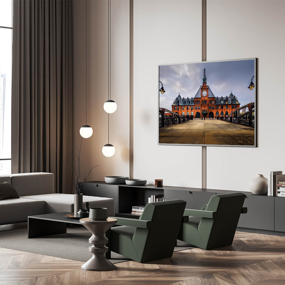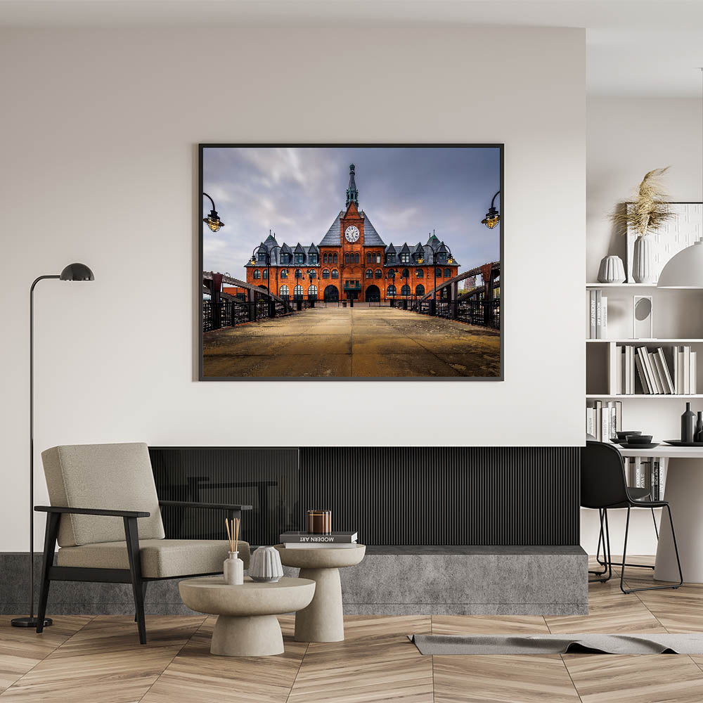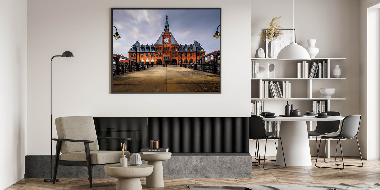 This striking image of the Central Railroad of New Jersey Terminal is a perfect piece for anyone who appreciates the architectural and historical significance of the state. The detailed facade, clock tower, and surrounding lamps bring a sense of history and elegance to this high-quality New Jersey wall art. Whether displayed in your home or office, this historic New Jersey scene offers a unique way to celebrate the state’s rich past. Available as beautiful New Jersey canvas prints or framed art pieces, this artwork adds a timeless touch to any decor.