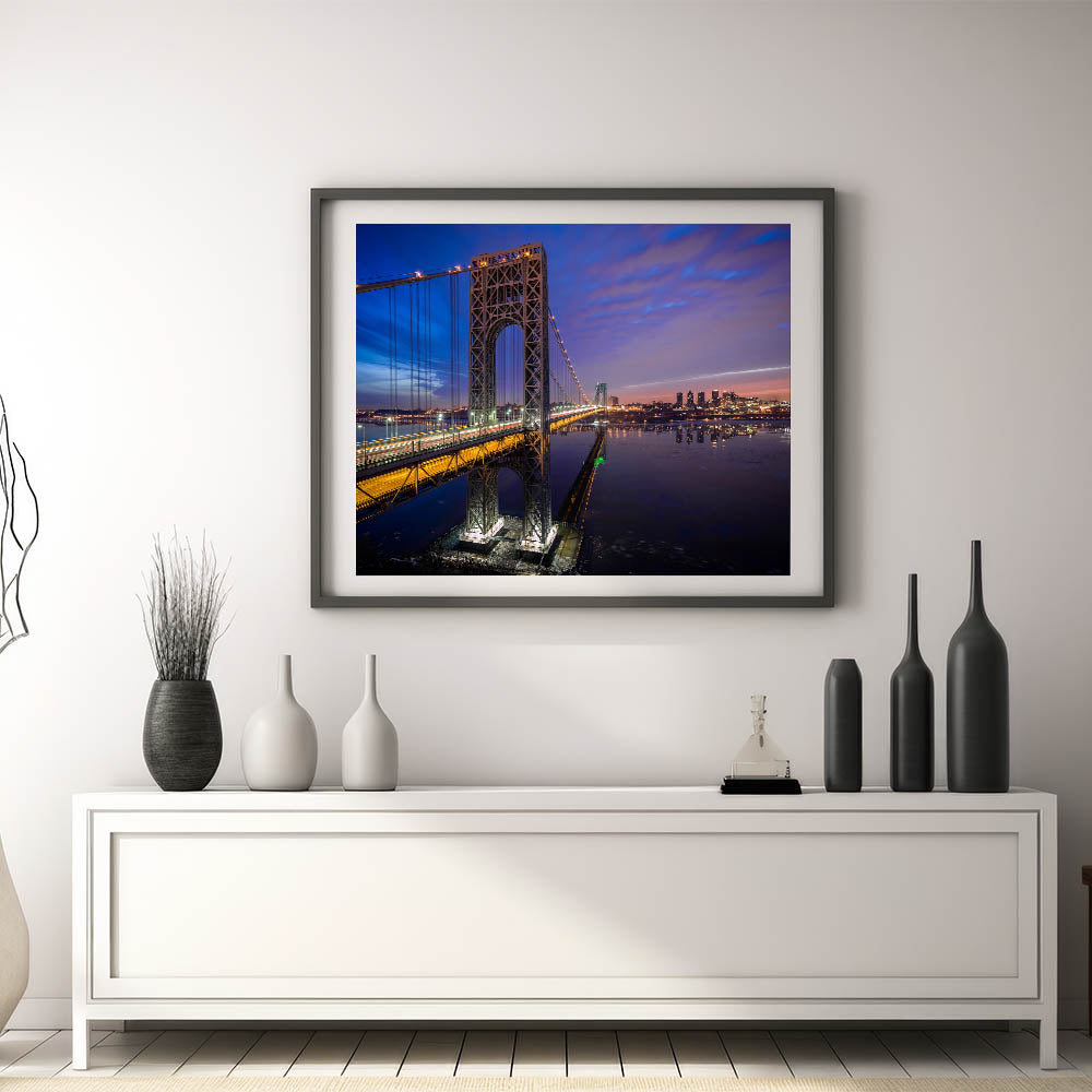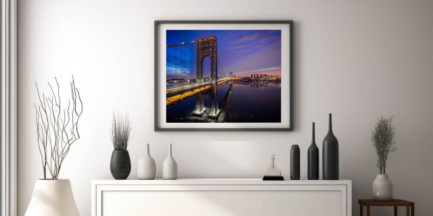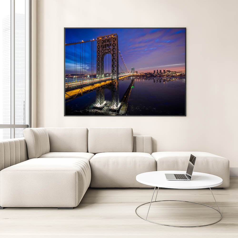 This striking image of the George Washington Bridge captured at dusk offers a stunning visual of one of New Jersey's most iconic landmarks. Perfect for home or office, this high-quality New Jersey wall art brings the calm and beauty of the evening sky and the glowing lights into your space. Available as beautiful New Jersey canvas prints and framed art pieces, this scenic New Jersey photography creates an atmosphere of tranquility and elegance.