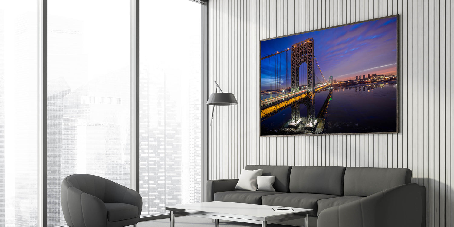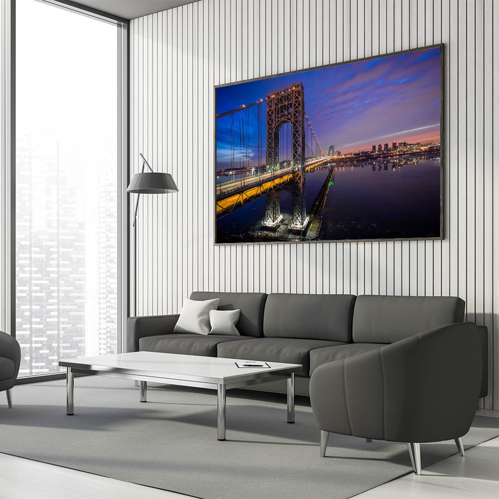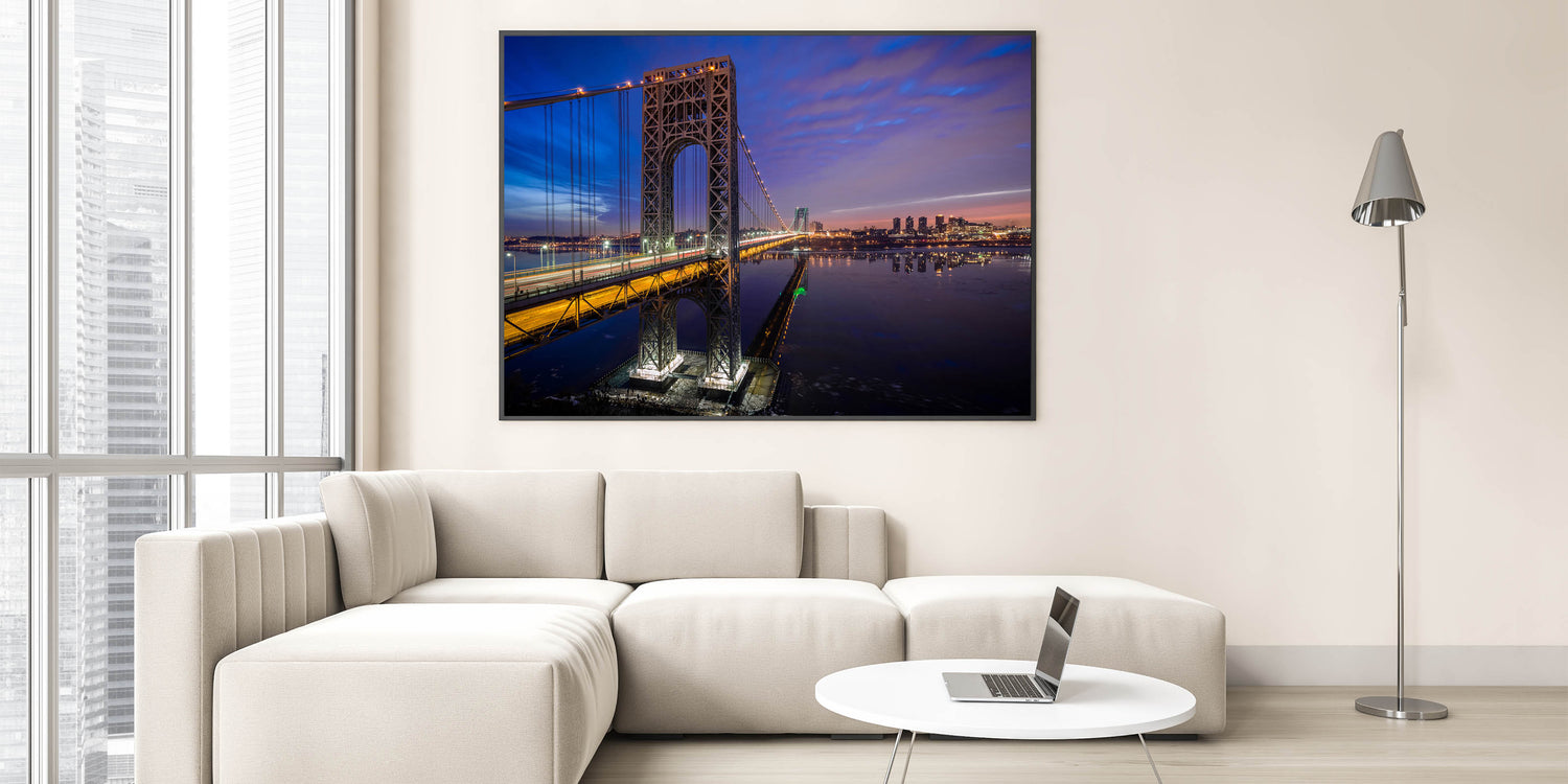 This striking image of the George Washington Bridge captured at dusk offers a stunning visual of one of New Jersey's most iconic landmarks. Perfect for home or office, this high-quality New Jersey wall art brings the calm and beauty of the evening sky and the glowing lights into your space. Available as beautiful New Jersey canvas prints and framed art pieces, this scenic New Jersey photography creates an atmosphere of tranquility and elegance.