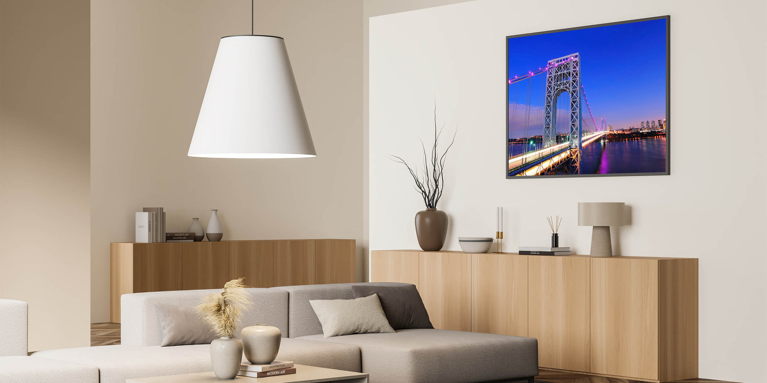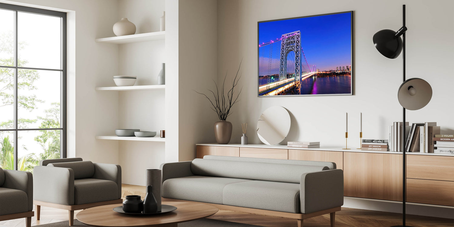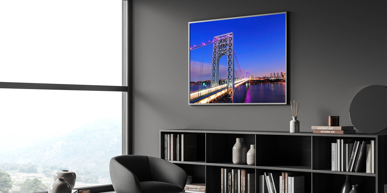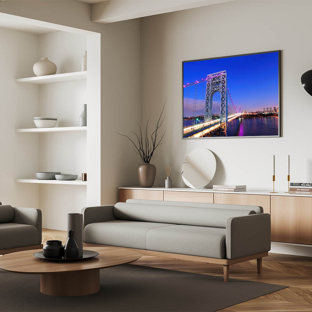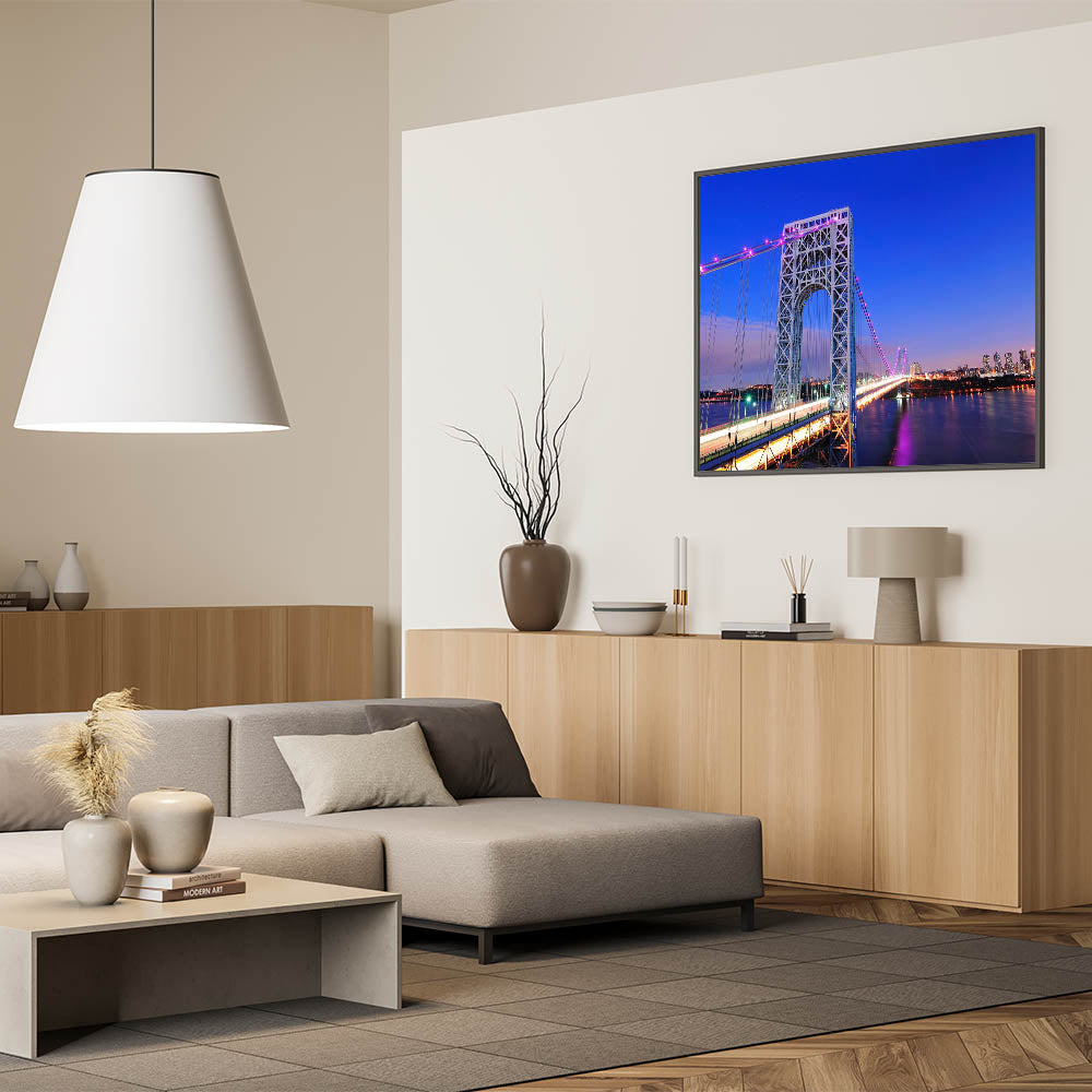 Bring the beauty of New Jersey into your space with this stunning depiction of the George Washington Bridge against a vibrant cityscape. This high-quality New Jersey wall art captures the architectural grandeur and bustling skyline, making it a perfect addition to any home or office. Whether you're drawn to beautiful New Jersey canvas prints or framed art pieces, this scenic New Jersey photography is designed to enhance your decor.
