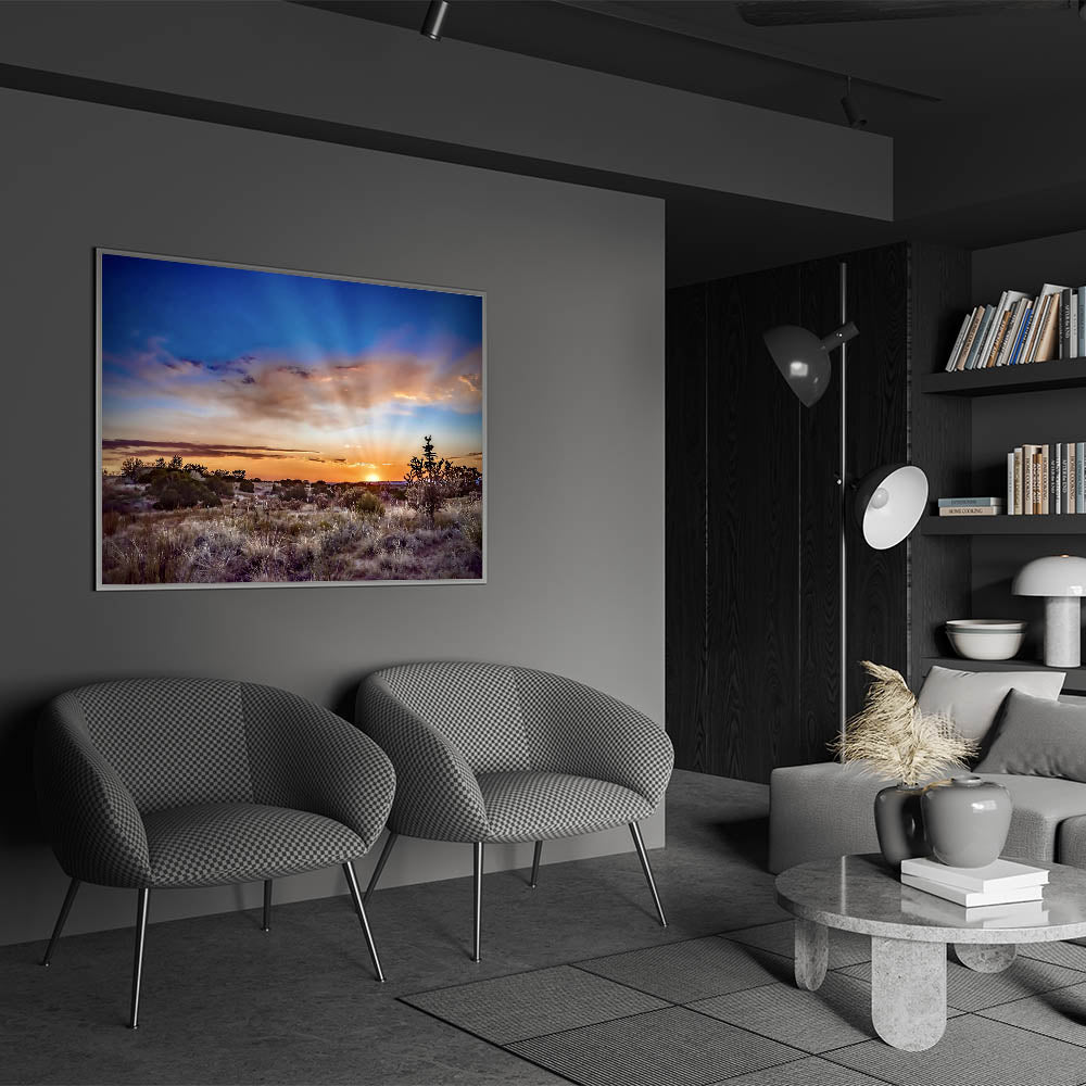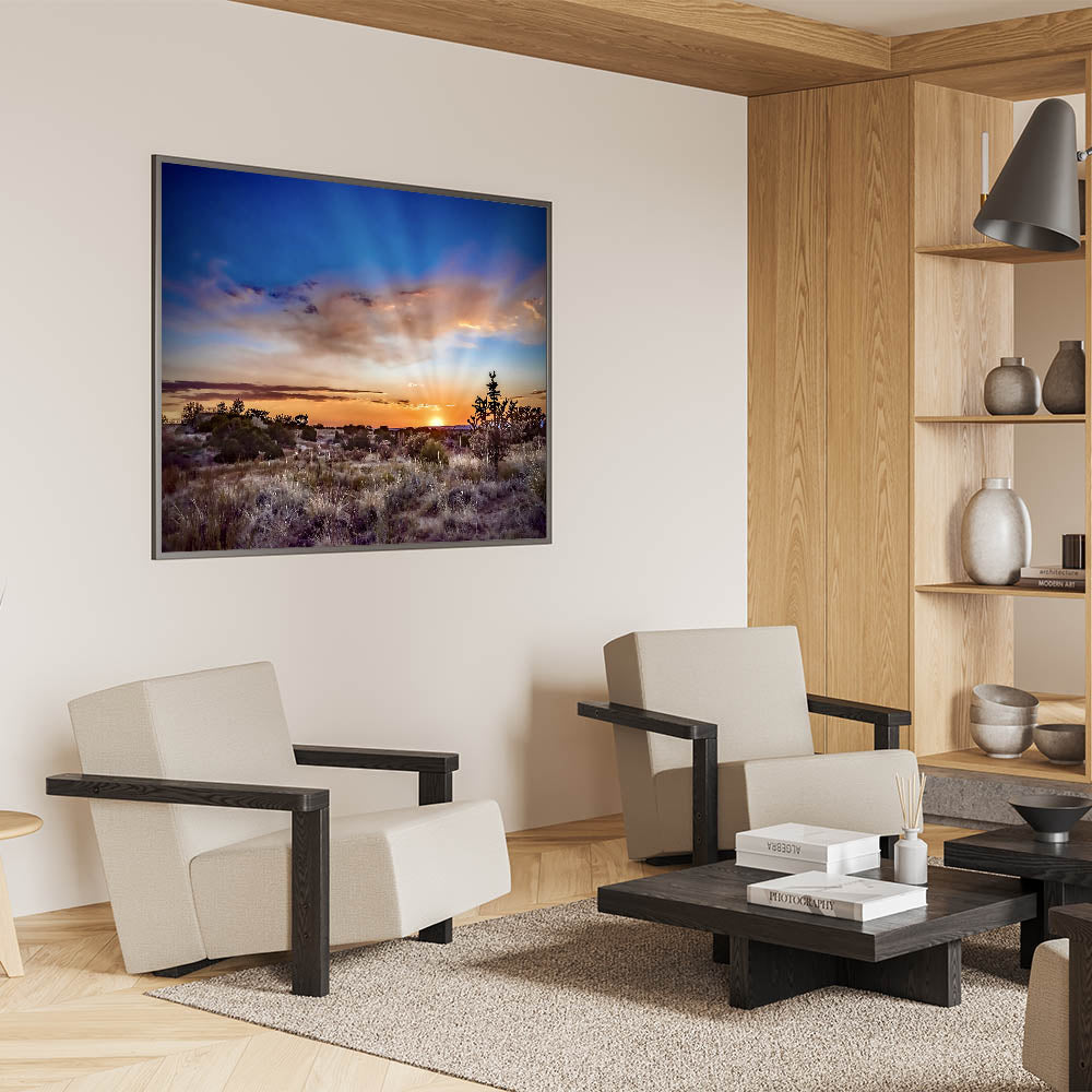This breathtaking artwork captures the essence of a serene Albuquerque desert sunset, with the sky painted in deep shades of orange and blue. The beautiful, sprawling desert landscape of New Mexico is brought to life in this high-quality wall art, which highlights the natural beauty and peacefulness of the region. Perfect for anyone who appreciates the majestic scenery of New Mexico, this piece adds warmth and depth to any room.