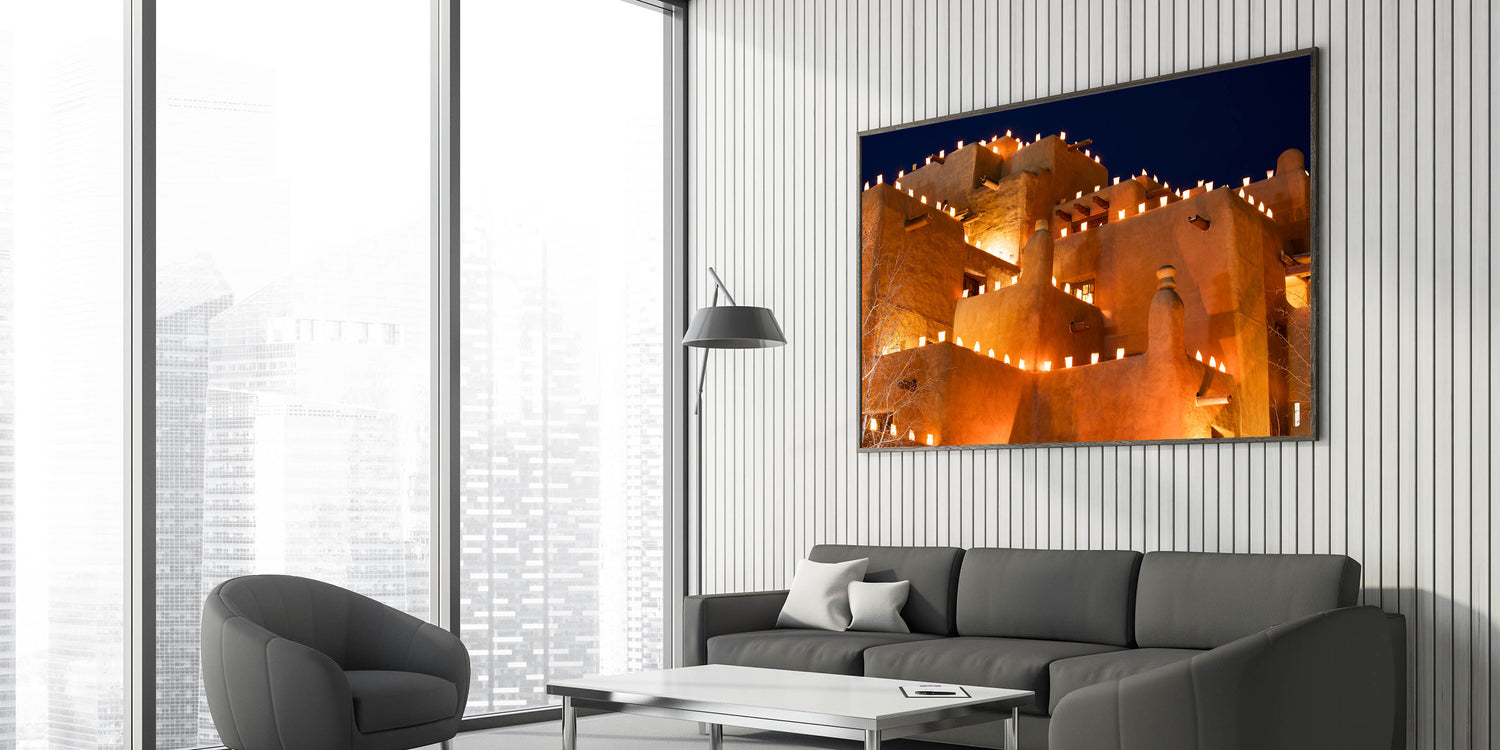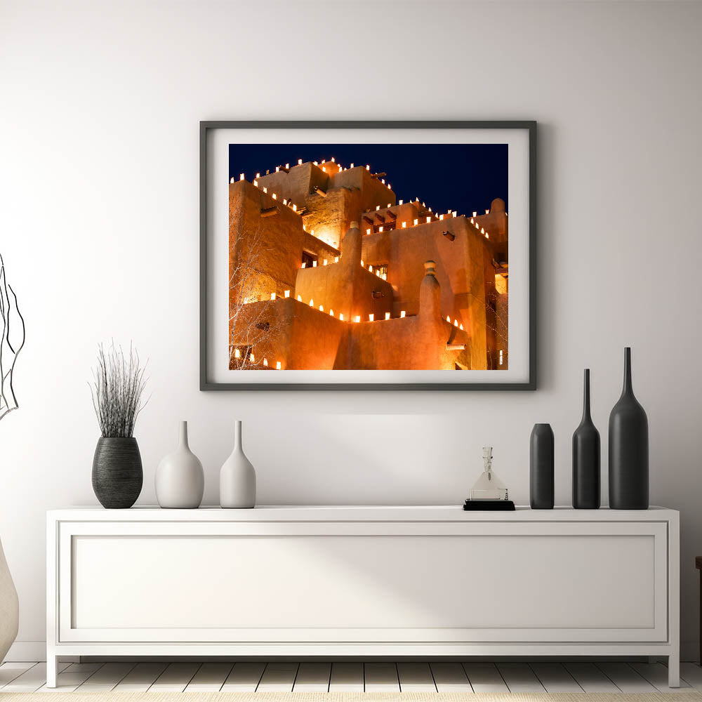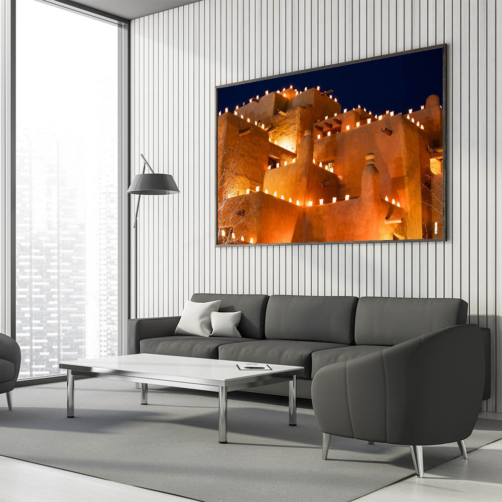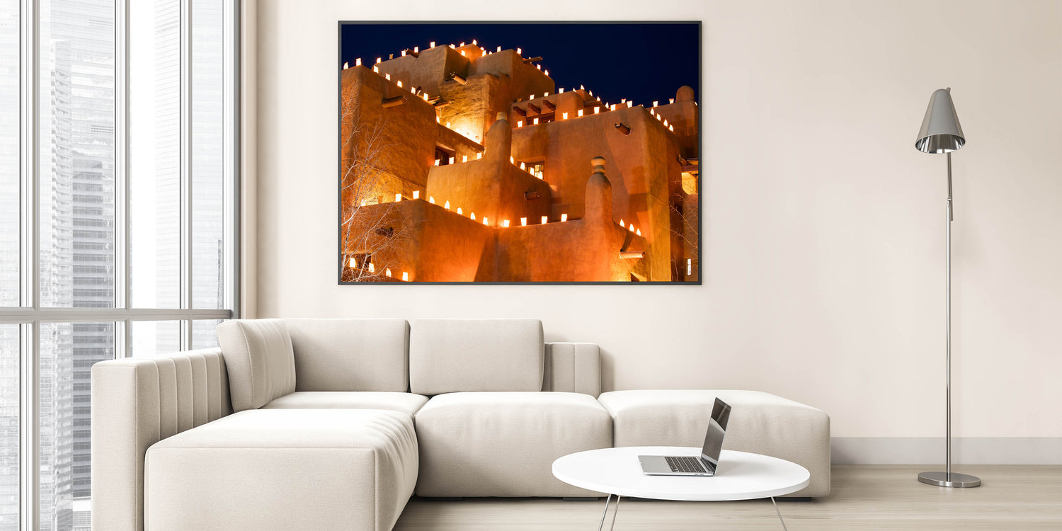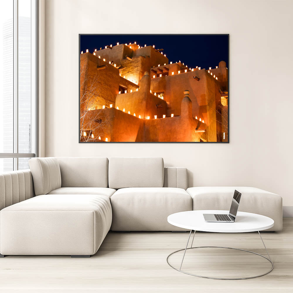 Experience the warmth and charm of a classic Santa Fe night with this breathtaking artwork featuring a traditional adobe building illuminated by luminarias. This high-quality New Mexico wall art beautifully captures the magic of Southwestern architecture and lighting, making it the perfect centerpiece for any living space or office.