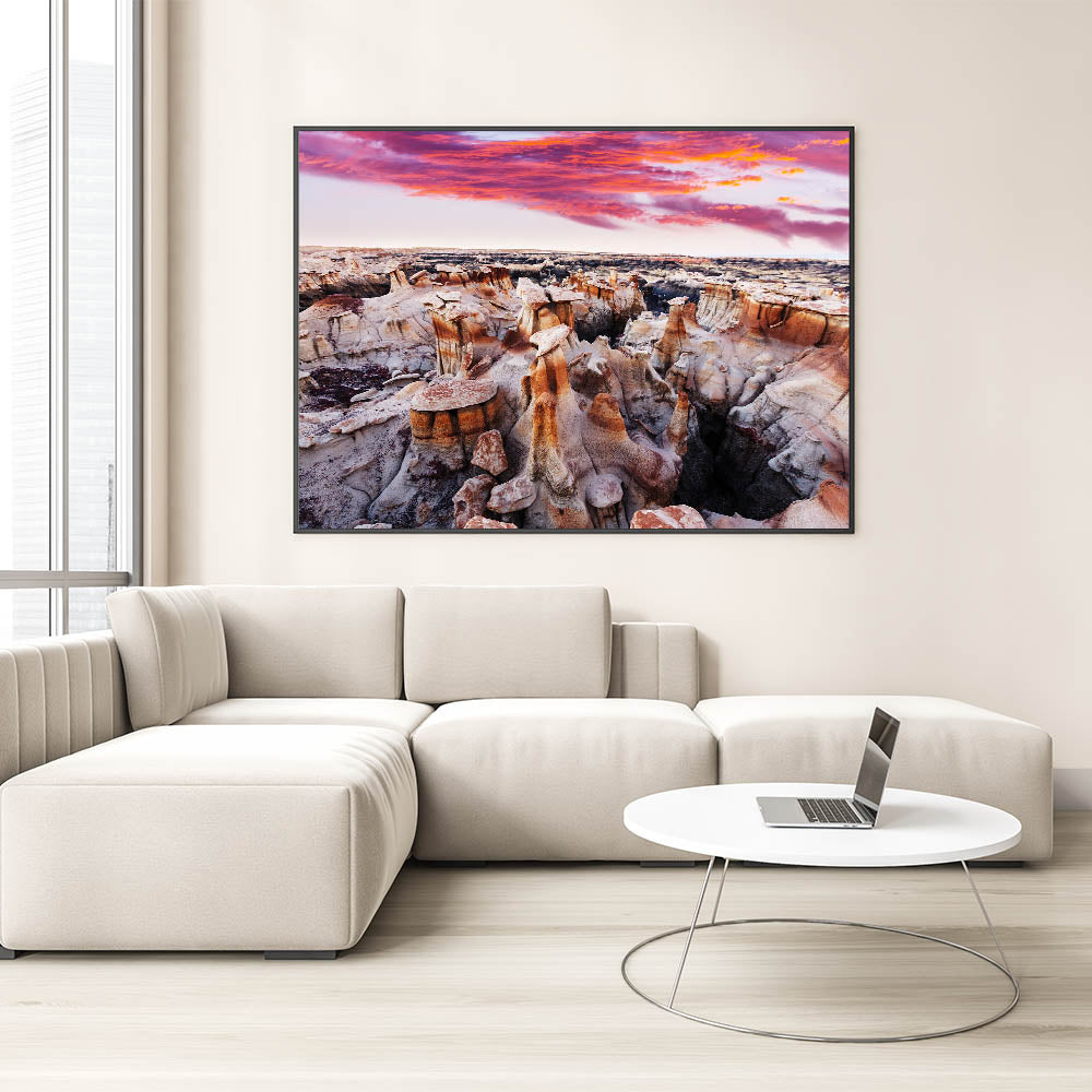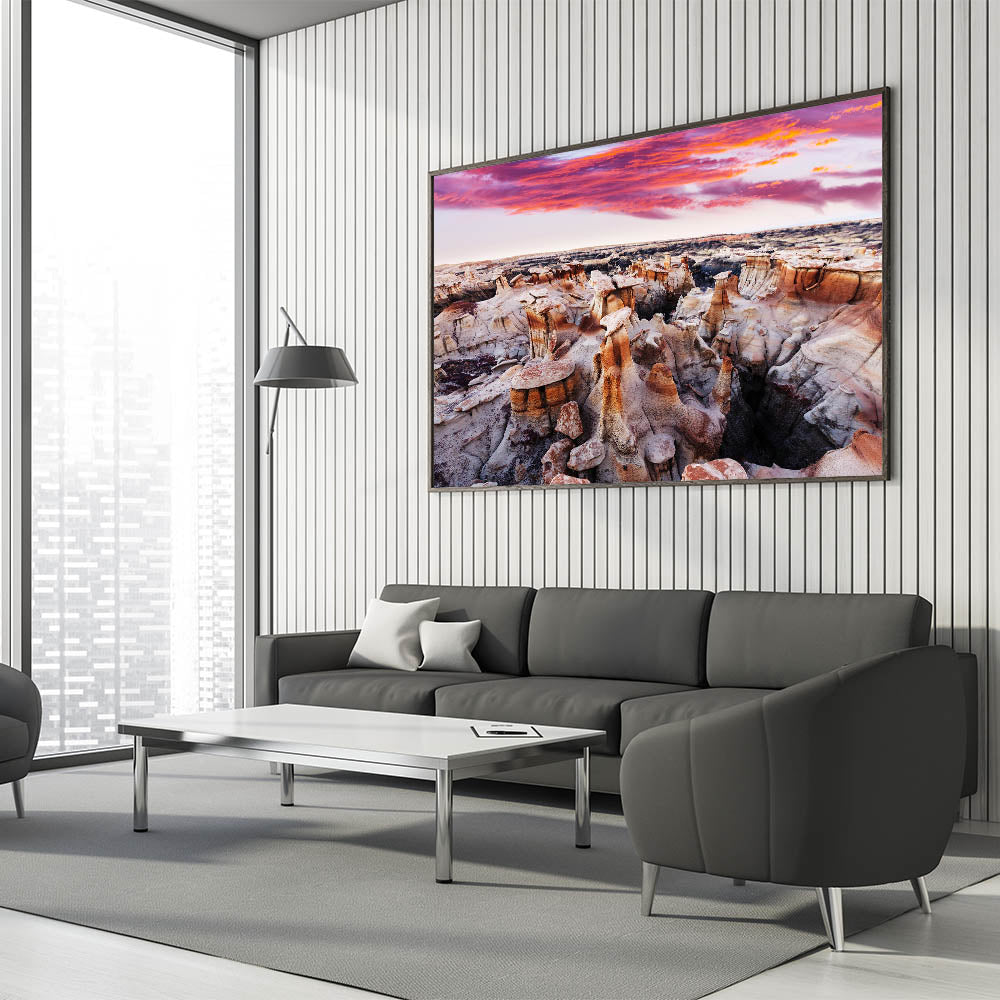 This artwork captures the dramatic colors of the desert sunrise, making it ideal for creating a statement in any living room, office, or bedroom. With a variety of formats available, from rolled canvas to framed acrylic glass, you can find the perfect fit for your decor style.
