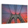 Capture the breathtaking beauty of the Brooklyn Bridge at sunset with this stunning wall art. This dramatic perspective of the bridge against a fiery sky highlights the architectural splendor of one of New York City's most iconic landmarks. The vivid sunset colors contrast beautifully with the timeless stonework, making this art piece a perfect addition to any modern interior.