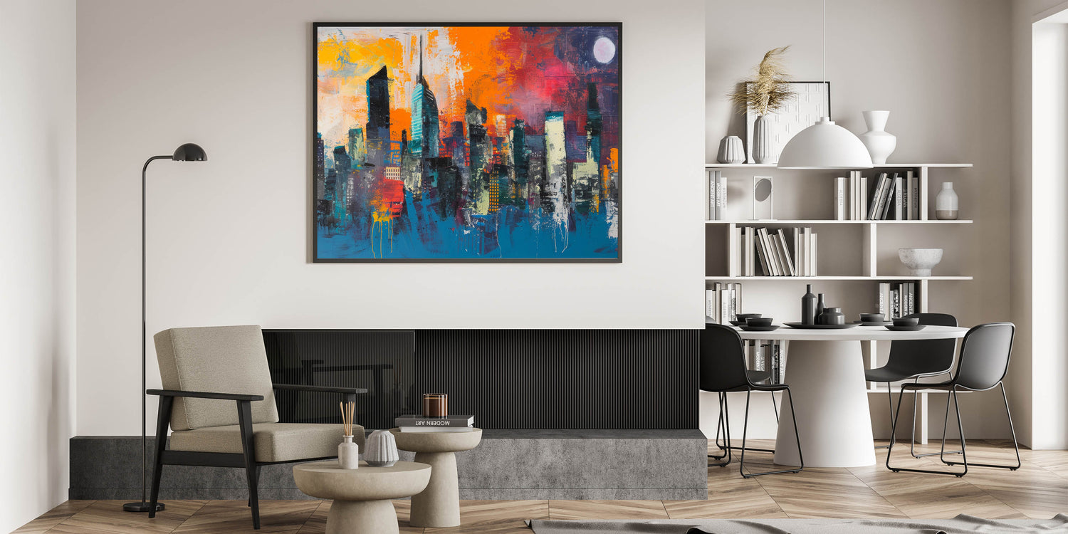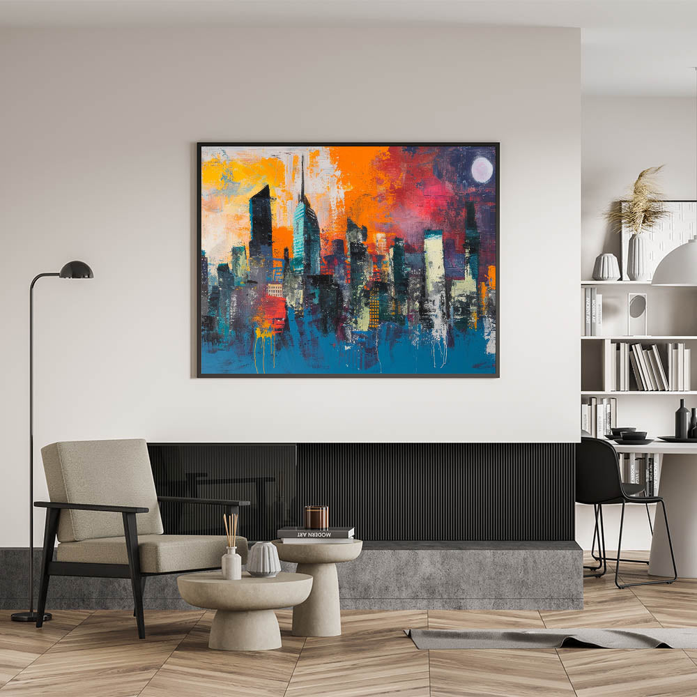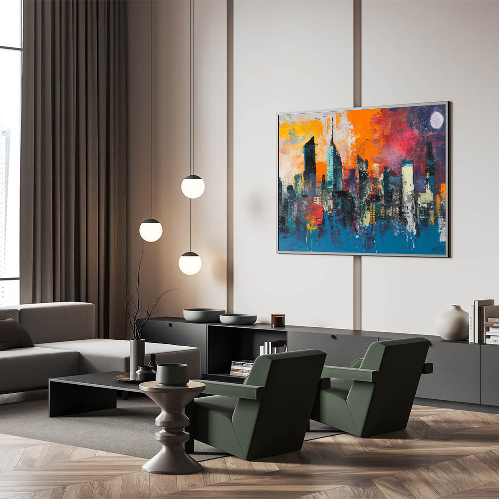 Make a bold statement in your space with this abstract Manhattan skyline art. This striking piece captures the essence of New York City’s iconic skyline, blending bold colors like orange, blue, and red with splashes of vivid energy. The mix of geometric forms and splattered paint creates a dynamic, artistic representation of the NYC skyline that is both modern and eye-catching. Perfect for those who appreciate contemporary art, this unique New York City print brings life and color to any room. Available in various formats, including stretched canvas, framed prints, and acrylic glass, this vibrant artwork adds a creative flair to any decor.
