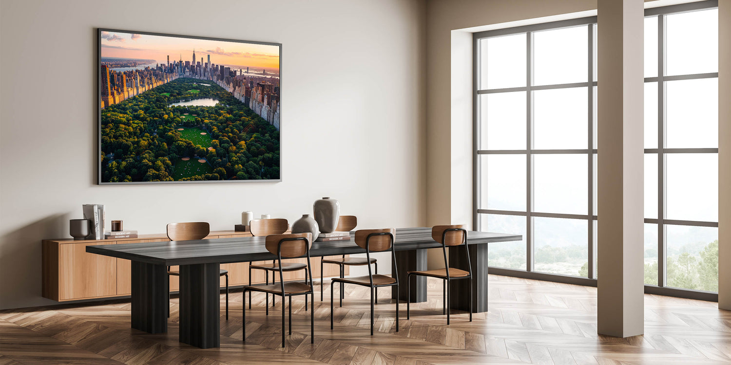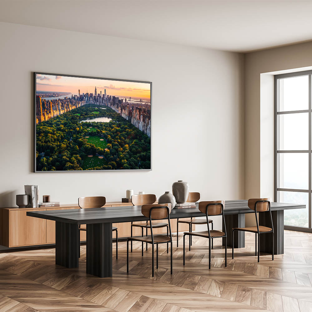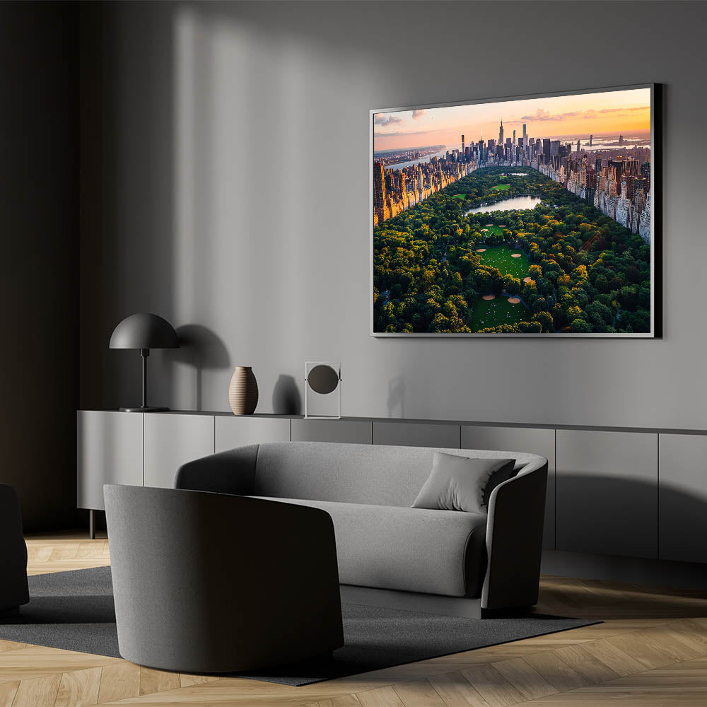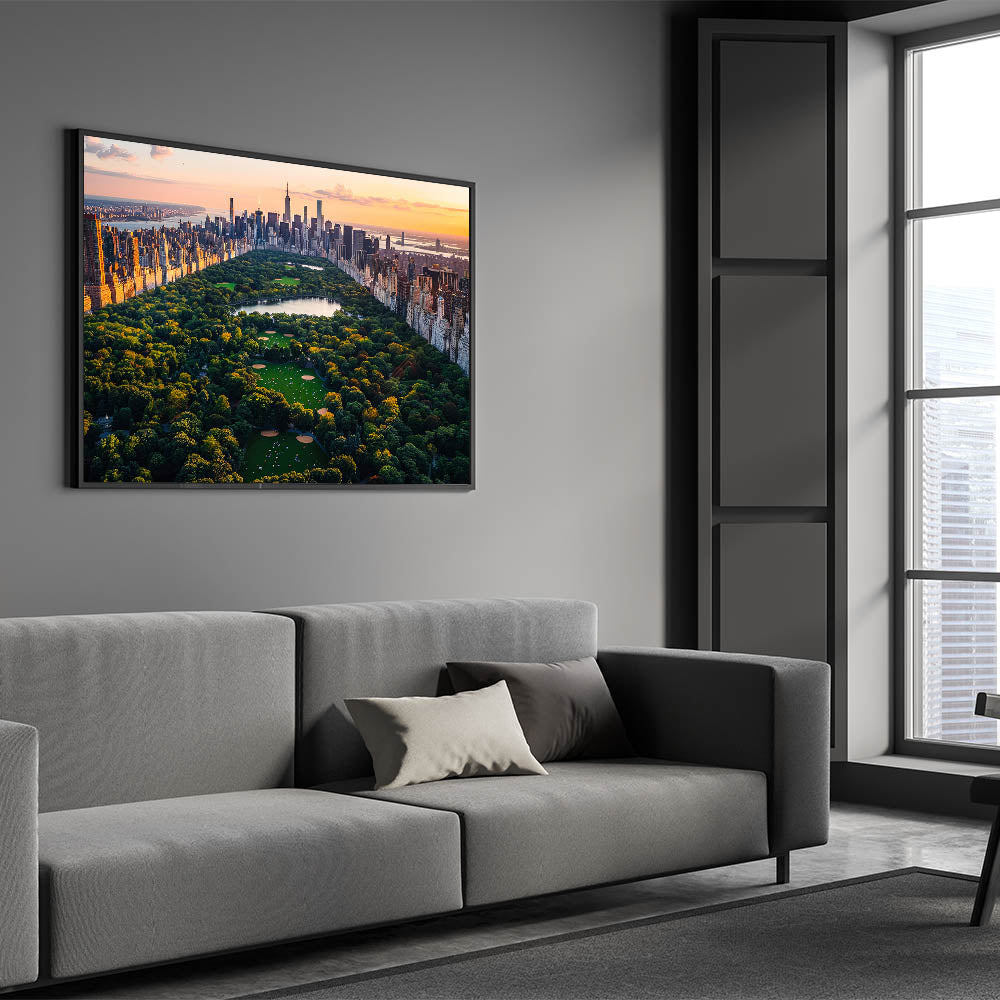 Elevate your home decor with this stunning aerial view of Central Park at sunset, showcasing the breathtaking NYC skyline. This high-quality Central Park photography captures the warm glow of the setting sun illuminating Manhattan's skyscrapers, while the green expanse of the park contrasts beautifully with the golden hues of the city. Perfect for lovers of New York City art prints and scenic Central Park photography, this piece adds a sophisticated yet calming touch to any space.