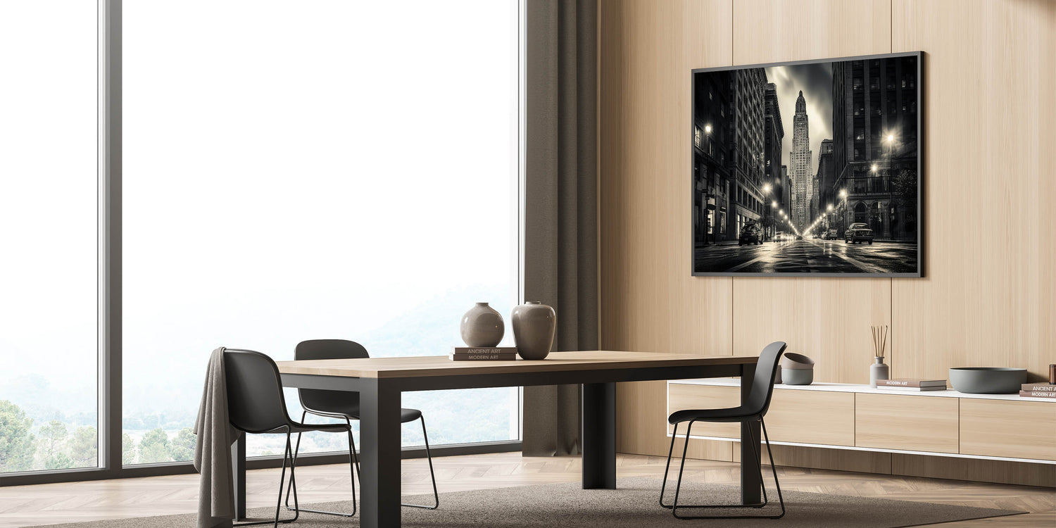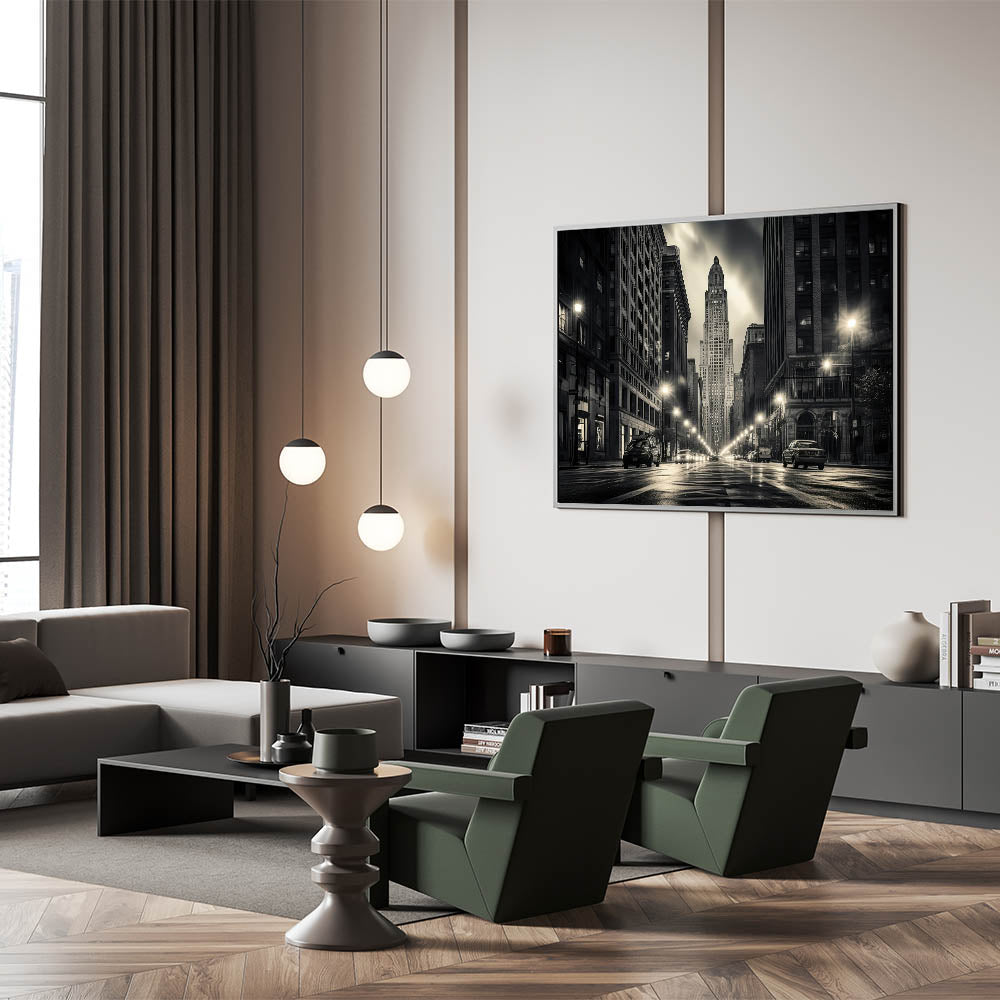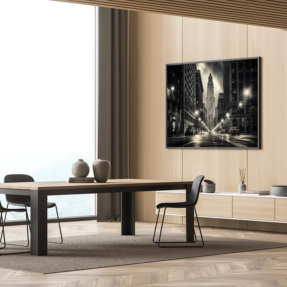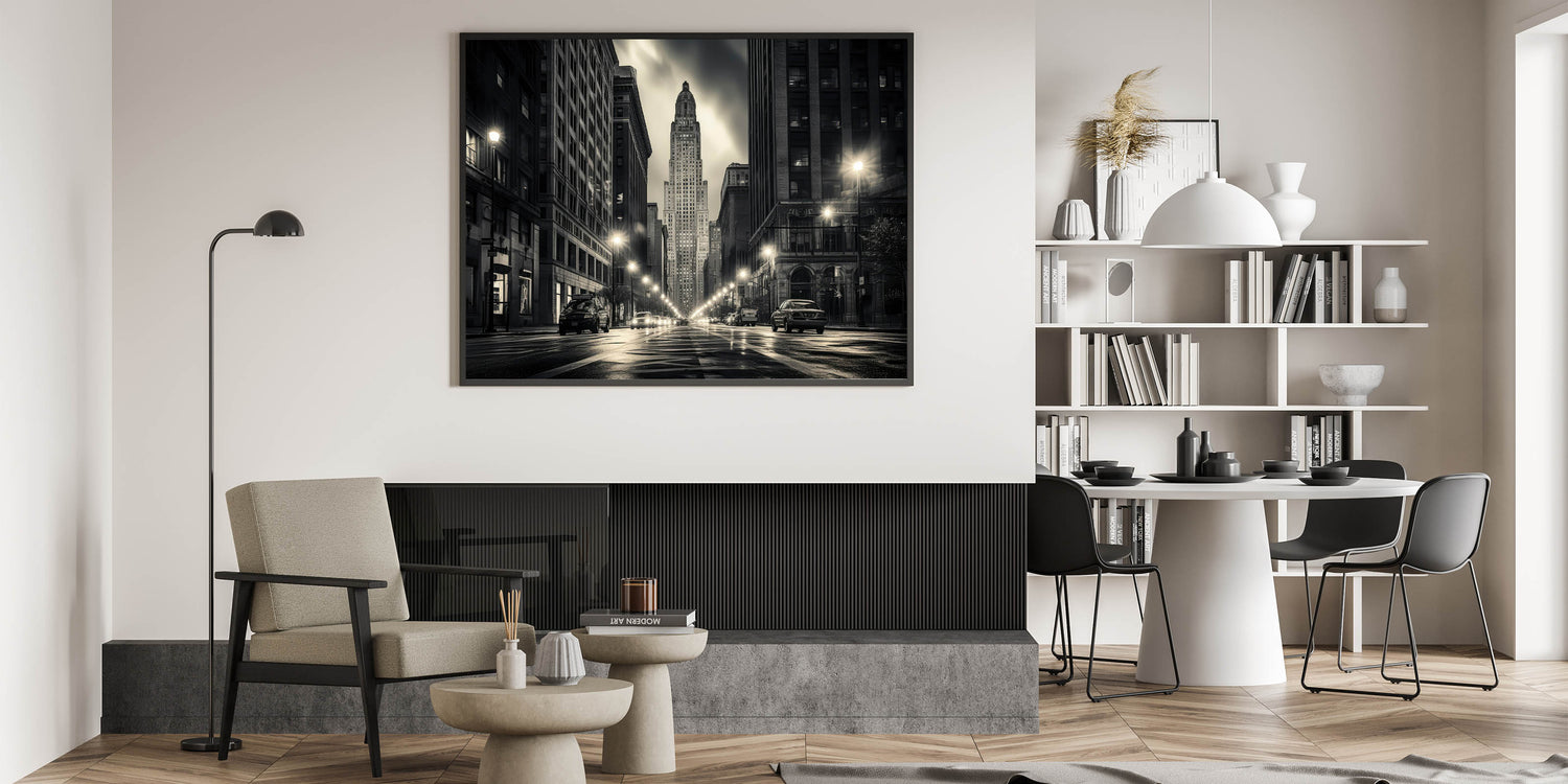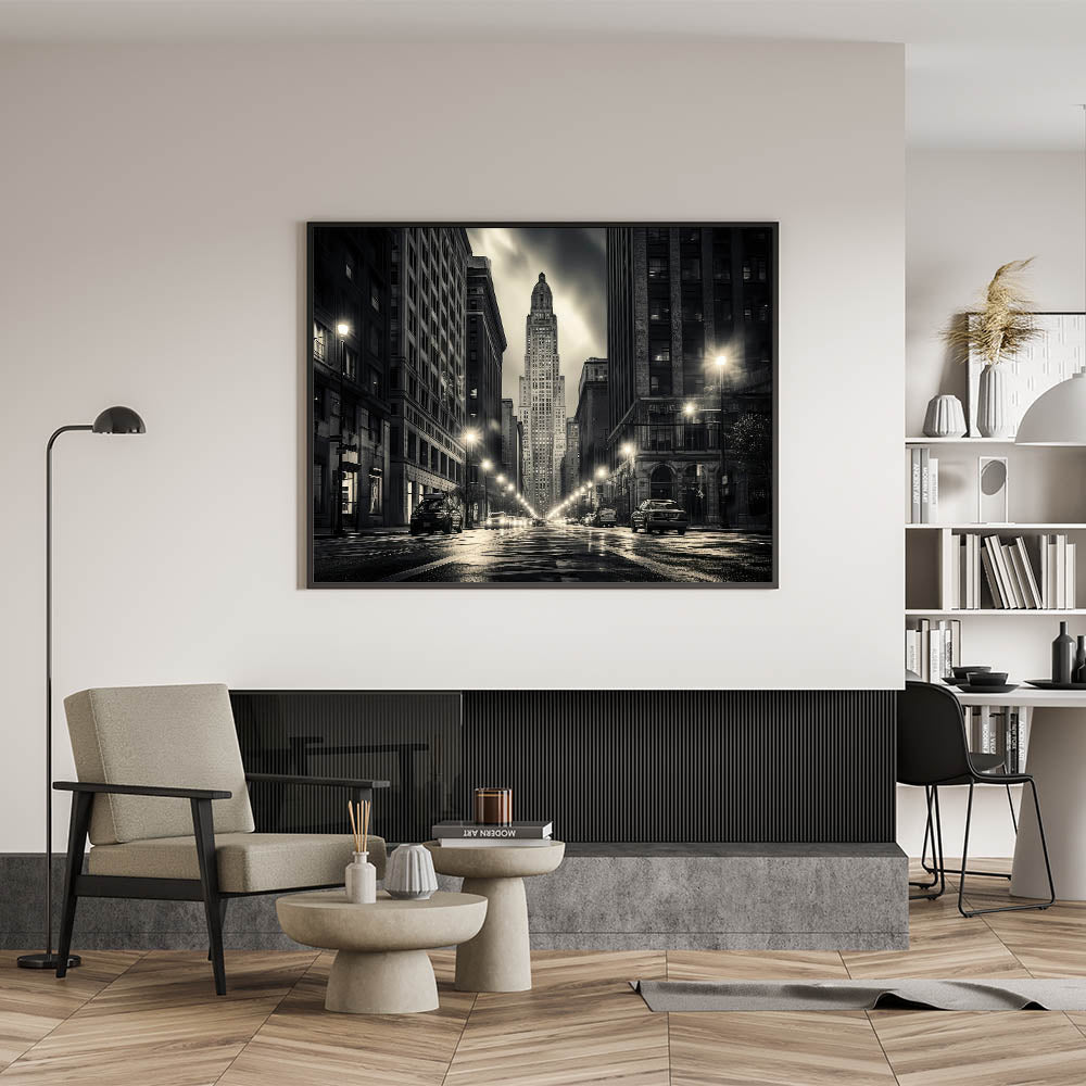 Step into the heart of New York City with this striking black-and-white Empire State Building artwork. Capturing the city's architectural brilliance and urban streetscape, this piece features a moody, cinematic view of the iconic skyline framed by tall, imposing buildings. The glow of streetlights against the monochrome setting adds depth and drama, making this artwork a perfect statement piece for any room.