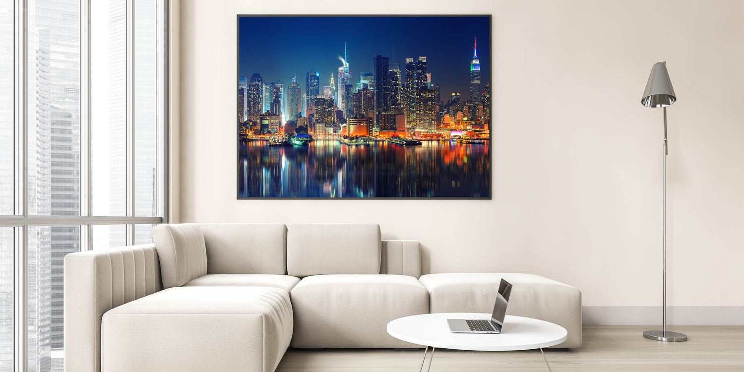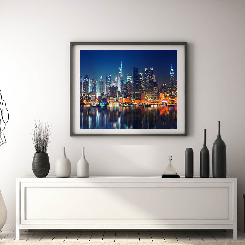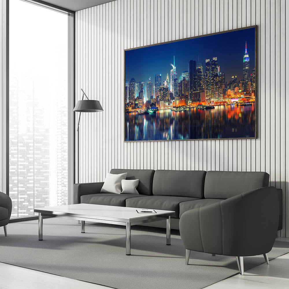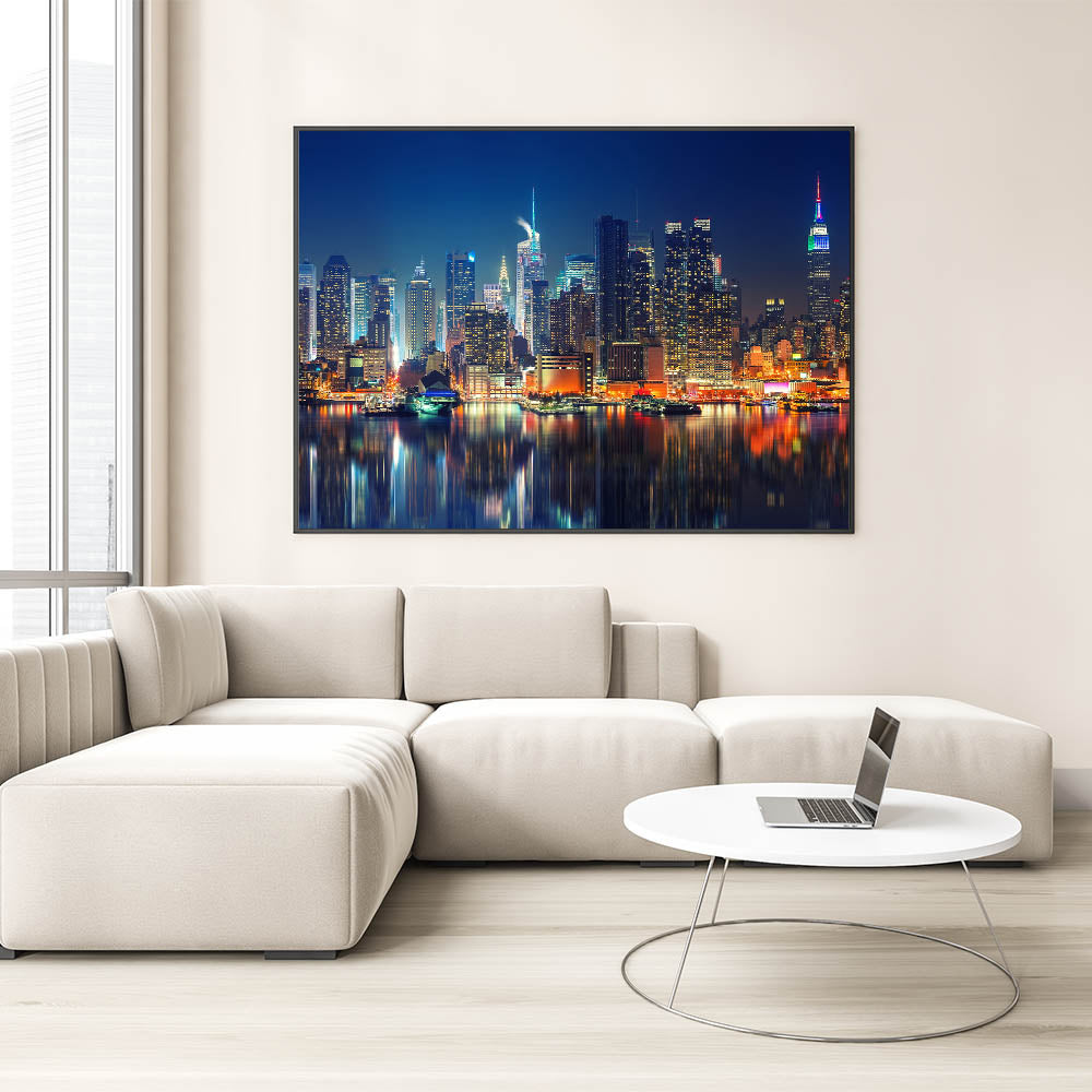 Transform your space with the dazzling beauty of New York City's skyline at night with this Manhattan skyline wall art. This breathtaking piece showcases the vibrant lights of Manhattan reflected across the Hudson River, with iconic skyscrapers like the Empire State Building lighting up the city. Perfect for modern decor, this high-quality Manhattan art print is available in a variety of formats, including stretched canvas, framed print, and acrylic glass, allowing you to choose the perfect option for your home or office.
