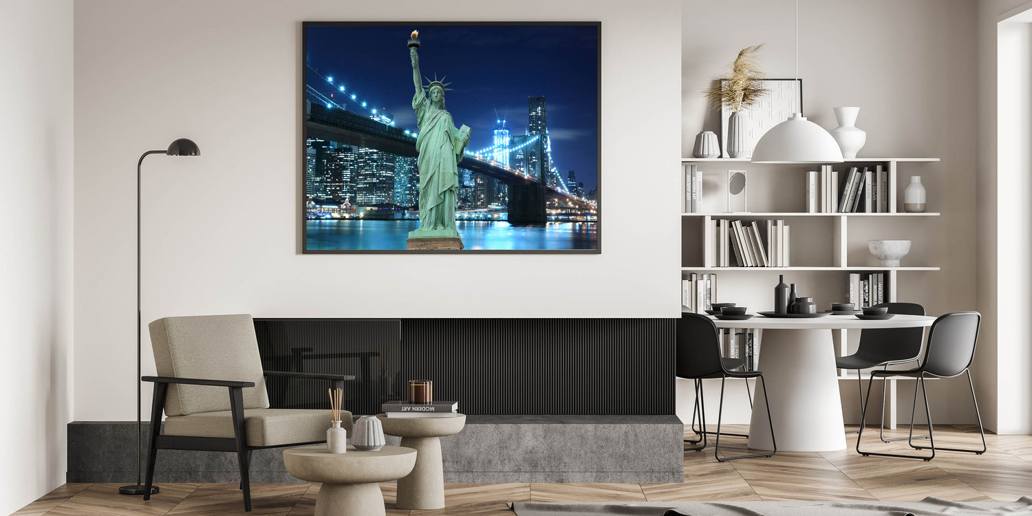 - High-quality Statue of Liberty prints capturing the beautiful New York City skyline at night.