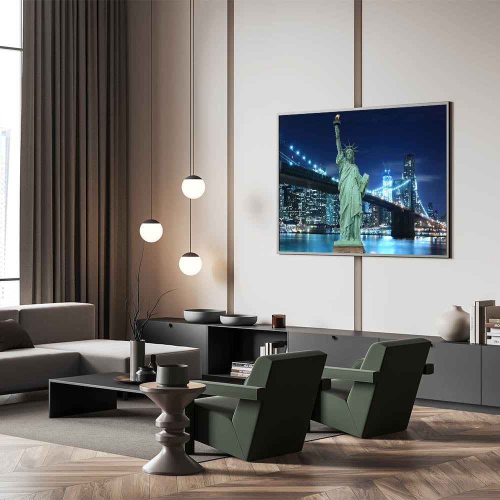 Capture the essence of New York City at night with this breathtaking Statue of Liberty wall art, set against the illuminated skyline of the city. The vibrant colors of this high-quality Statue of Liberty print make it the perfect addition to any space seeking a pop of energy and iconic NYC landmarks. The detailed Liberty Island artwork showcases the brilliance of both the statue and the city’s dazzling lights.