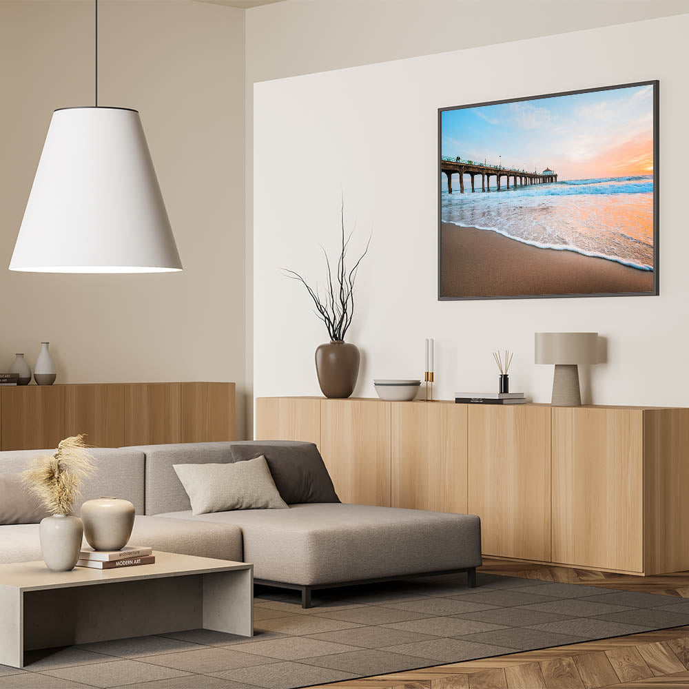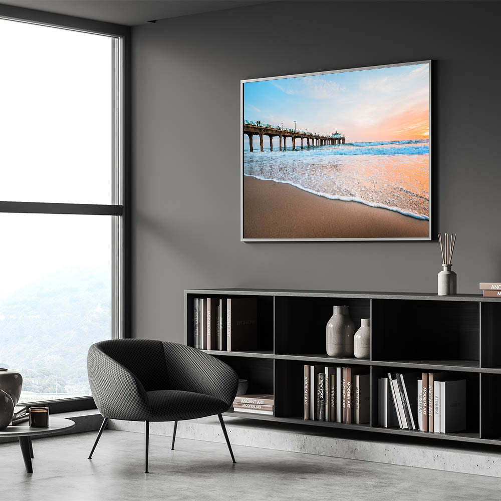 Bring a calming touch of nature and tranquility to your space with this serene pier and ocean sunset wall art. This stunning piece captures the soothing waves of the ocean as they meet the sand, with the pier extending gracefully into the distance under a soft pastel sunset sky. Perfect for coastal, modern, or minimalist decor, this high-quality Manhattan art print adds a peaceful vibe to any room. Available in multiple formats, including stretched canvas, framed prints, and acrylic glass, this beautiful piece of wall art transforms your space into a serene retreat.