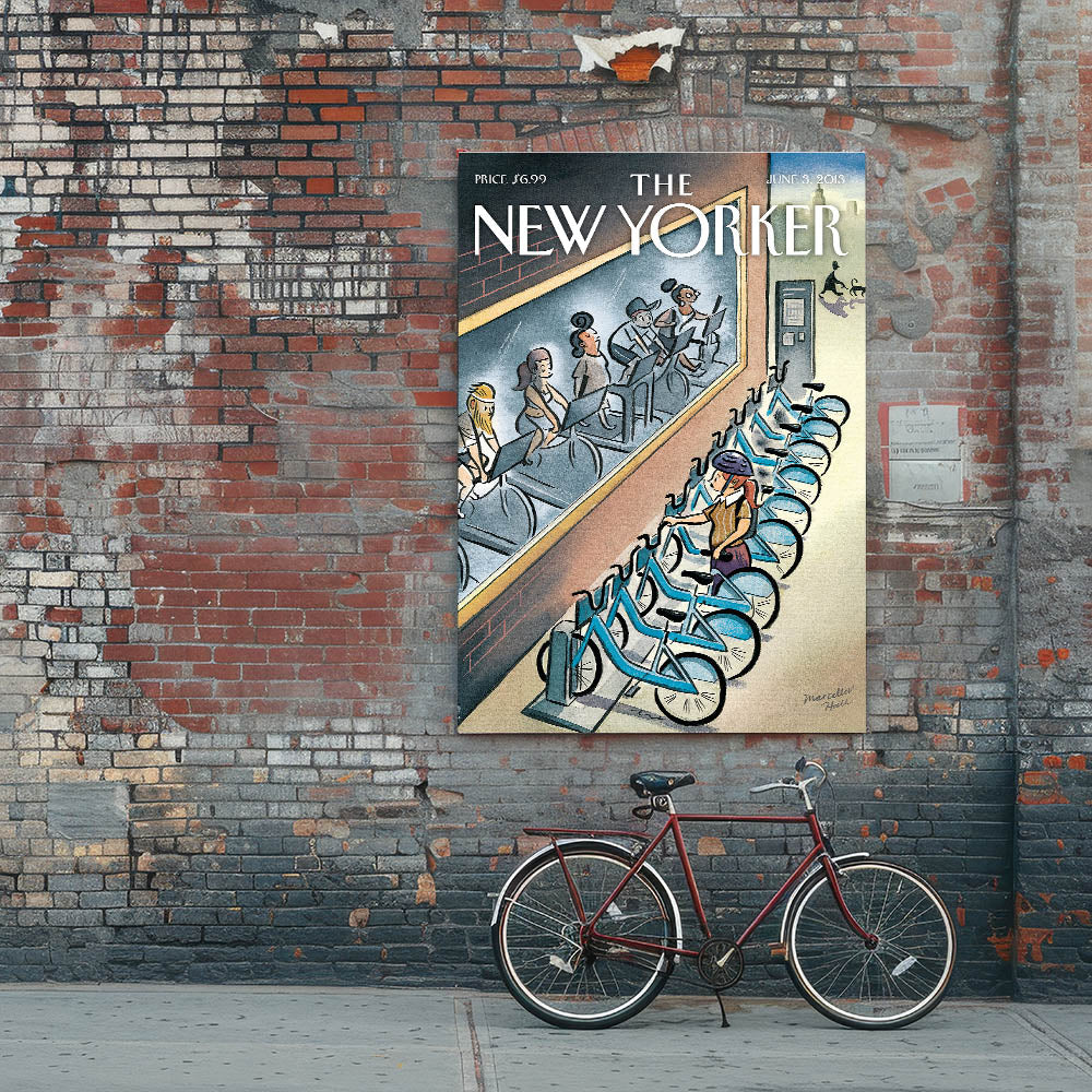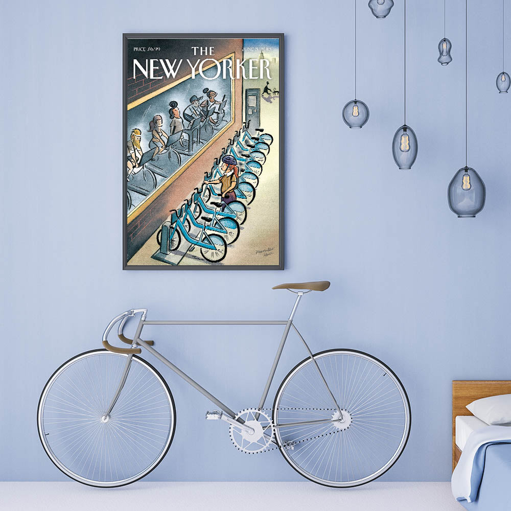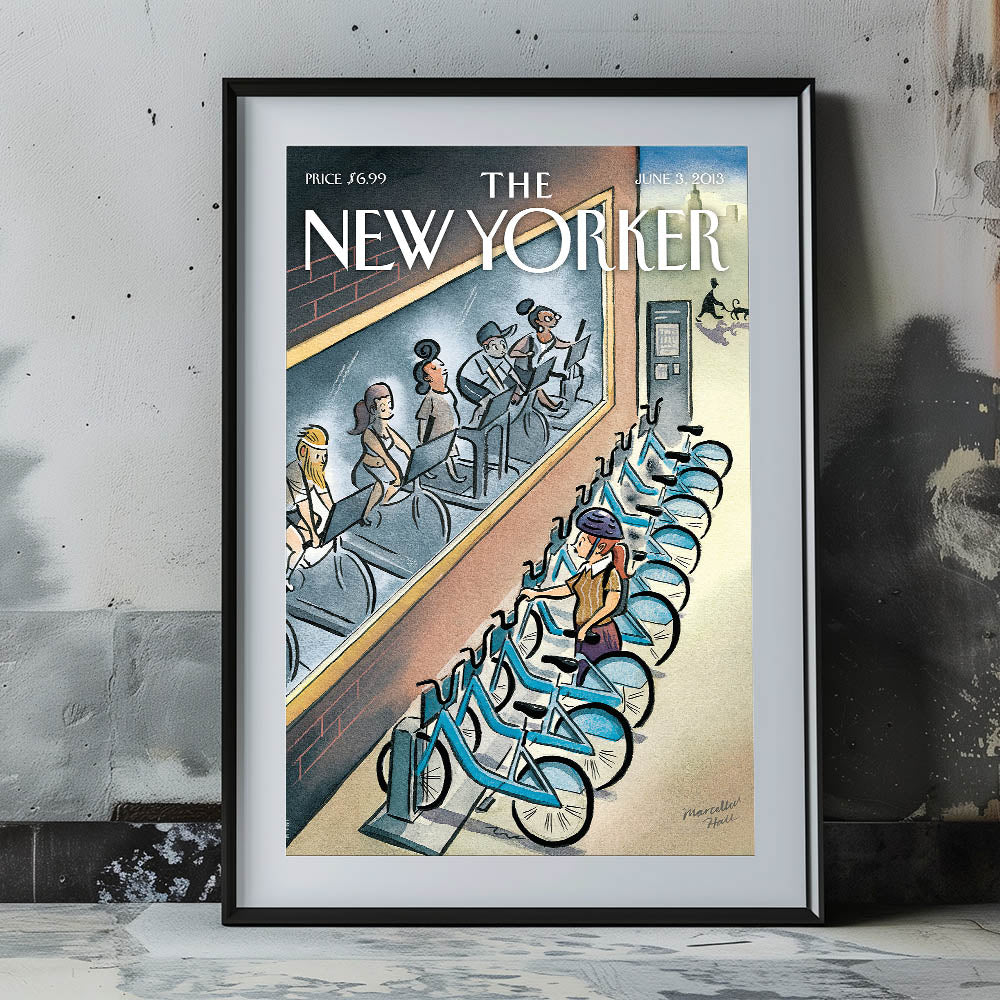 This fun New Yorker magazine cover art features a quirky scene where a woman is caught between a row of brightly colored bikes and a window showcasing cyclists working away on stationary bikes. The humorous contrast between the outdoor cycling scene and the indoor “cycling” sets the tone for this witty New Yorker illustration. Perfect for anyone who enjoys urban art or is a fan of retro New Yorker designs, this piece will bring personality and charm to any space.