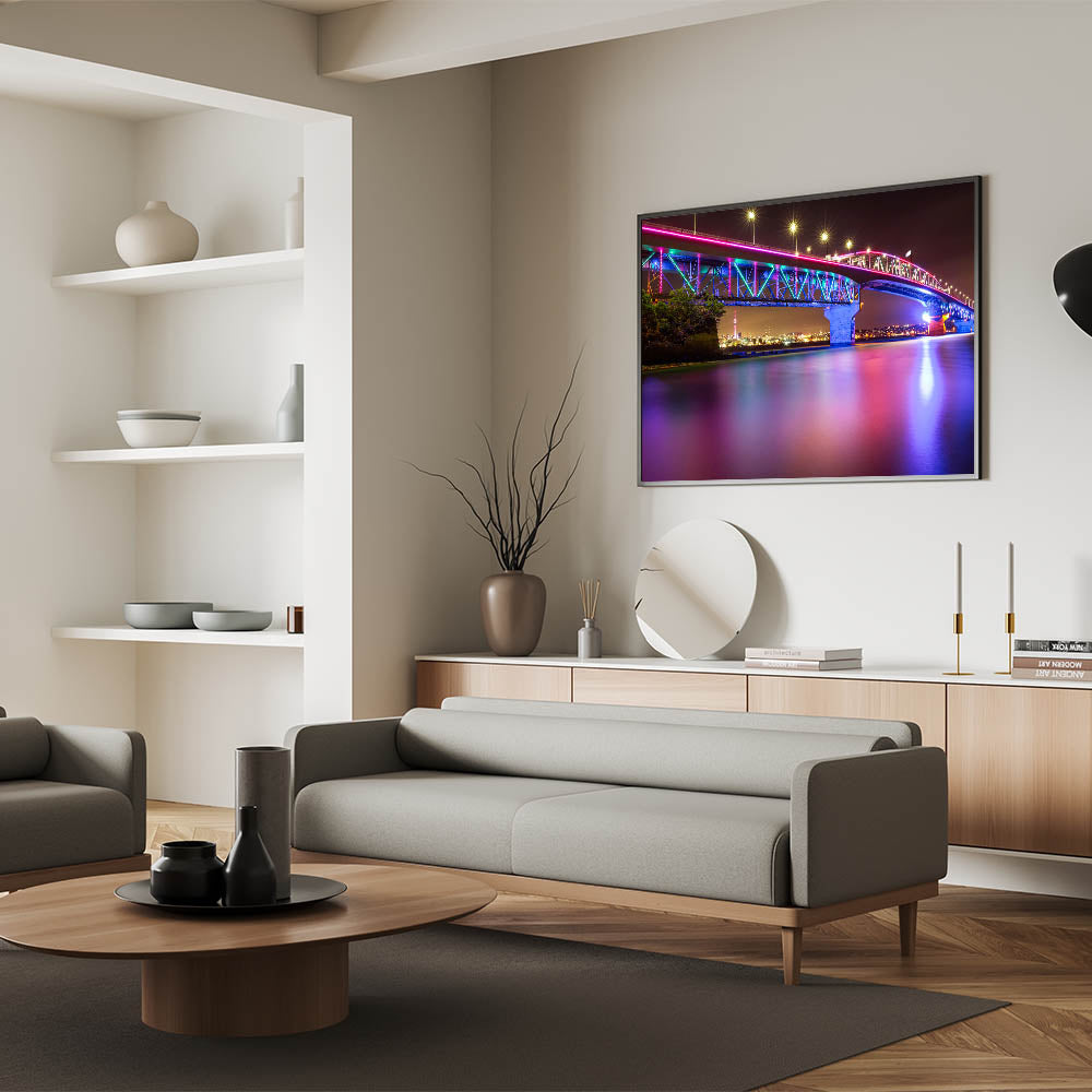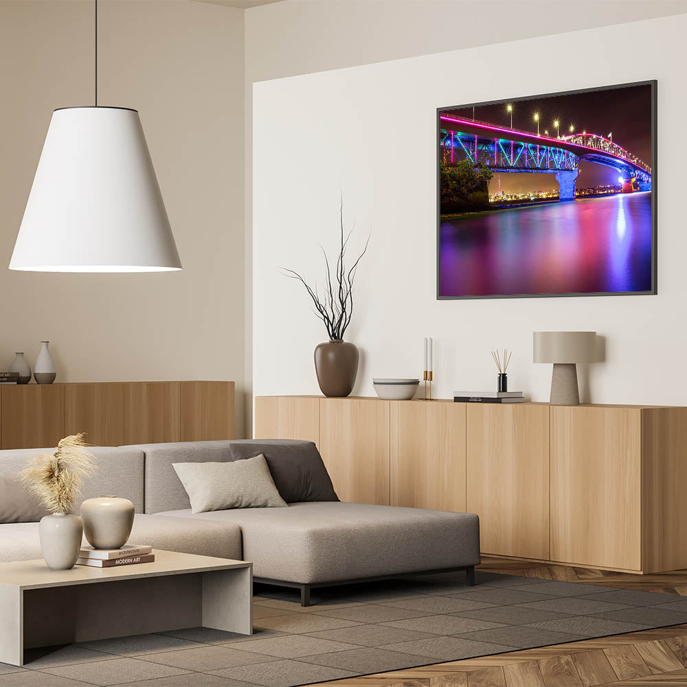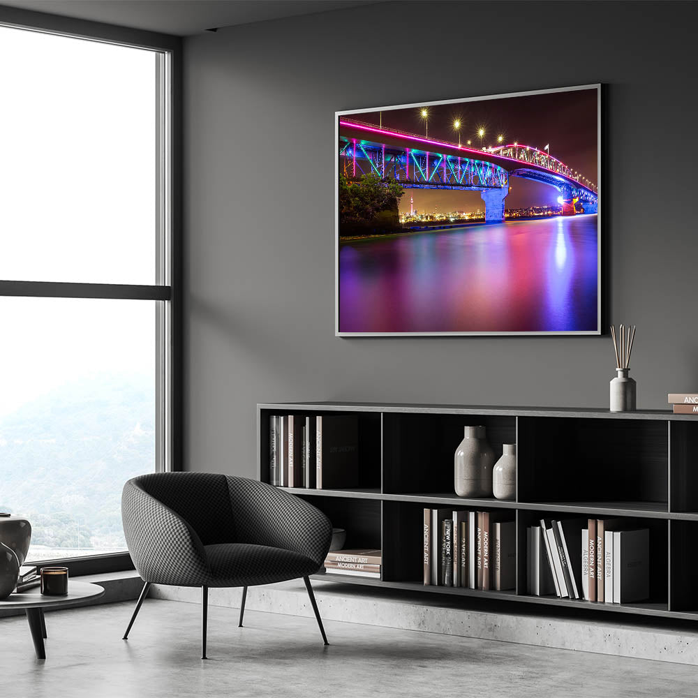 Illuminate your space with the dynamic "Auckland Bridge Night Lights" canvas. This captivating artwork showcases Auckland’s bridge bathed in a spectrum of vibrant colors, with the city skyline twinkling in the backdrop, reflecting its lively urban spirit.