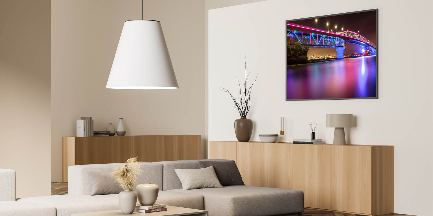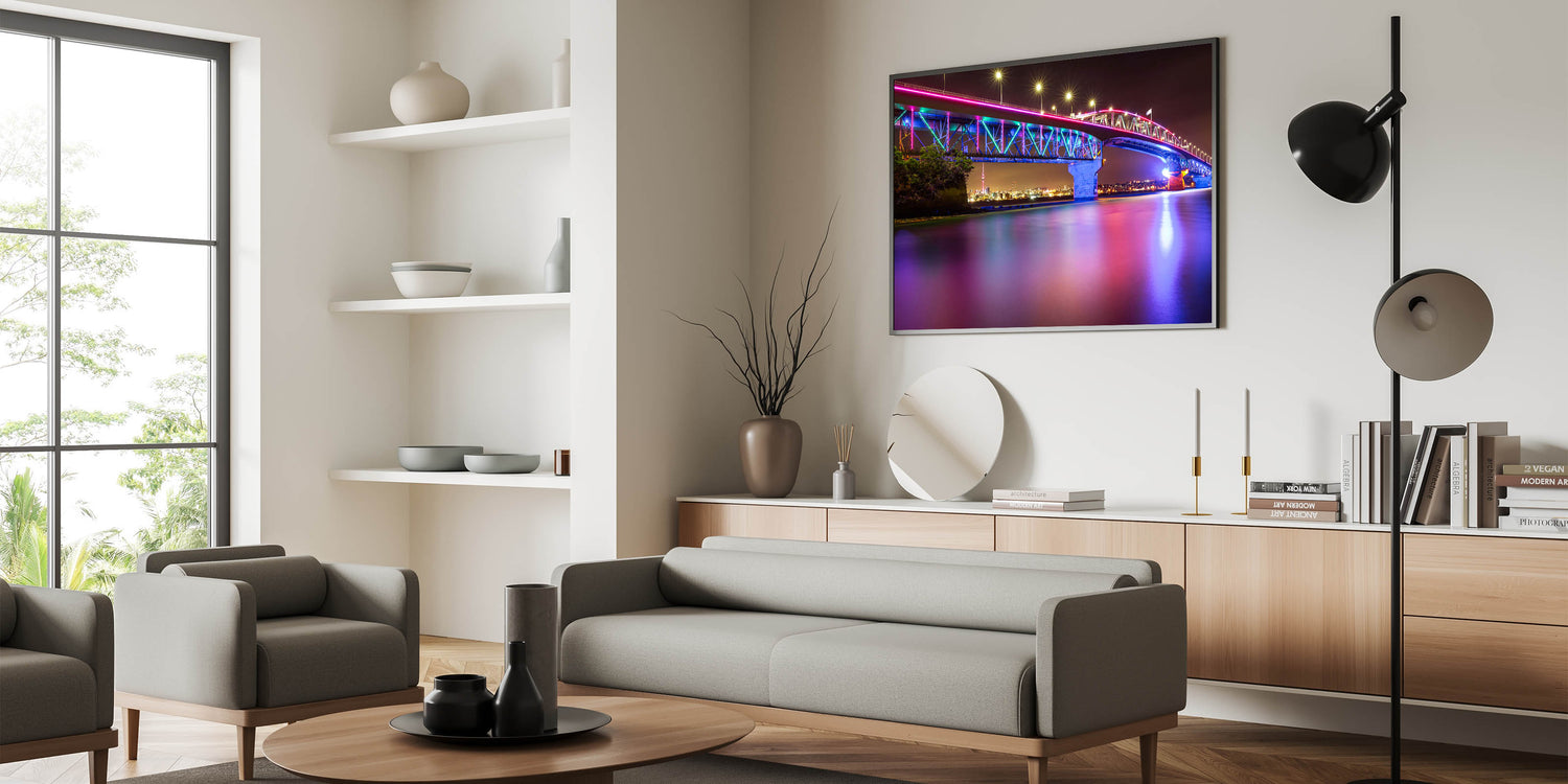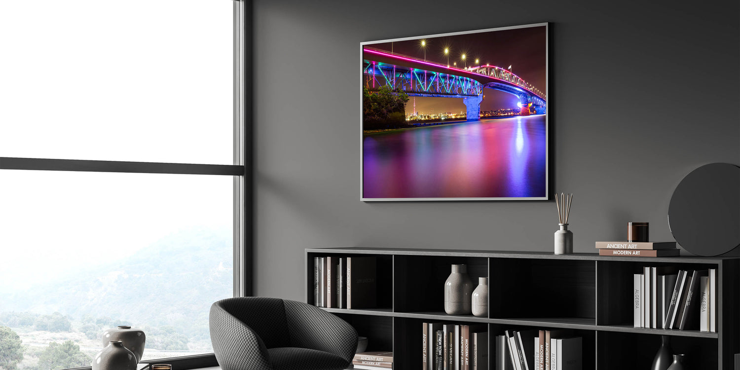 Illuminate your space with the dynamic "Auckland Bridge Night Lights" canvas. This captivating artwork showcases Auckland’s bridge bathed in a spectrum of vibrant colors, with the city skyline twinkling in the backdrop, reflecting its lively urban spirit.