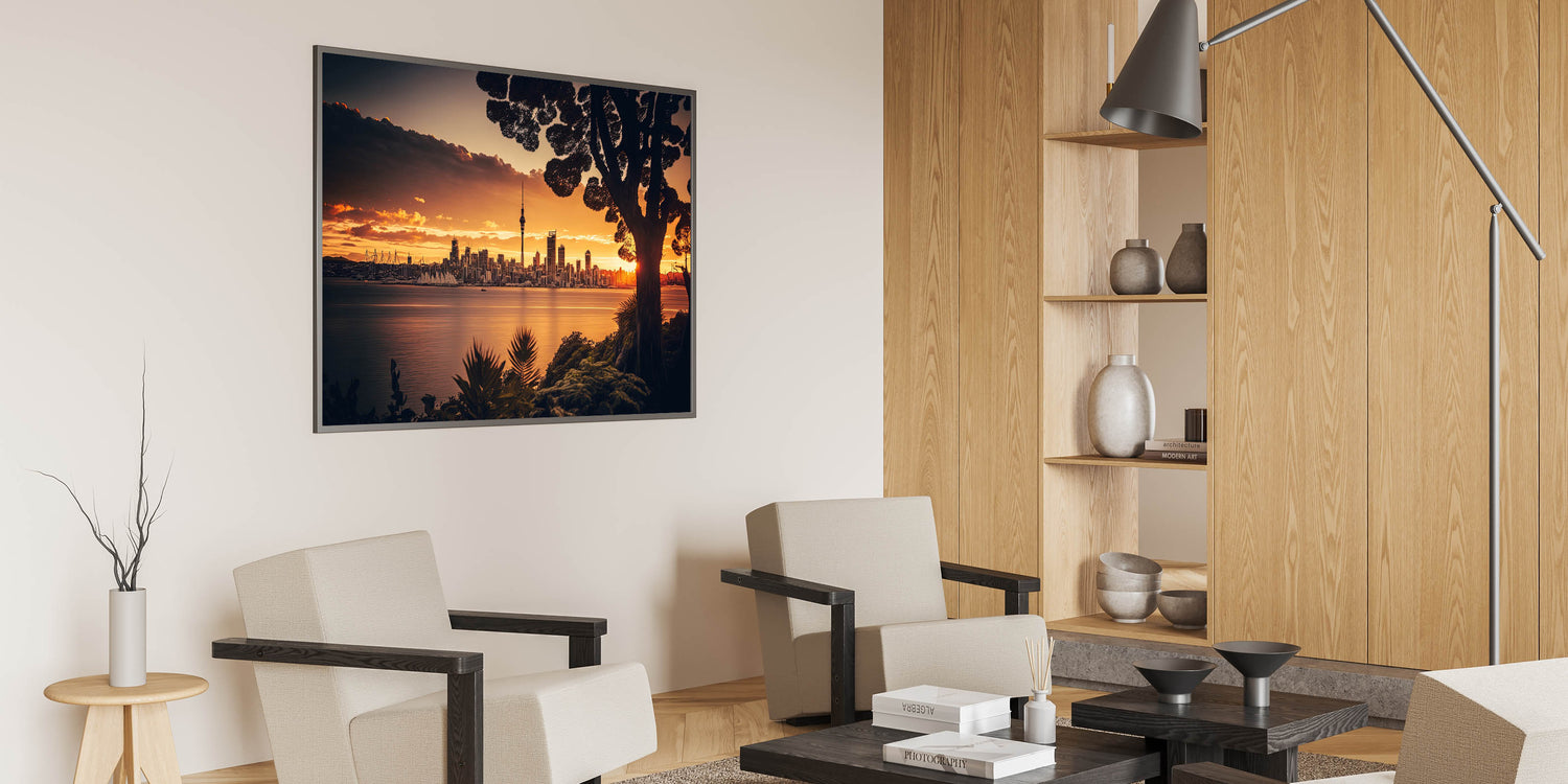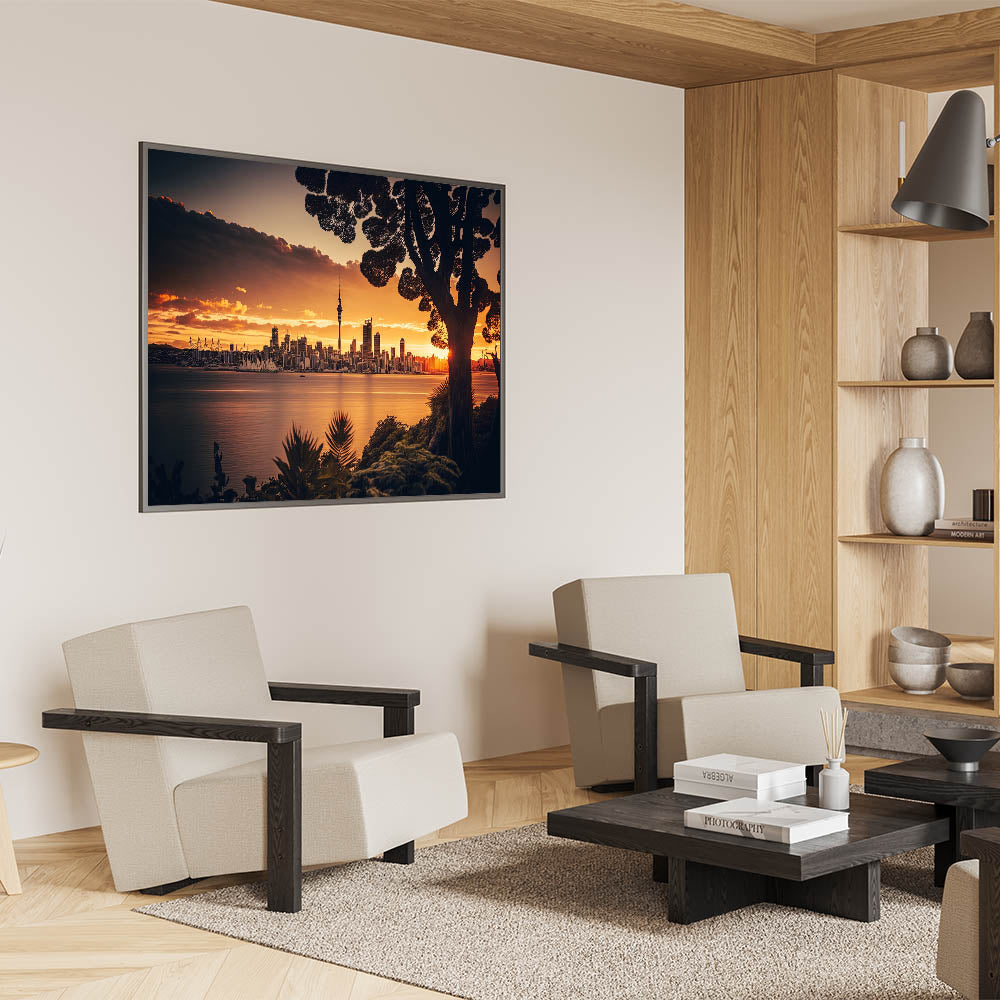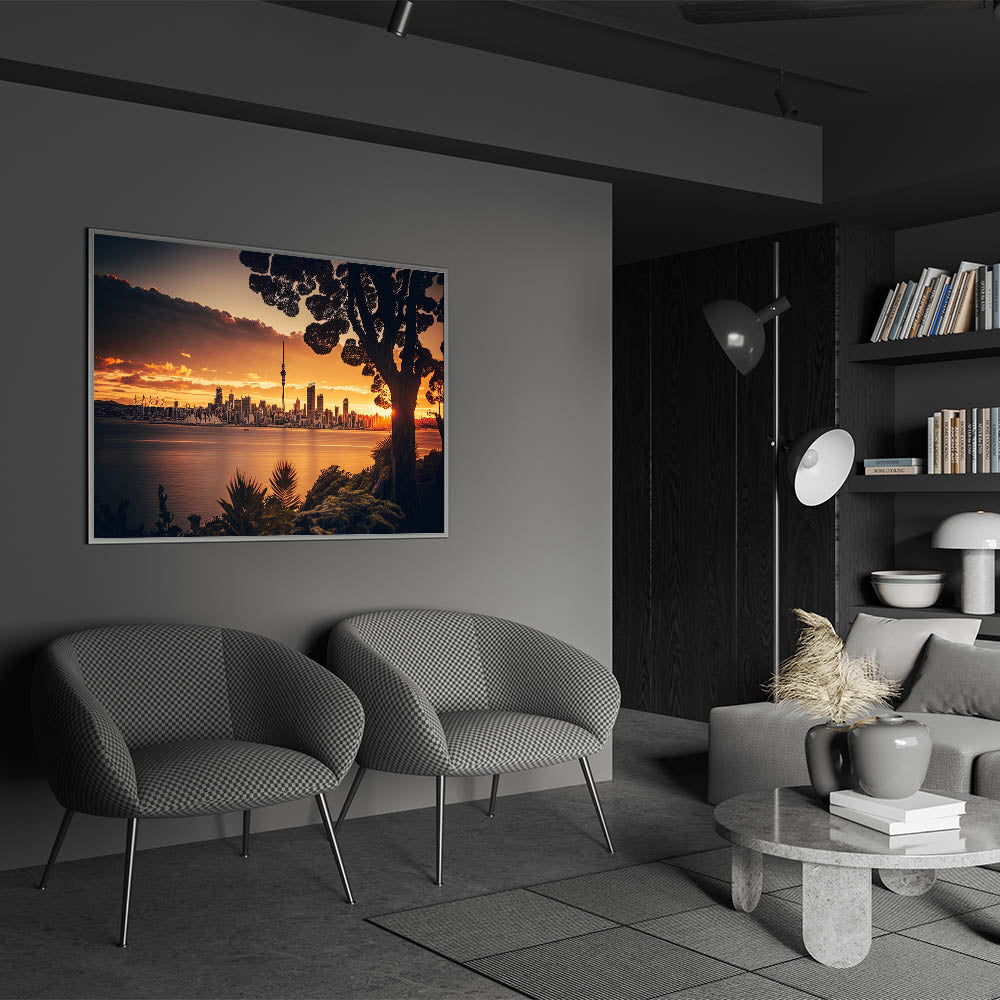 Discover the dynamic skyline of Auckland with our "Auckland Skyline Print," a piece of New Zealand art that captures the city’s architectural beauty at sunset. Framed by nature and bathed in the warm glow of the evening sun, this artwork brings the vibrancy of Auckland's cityscape into your home or office.
