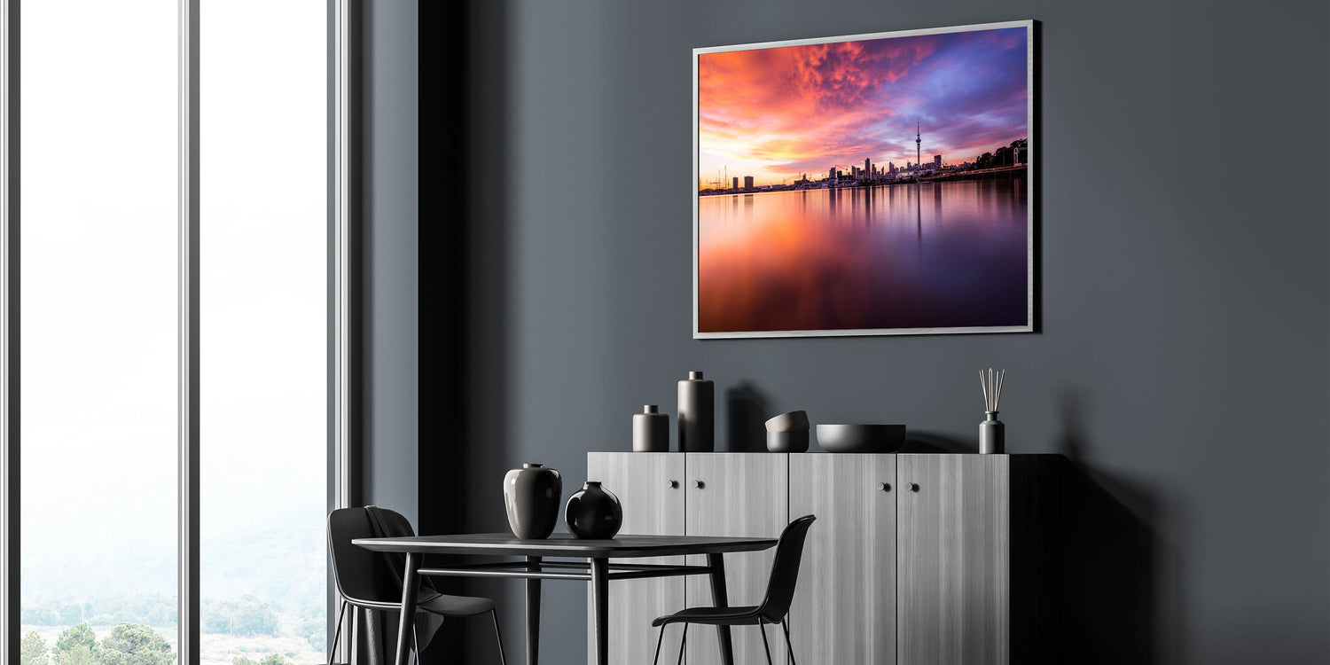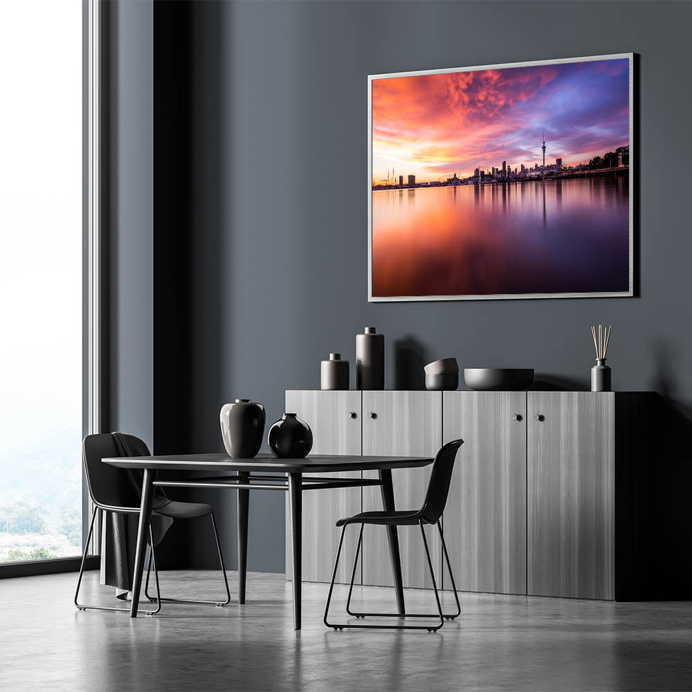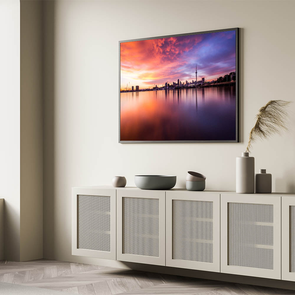 Immerse yourself in the warm embrace of the evening with our "Fiery Sunset Over Auckland" canvas. This piece captures the vibrant and dramatic sunset hues reflecting off the calm waters, with Auckland’s skyline poised majestically in the background.