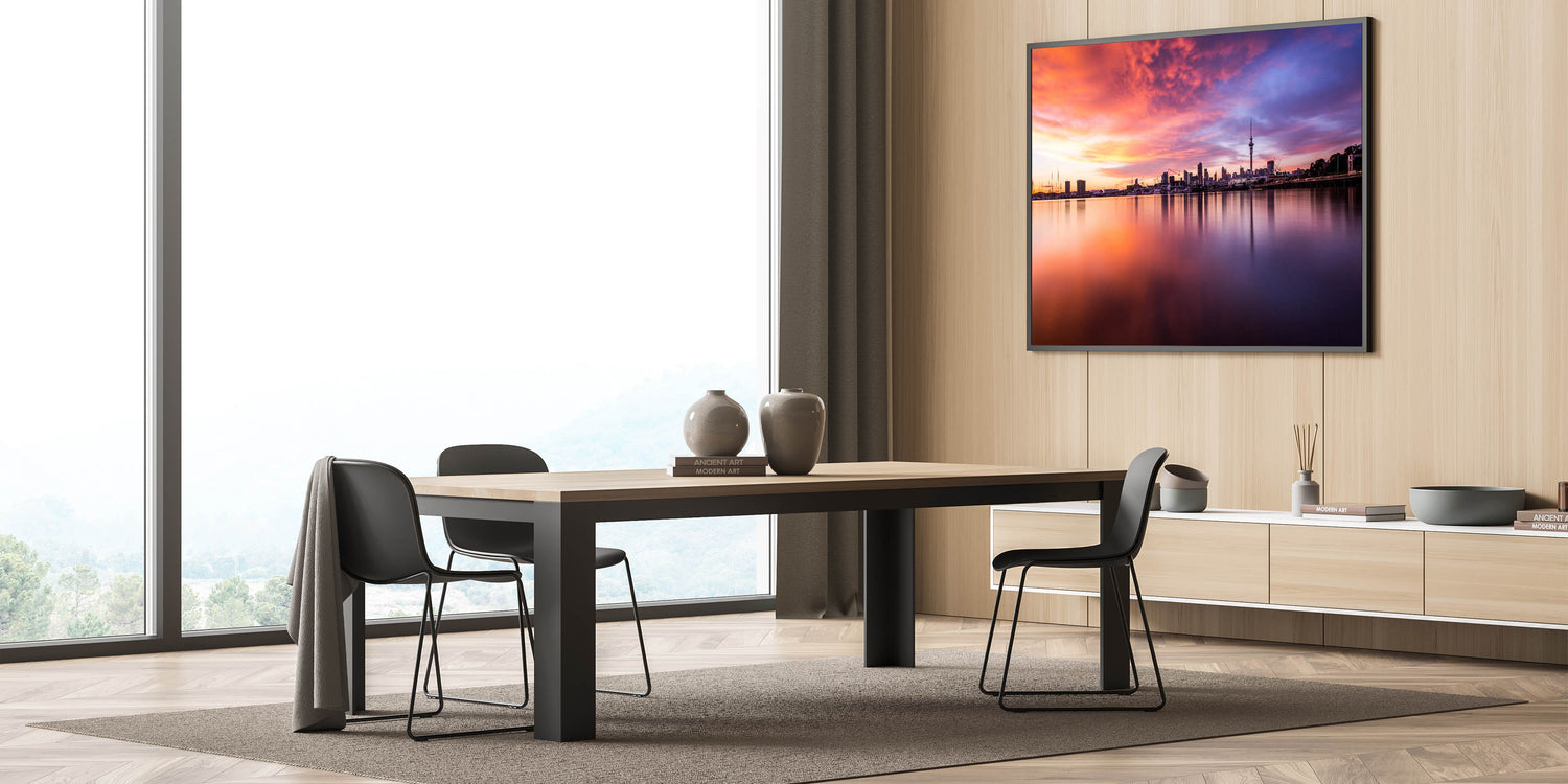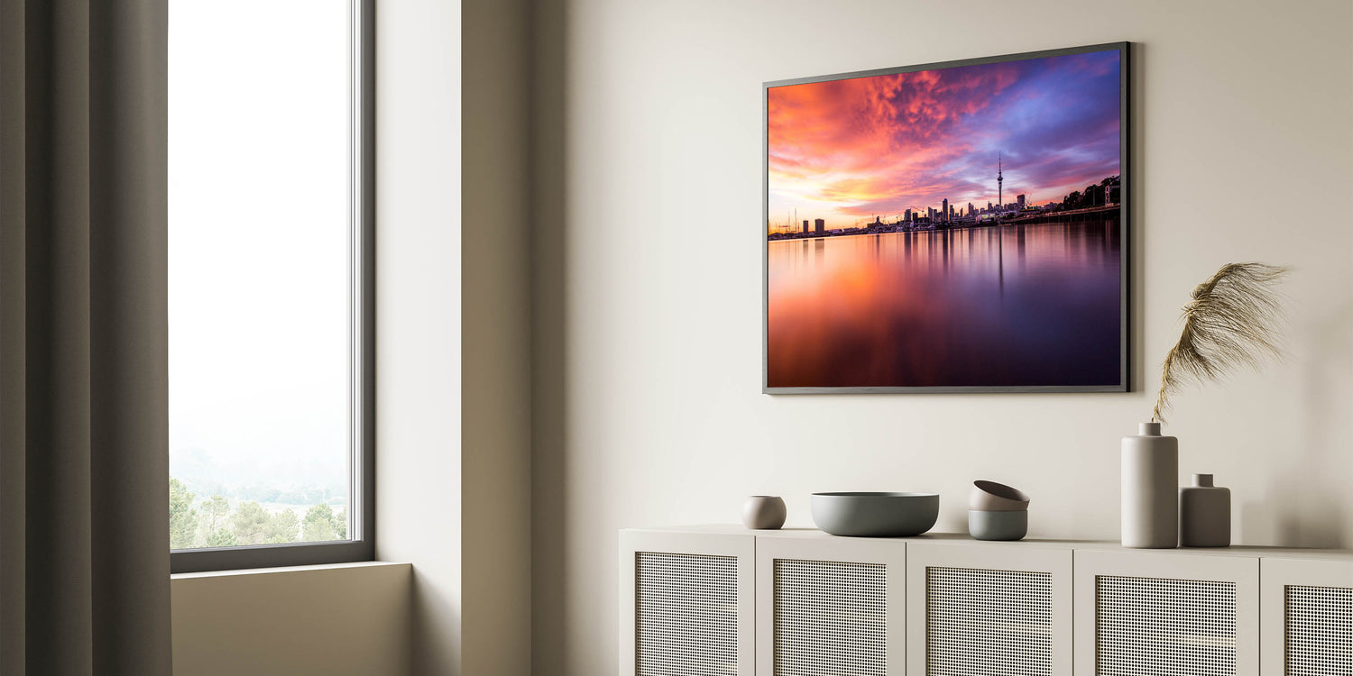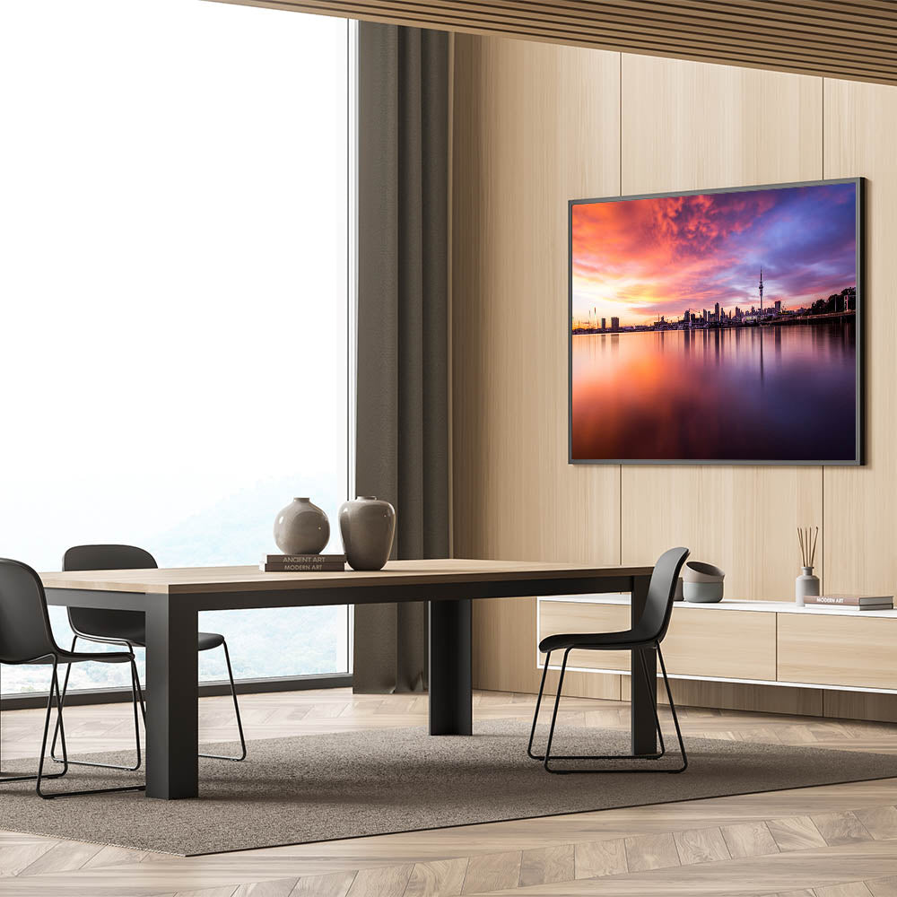 Immerse yourself in the warm embrace of the evening with our "Fiery Sunset Over Auckland" canvas. This piece captures the vibrant and dramatic sunset hues reflecting off the calm waters, with Auckland’s skyline poised majestically in the background.