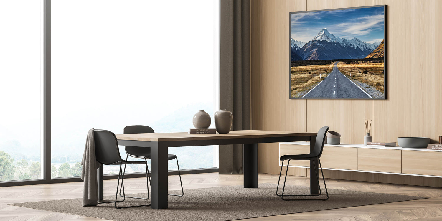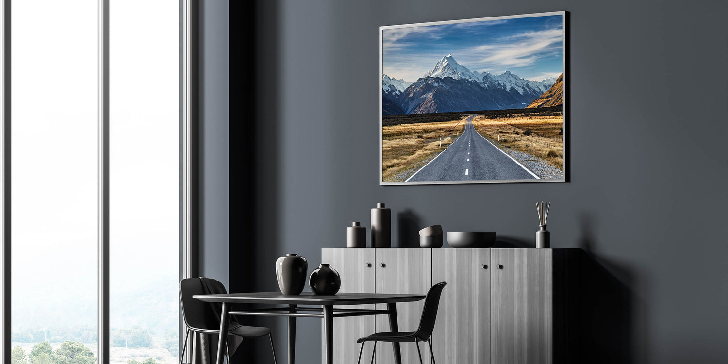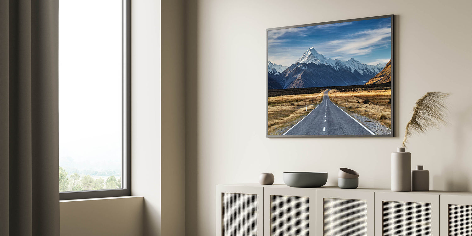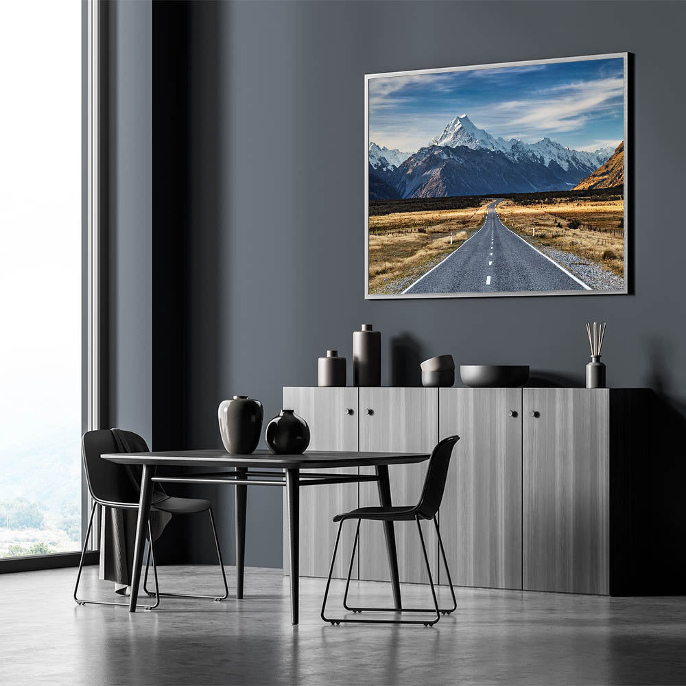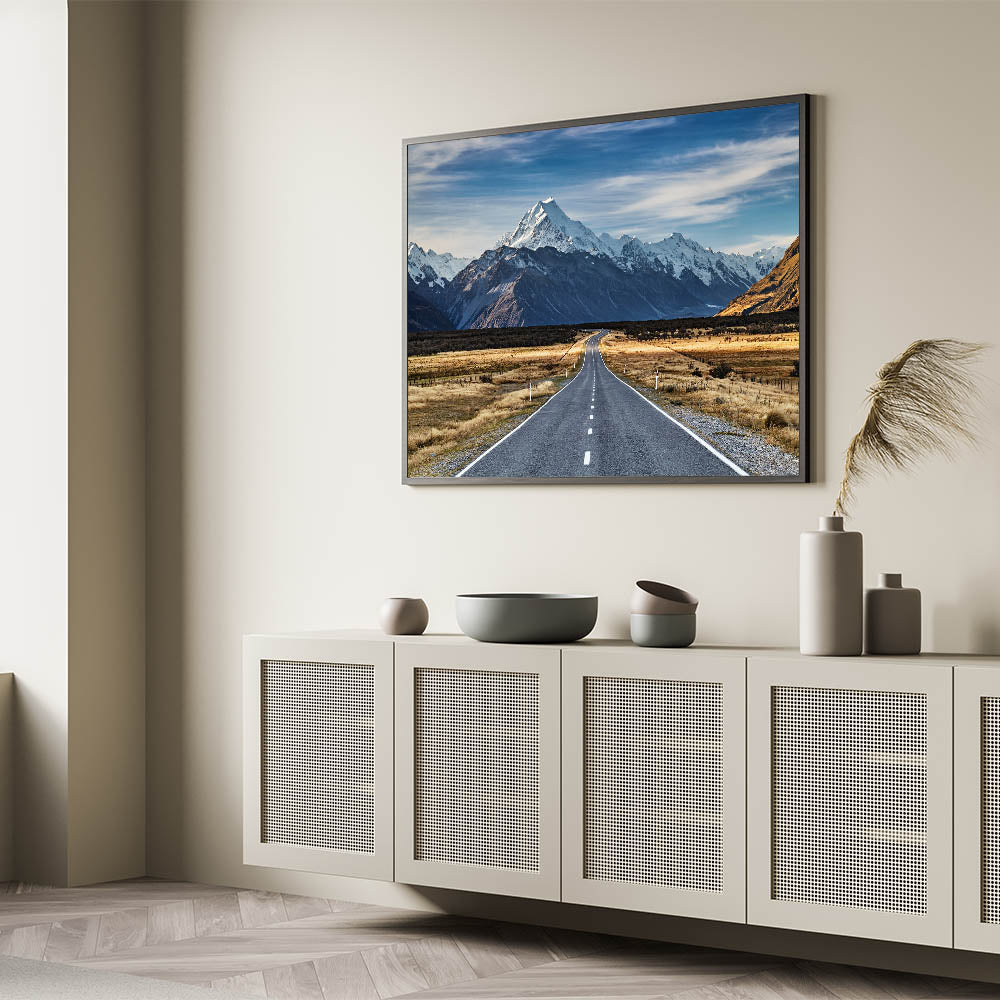 Take the road less traveled with this stunning New Zealand Travel Art print featuring a winding road leading into the heart of Canterbury’s snow-capped mountains. This breathtaking Canterbury Landscape Art captures the vast beauty of New Zealand’s wilderness, with a road that invites you to explore the majestic peaks and open plains. Perfect for nature lovers and travel enthusiasts, this artwork will bring the adventure of New Zealand Nature Wall Decor into your home.