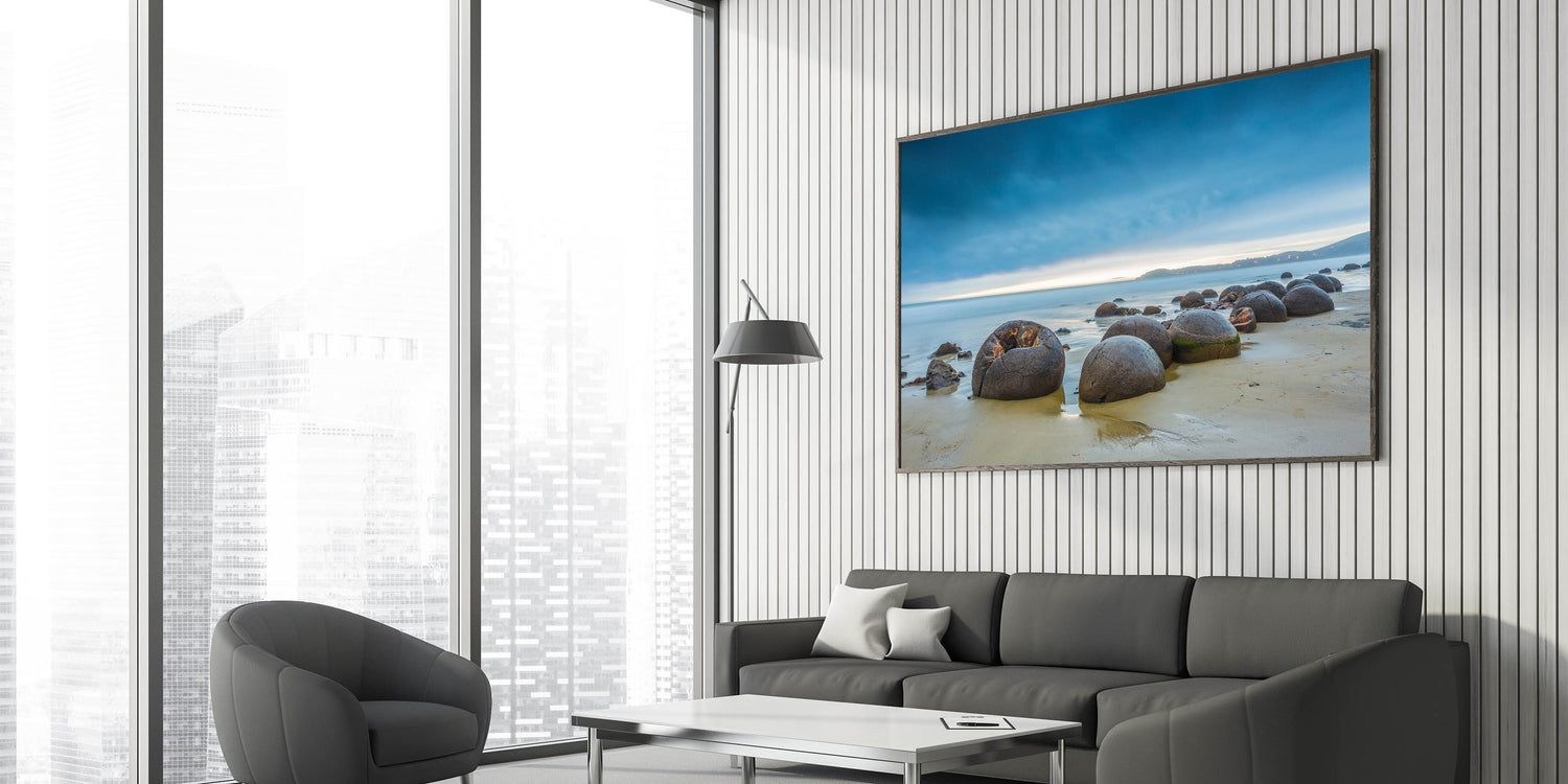 Transform your living space with the unique beauty of the Moeraki Boulders, captured in this breathtaking Otago wall art. This coastal scene highlights the mystical, spherical boulders scattered along the shore, contrasting against the soft blues of the sky and ocean. It's the perfect piece for those who love natural wonders and New Zealand scenery.