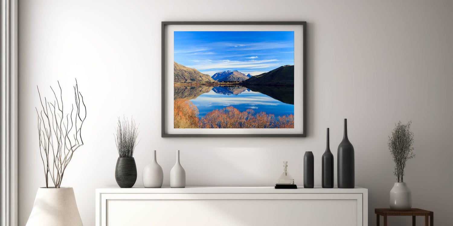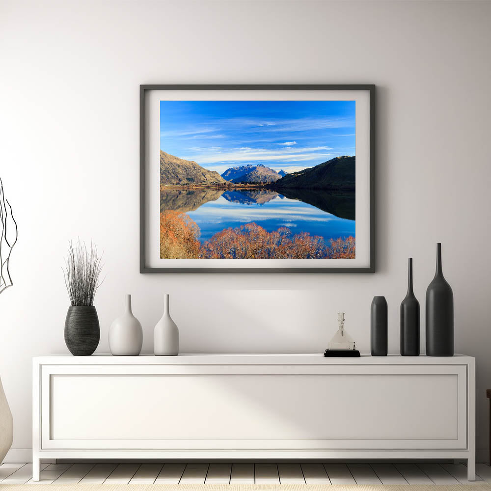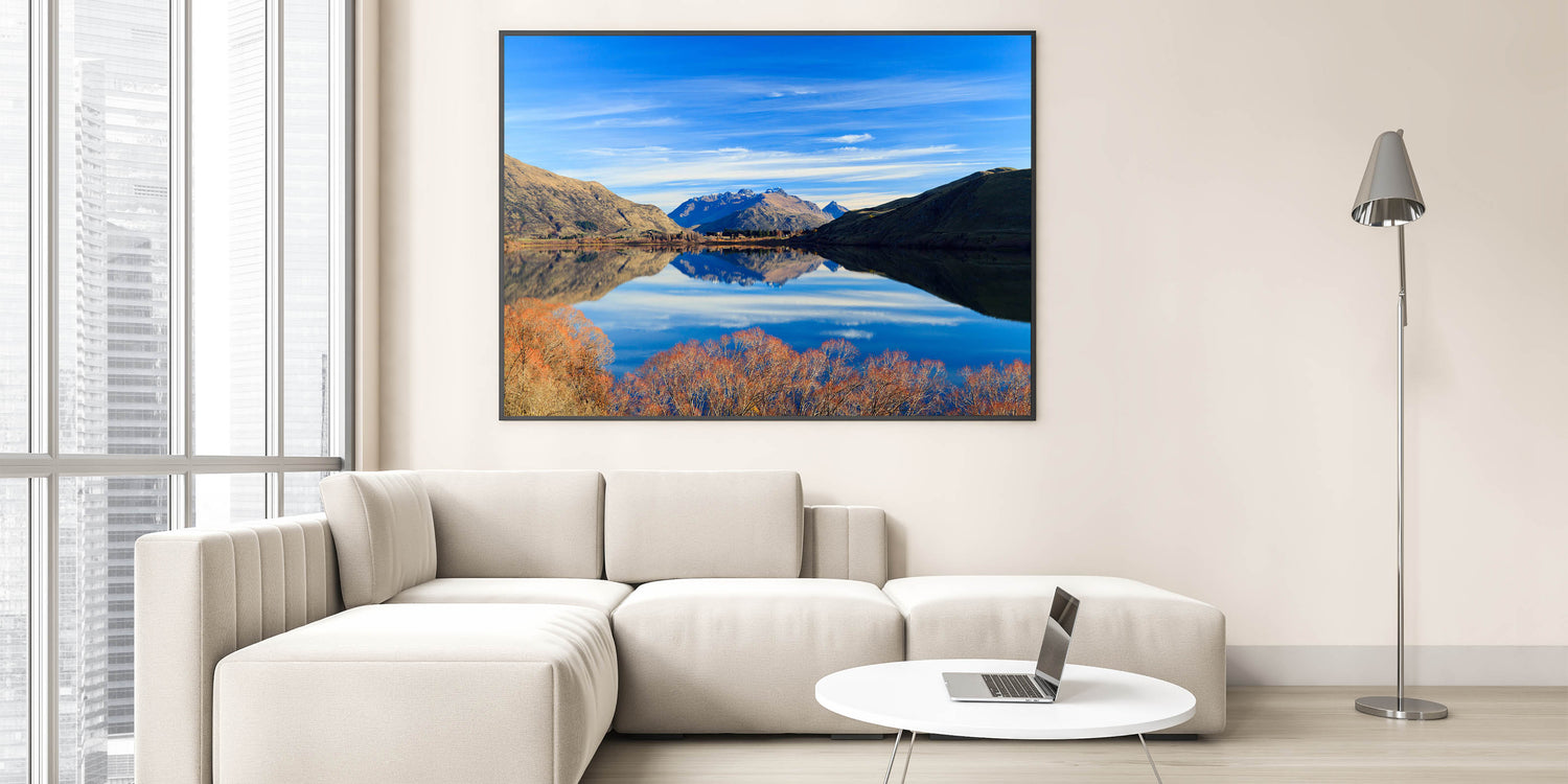 Bring the captivating beauty of Central Otago into your home with this stunning wall art. Featuring a perfectly mirrored reflection of the rolling hills and mountains in a calm lake, this artwork captures the serene and breathtaking landscapes of New Zealand. The clear blue sky and warm autumn colors from the trees create a striking contrast that will enhance any living space.