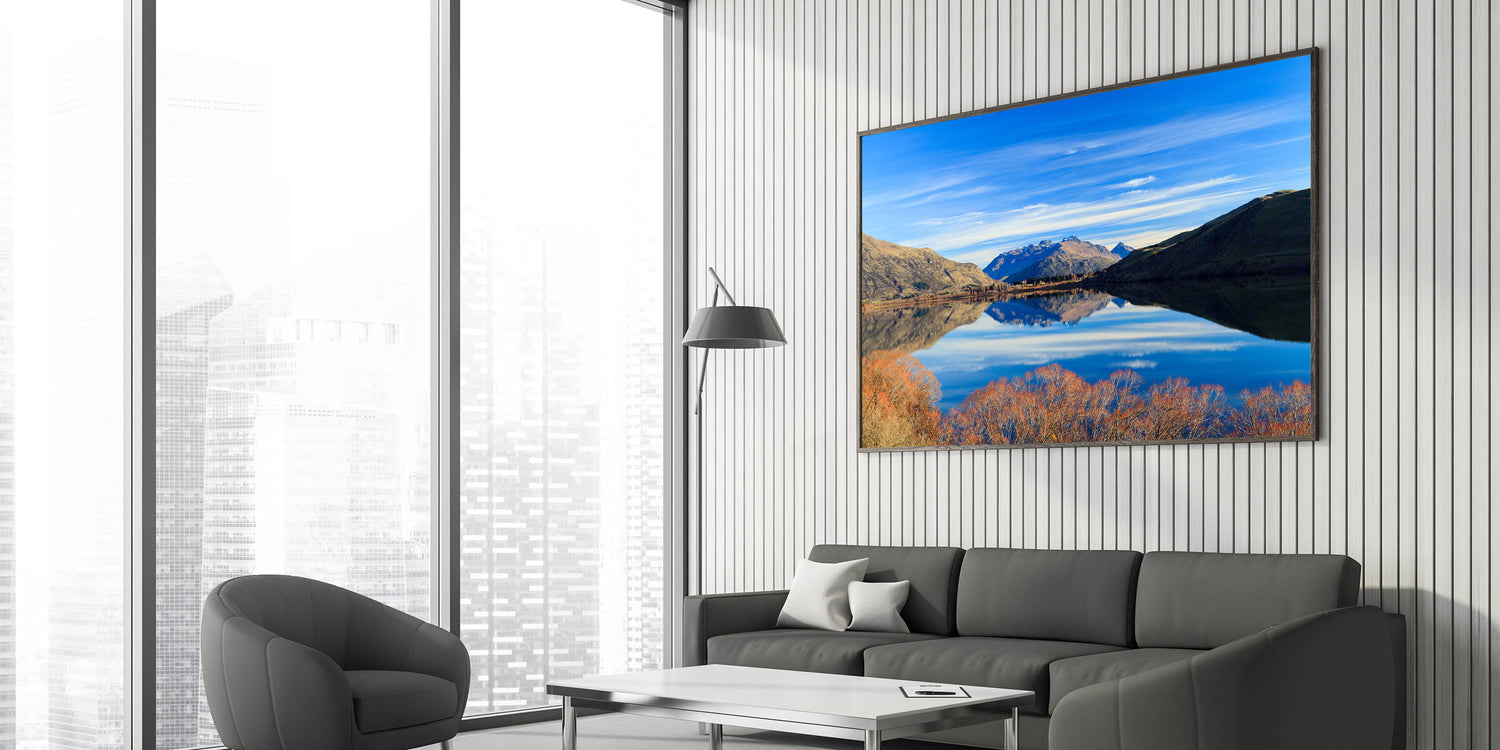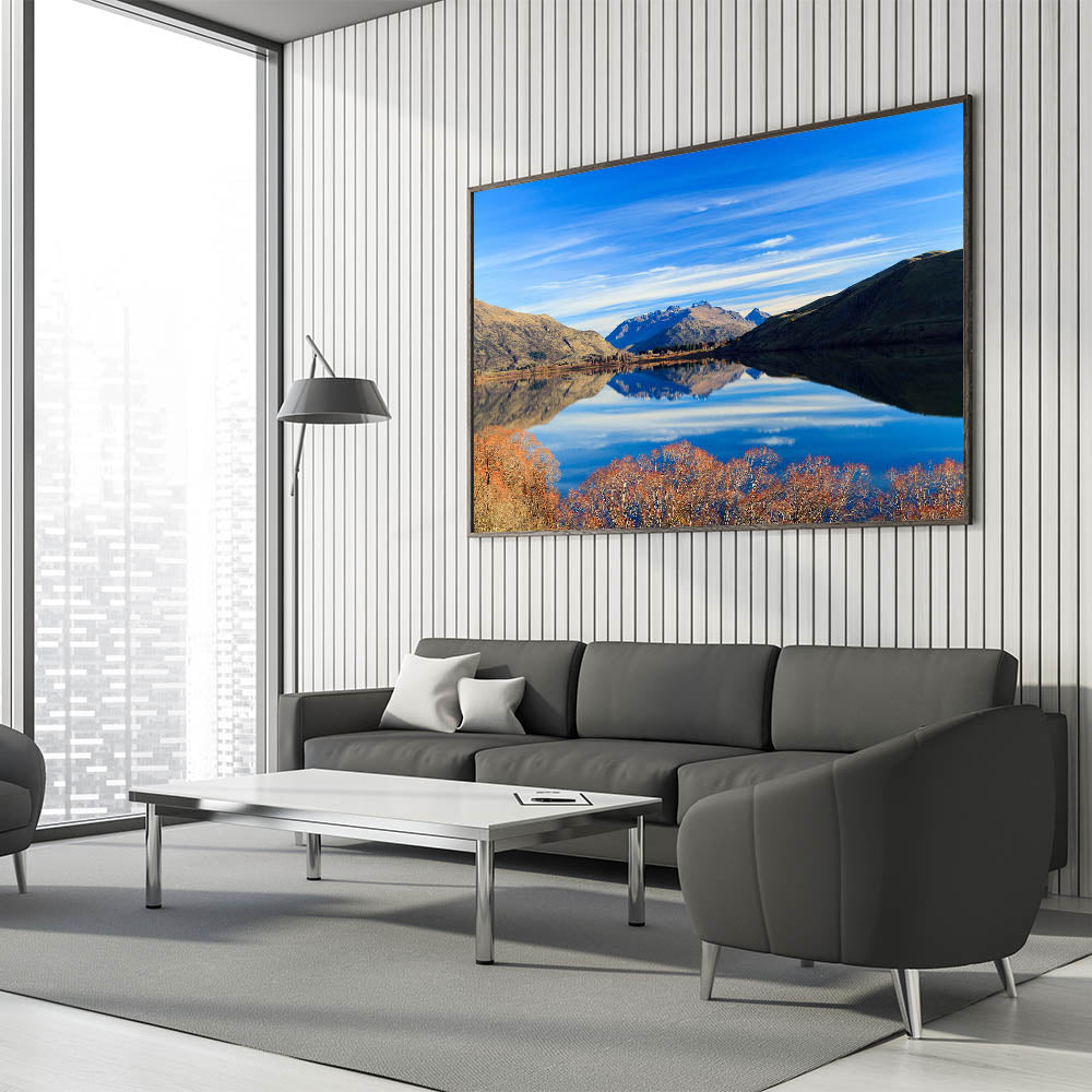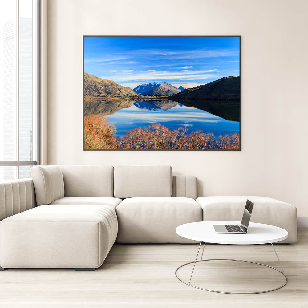Bring the captivating beauty of Central Otago into your home with this stunning wall art. Featuring a perfectly mirrored reflection of the rolling hills and mountains in a calm lake, this artwork captures the serene and breathtaking landscapes of New Zealand. The clear blue sky and warm autumn colors from the trees create a striking contrast that will enhance any living space.