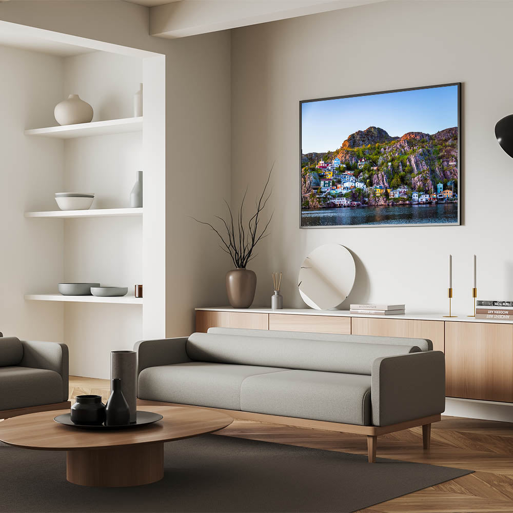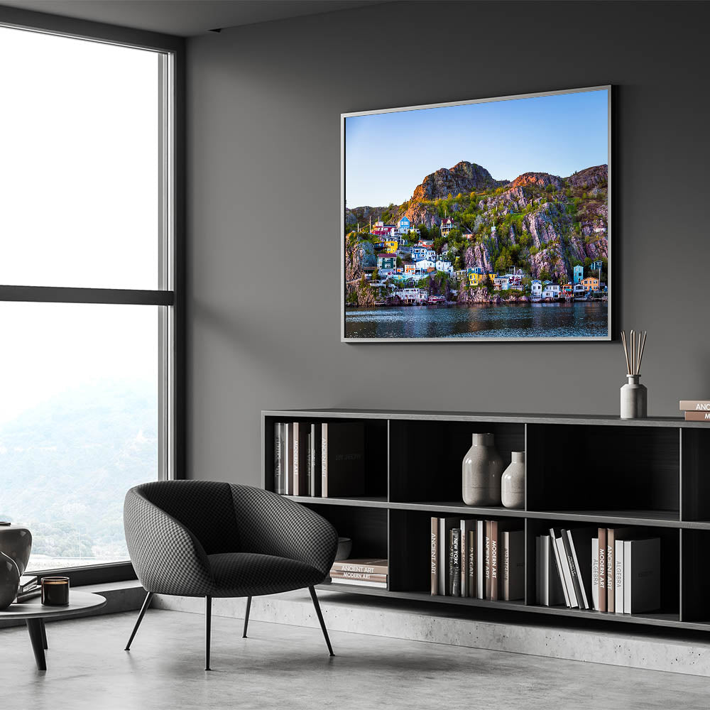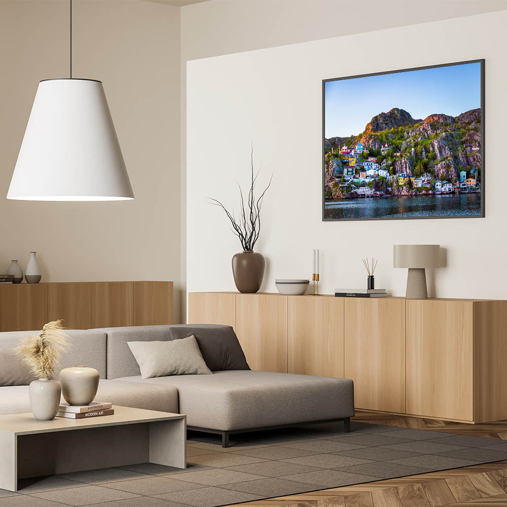 Bring the lively charm of Newfoundland’s coastal villages into your home with this vibrant sunset wall art. This piece features colorful houses nestled on the rocky cliffs, illuminated by the warm glow of the setting sun. The dramatic contrast of the bright homes against the rugged landscape and calm waters makes this artwork an eye-catching addition to any space, perfect for those who love coastal scenes.