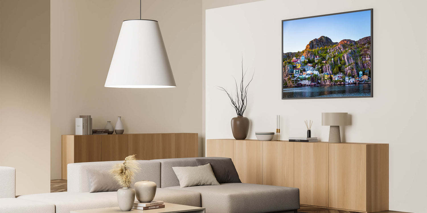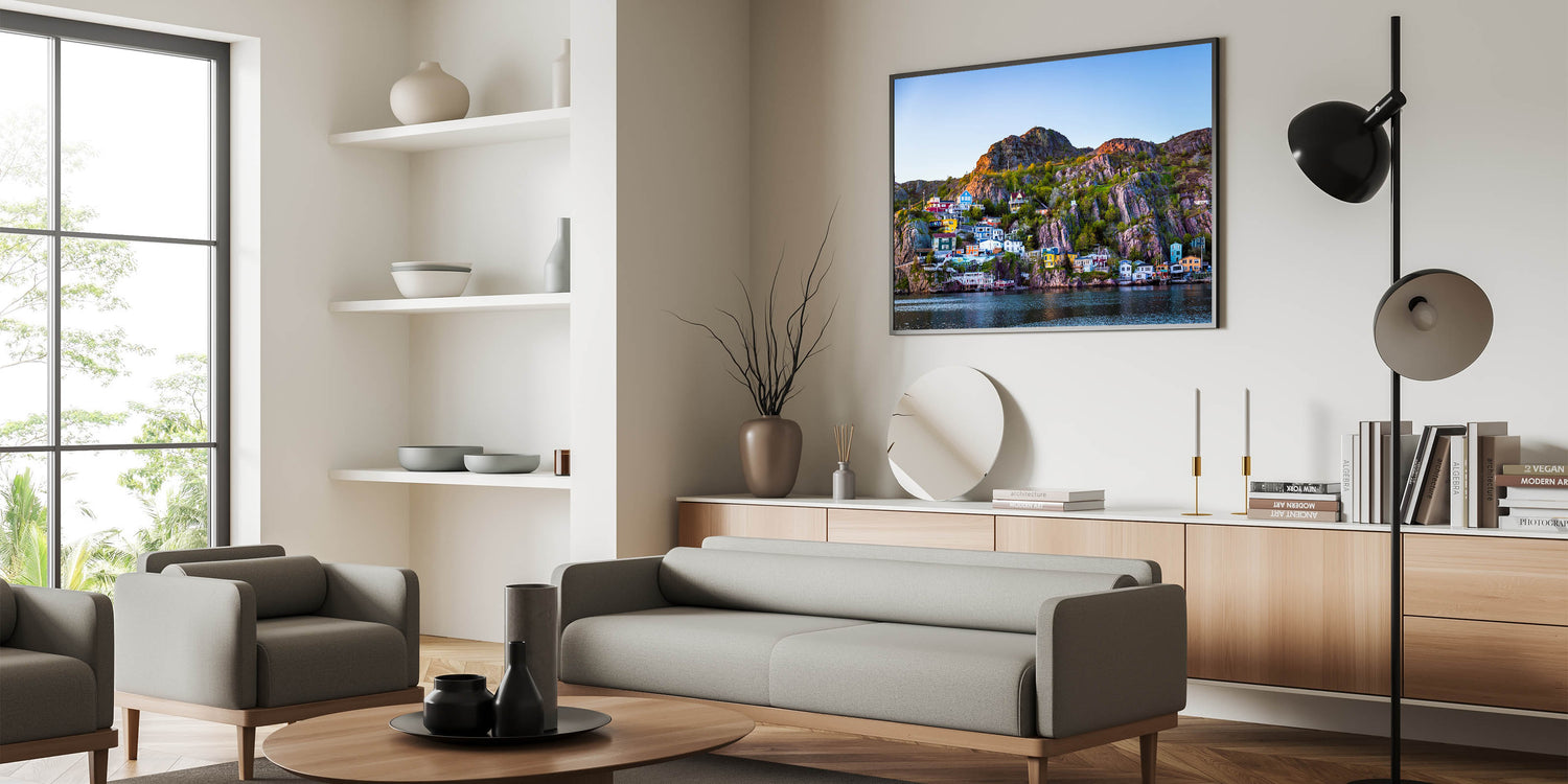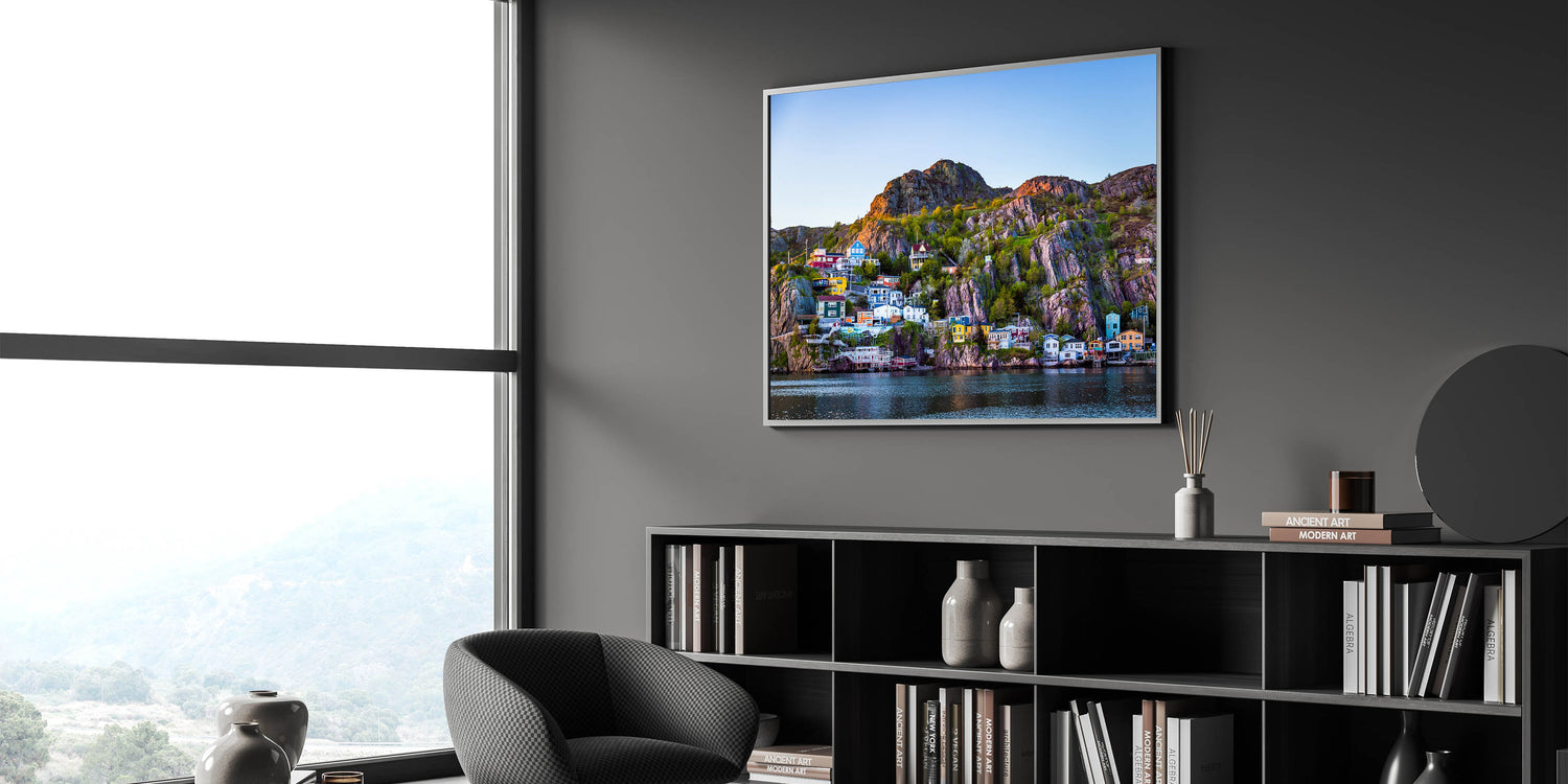 Bring the lively charm of Newfoundland’s coastal villages into your home with this vibrant sunset wall art. This piece features colorful houses nestled on the rocky cliffs, illuminated by the warm glow of the setting sun. The dramatic contrast of the bright homes against the rugged landscape and calm waters makes this artwork an eye-catching addition to any space, perfect for those who love coastal scenes.