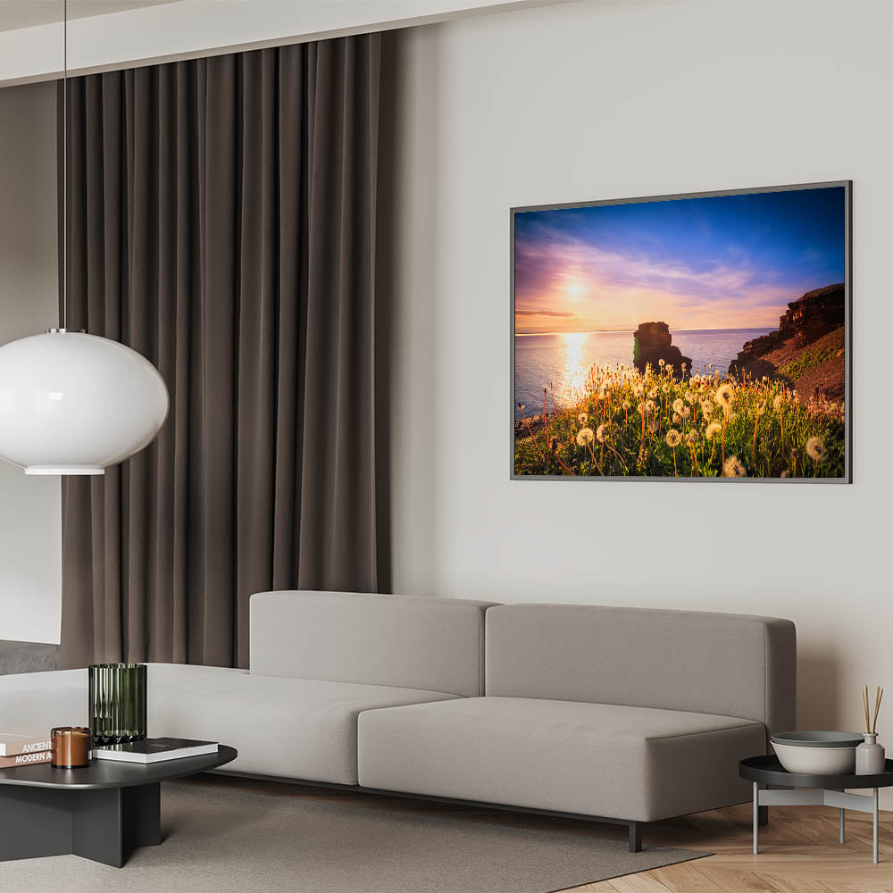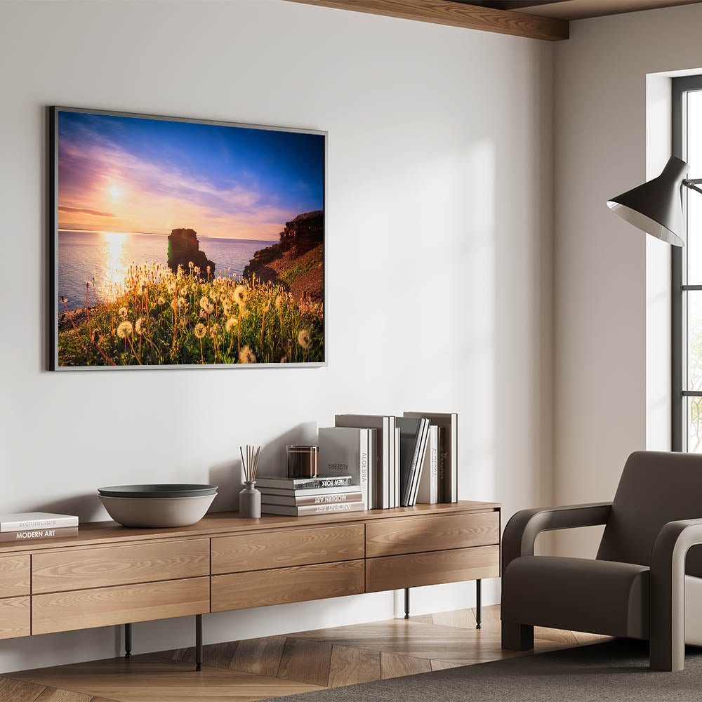 Experience the golden beauty of Newfoundland’s coastline with this stunning sunset wall art. The warm hues of the setting sun bathe the cliffs and dandelions in a soft, glowing light, creating a peaceful and mesmerizing view. This artwork perfectly captures the tranquility of Atlantic Canada and is ideal for those looking to add a touch of nature’s beauty to their decor.