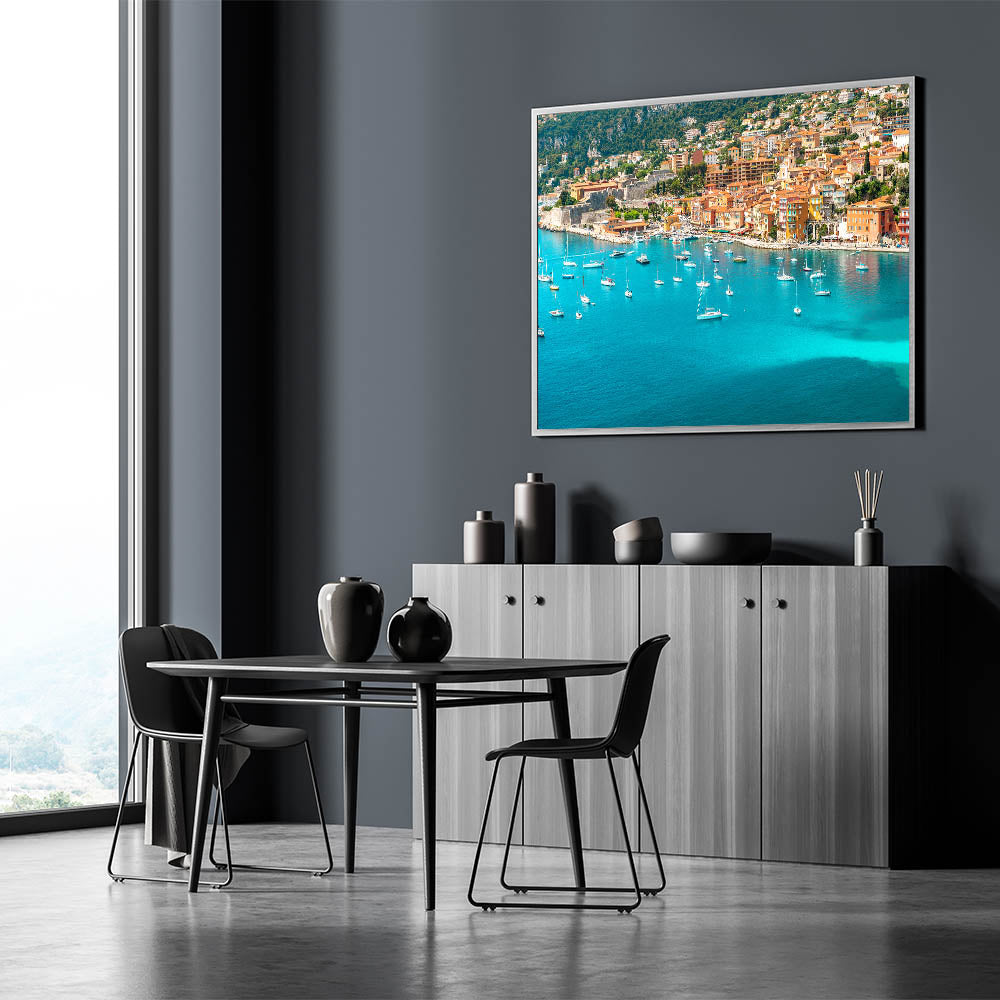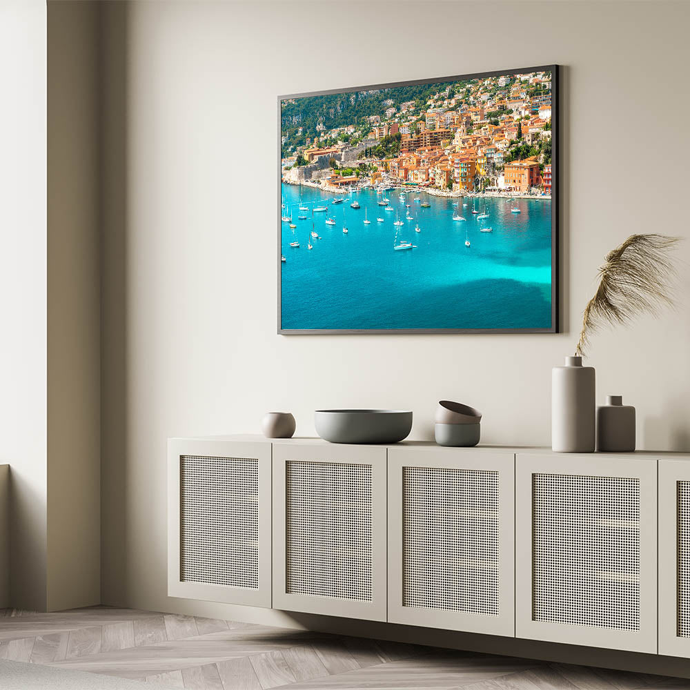 Add a touch of Mediterranean charm to your space with this vibrant Nice Cityscape Art. This stunning wall art captures a beautiful harbor view of the French Riviera, where the clear turquoise waters meet the rich, earthy tones of the coastal town's architecture. The tranquil sailboats floating in the bay and the colorful buildings nestled against the hillside create a serene and picturesque scene. This Scenic French Riviera Wall Art is a perfect representation of the peaceful coastal life of Nice, France.