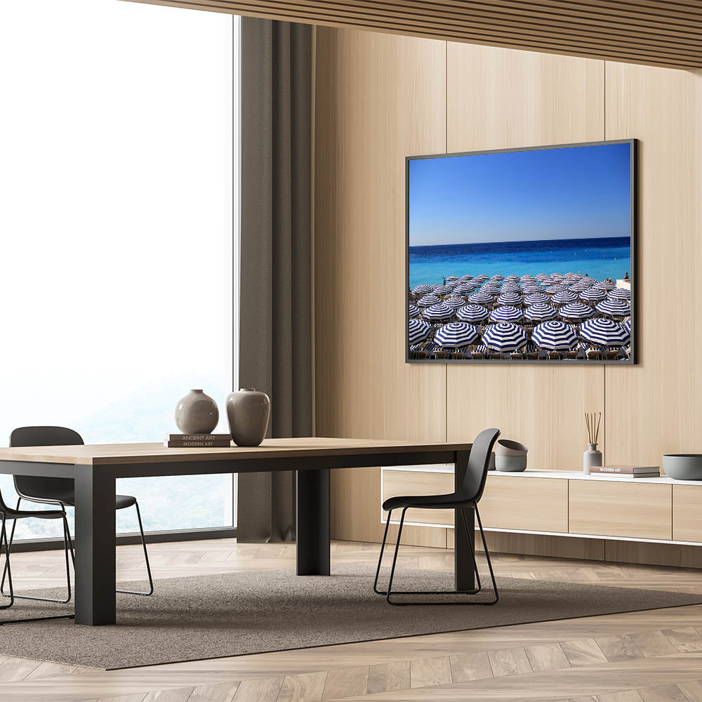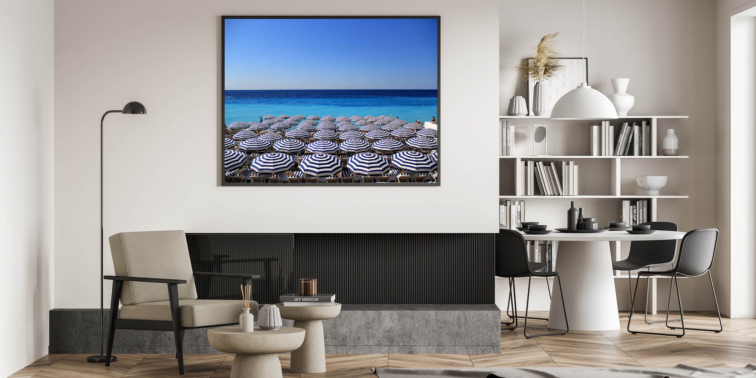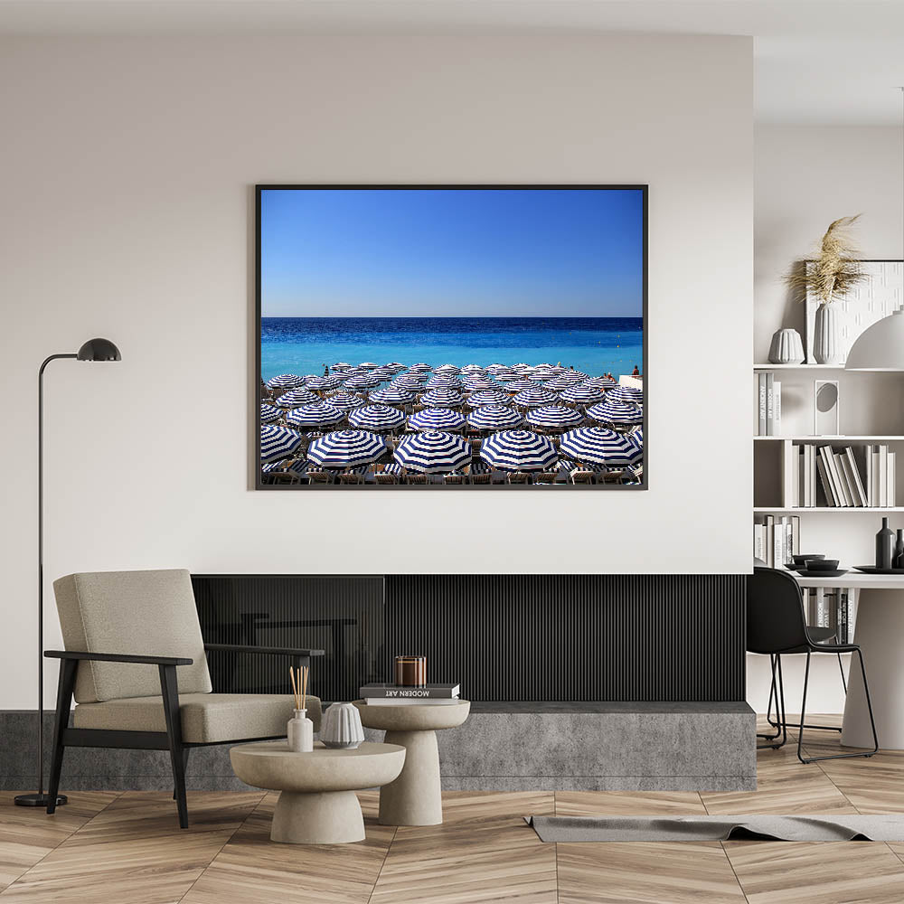 Add a touch of the Mediterranean’s charm to your space with this vibrant Nice France Wall Decor. This artwork captures a serene view of the Mediterranean Sea lined with perfectly arranged blue-and-white striped beach umbrellas. The clear, bright blue sky and the shimmering waters of the coast make this Scenic Nice Canvas an inviting piece for anyone who loves the laid-back lifestyle of the French Riviera. Whether you're decorating a beach house or want to bring a sense of summer into your home, this art piece adds a splash of coastal elegance to any room.