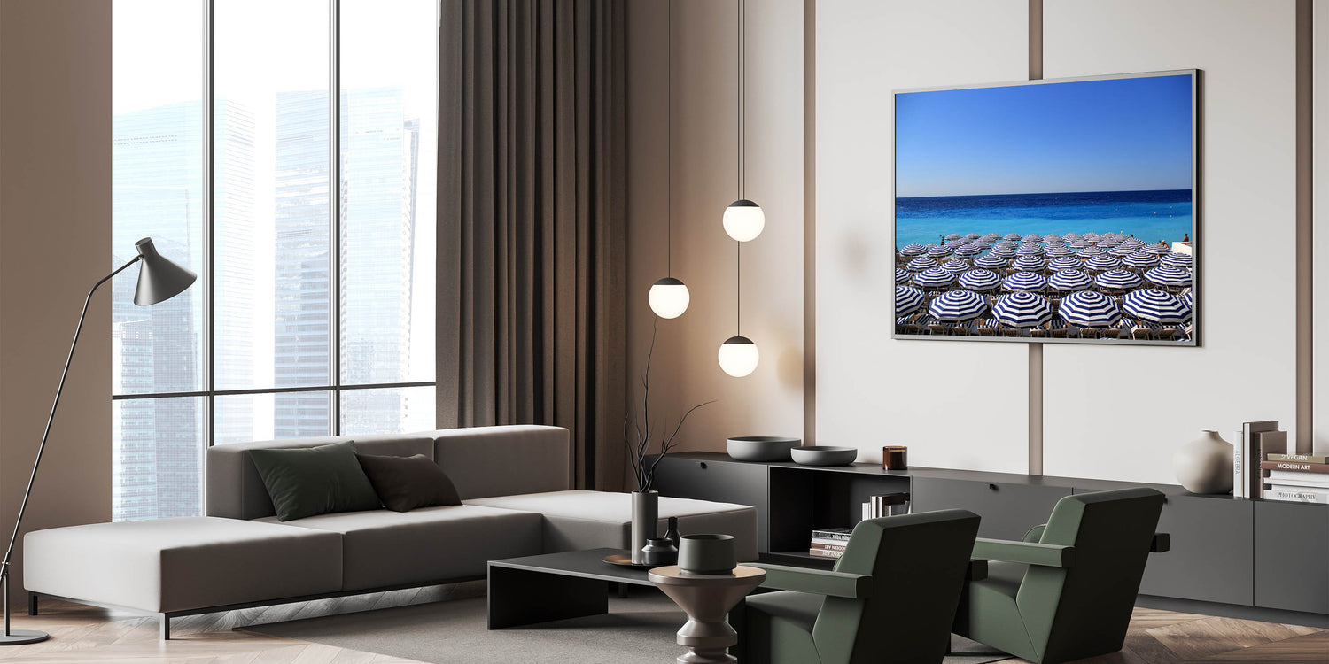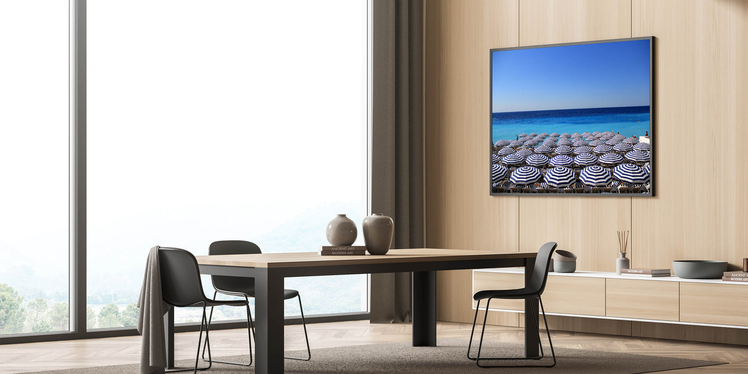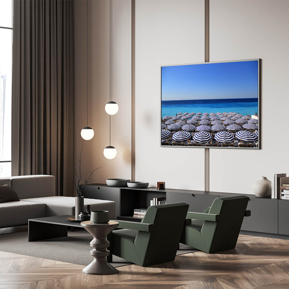 Add a touch of the Mediterranean’s charm to your space with this vibrant Nice France Wall Decor. This artwork captures a serene view of the Mediterranean Sea lined with perfectly arranged blue-and-white striped beach umbrellas. The clear, bright blue sky and the shimmering waters of the coast make this Scenic Nice Canvas an inviting piece for anyone who loves the laid-back lifestyle of the French Riviera. Whether you're decorating a beach house or want to bring a sense of summer into your home, this art piece adds a splash of coastal elegance to any room.