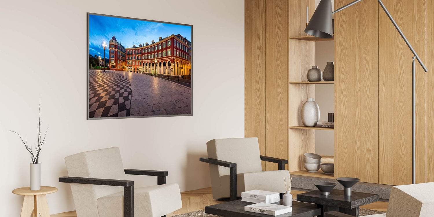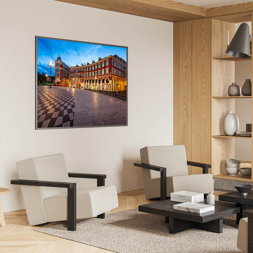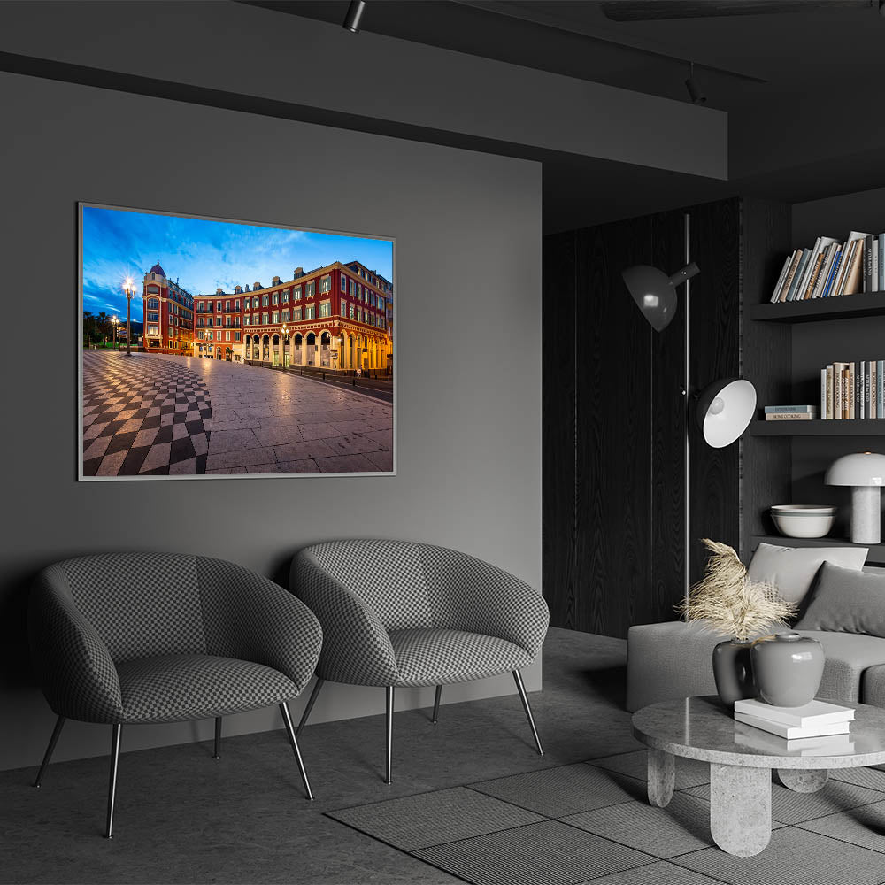 Capture the elegance and architectural beauty of Nice, France, with this striking Nice Landmark Art. This artwork showcases the stunning city square at dusk, where the vibrant colors of the buildings and the atmospheric lighting reflect the charm of the French Riviera. The black-and-white patterned tiles on the square add a touch of sophistication to the scene, making this Nice City Landscape Print perfect for adding a modern yet classic look to any room.