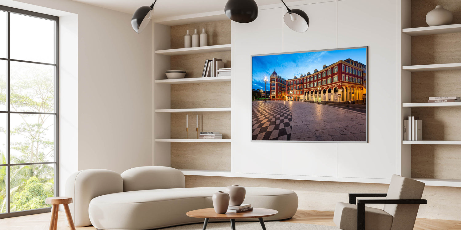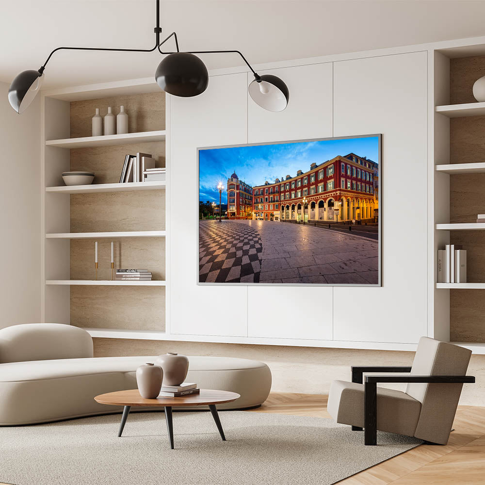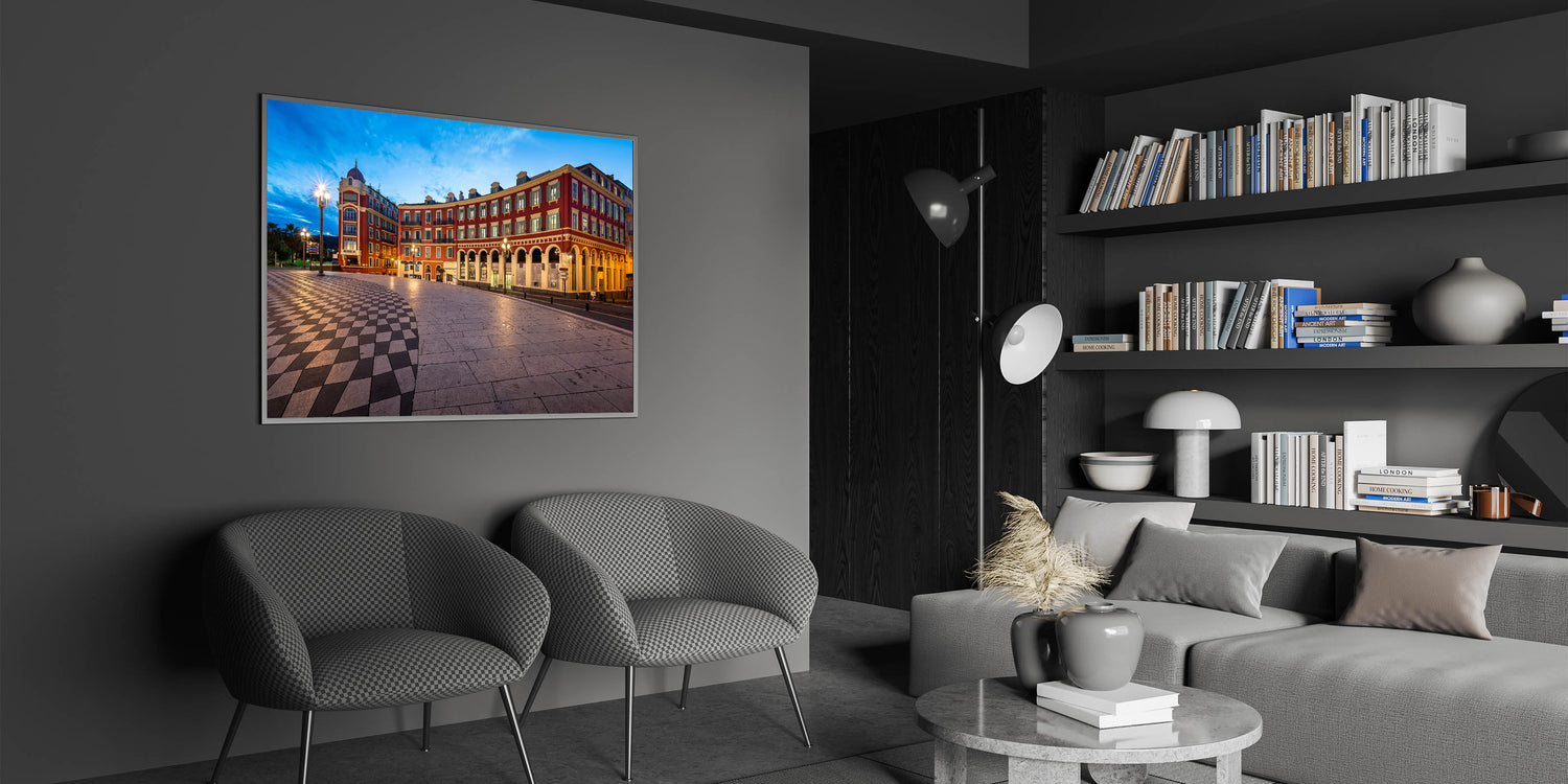 Capture the elegance and architectural beauty of Nice, France, with this striking Nice Landmark Art. This artwork showcases the stunning city square at dusk, where the vibrant colors of the buildings and the atmospheric lighting reflect the charm of the French Riviera. The black-and-white patterned tiles on the square add a touch of sophistication to the scene, making this Nice City Landscape Print perfect for adding a modern yet classic look to any room.