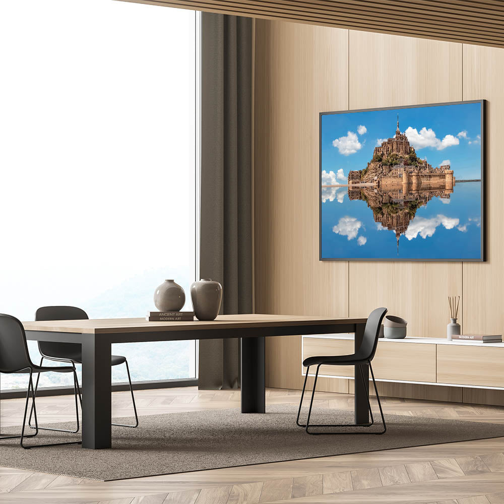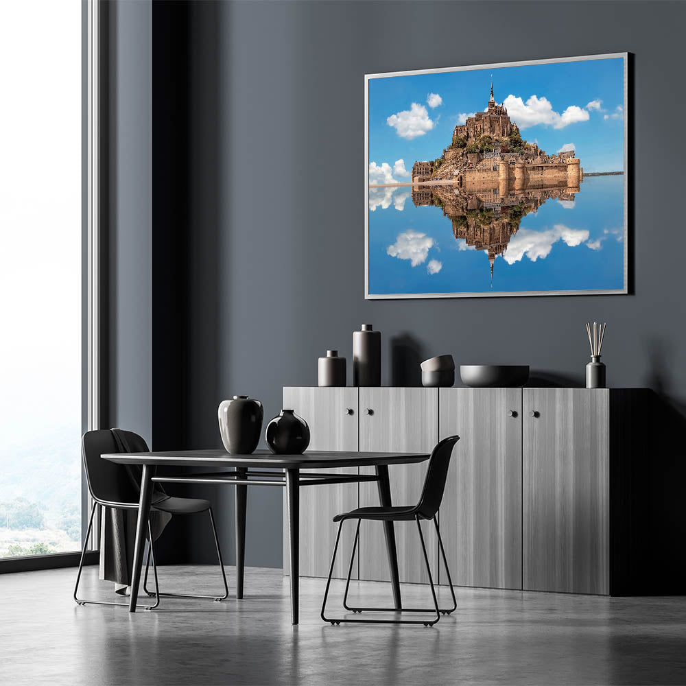 Immerse yourself in the stunning beauty of Mont Saint-Michel with this breathtaking canvas art. The iconic medieval abbey is reflected in the tranquil waters below, creating a striking mirror image that captures the grandeur and elegance of this famous Normandy landmark. This artwork brings the timeless charm of French history and architecture into your home, making it an ideal piece for any room.